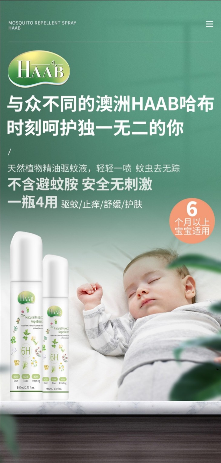 现货~HAAB哈布草本植物精油防蚊虫叮咬喷雾80ml*3