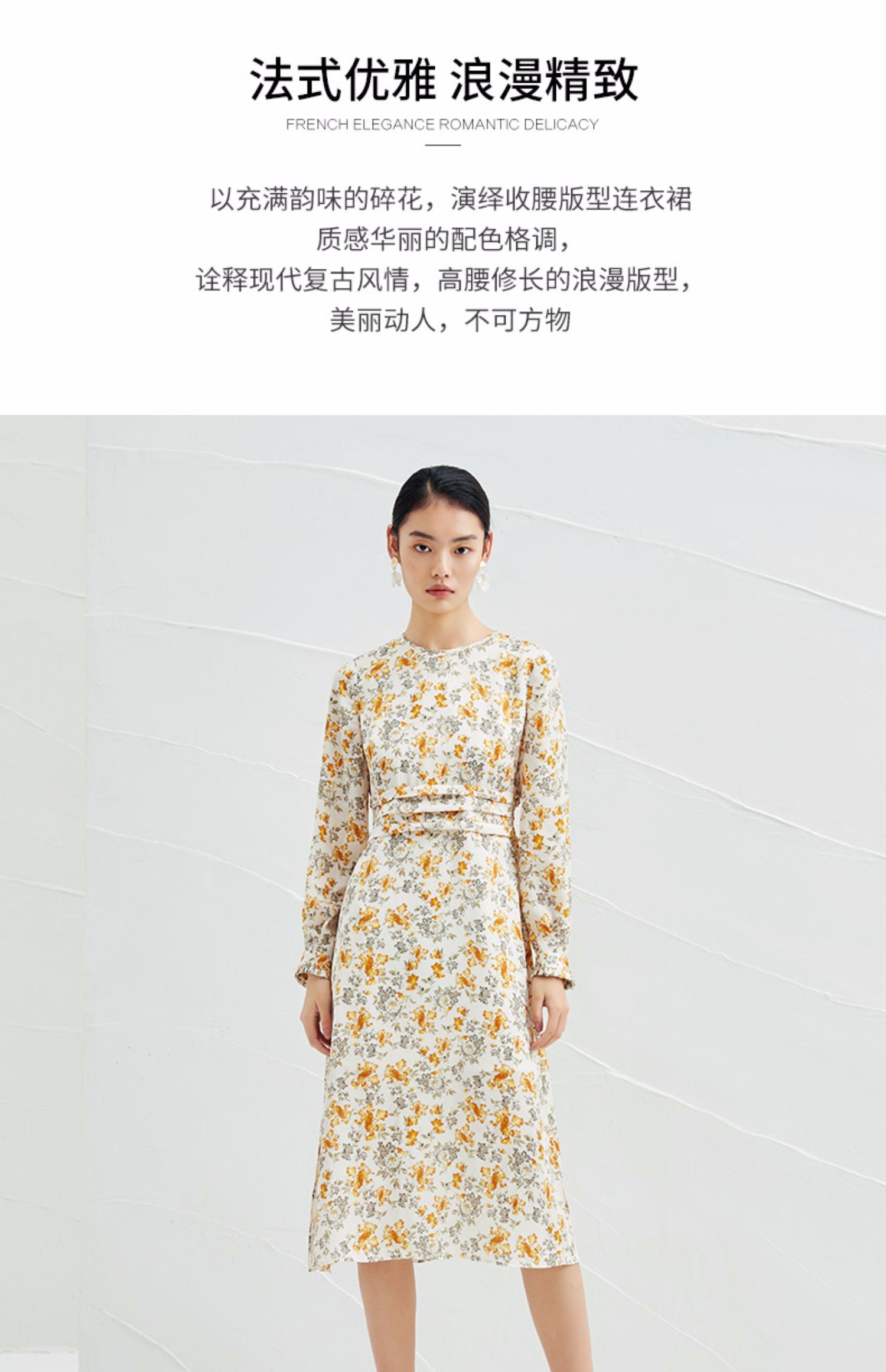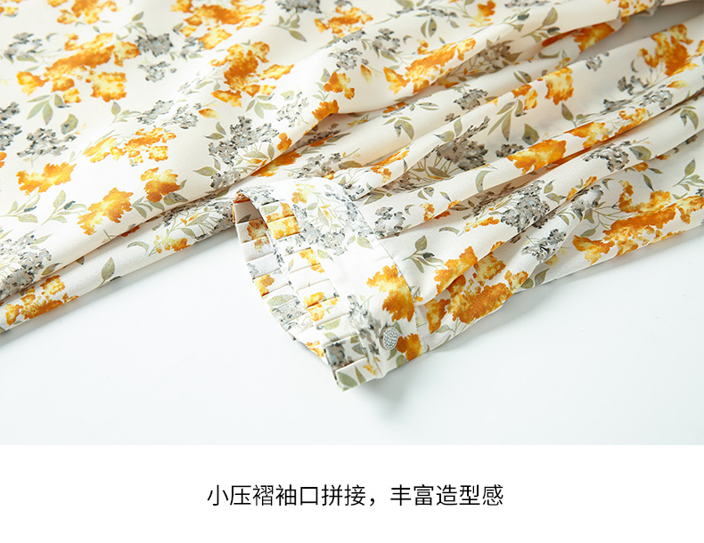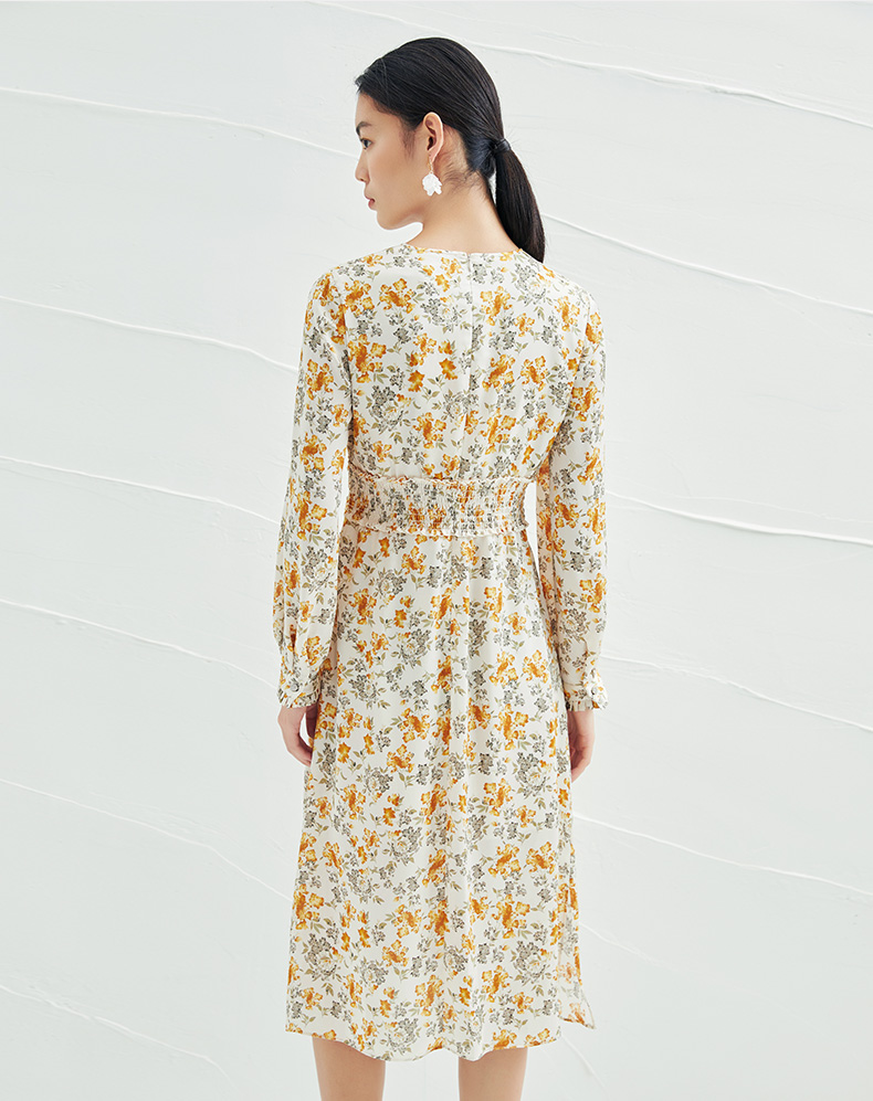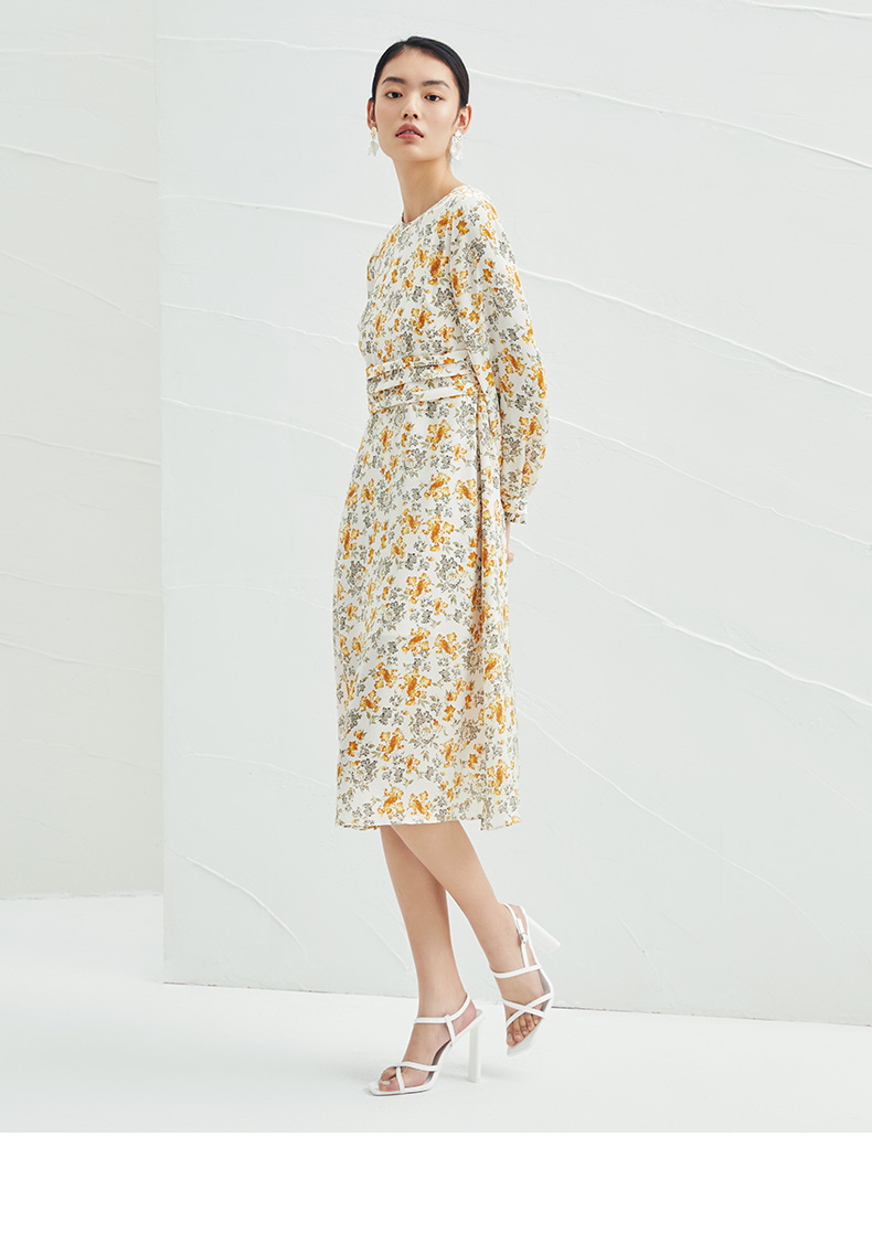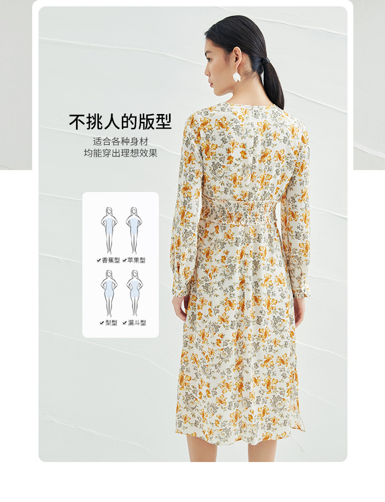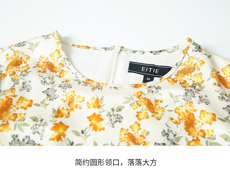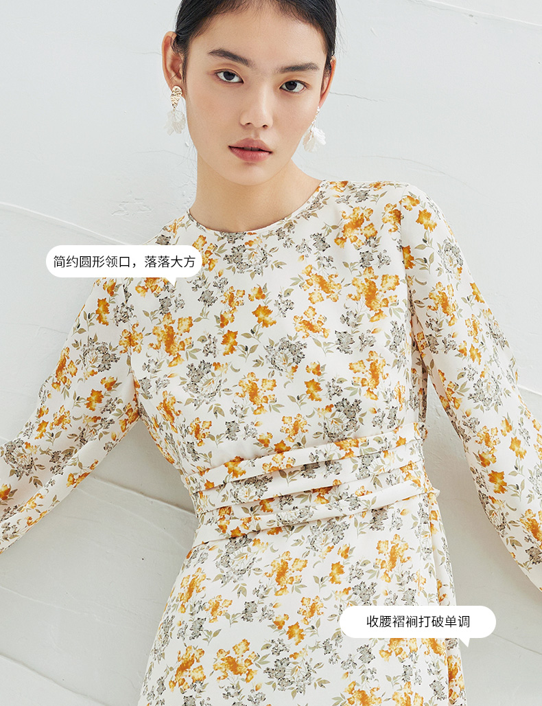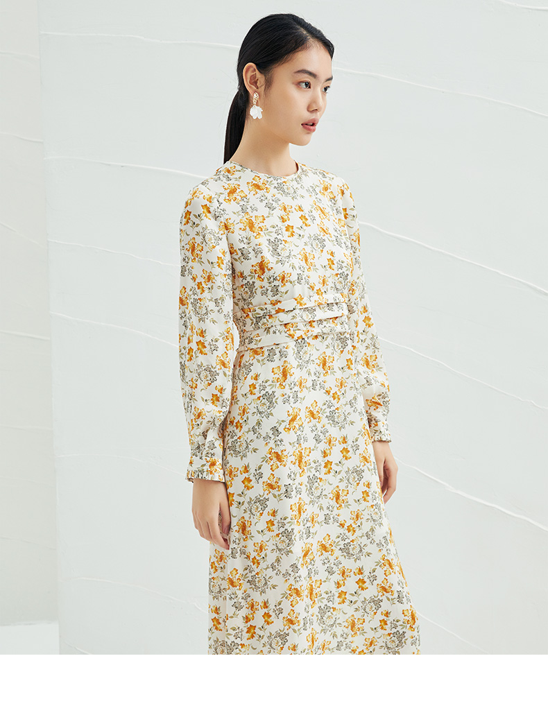 EITIE爱特爱春季新款圆领收腰a字碎花清新时尚长袖裙子连衣裙A2207929