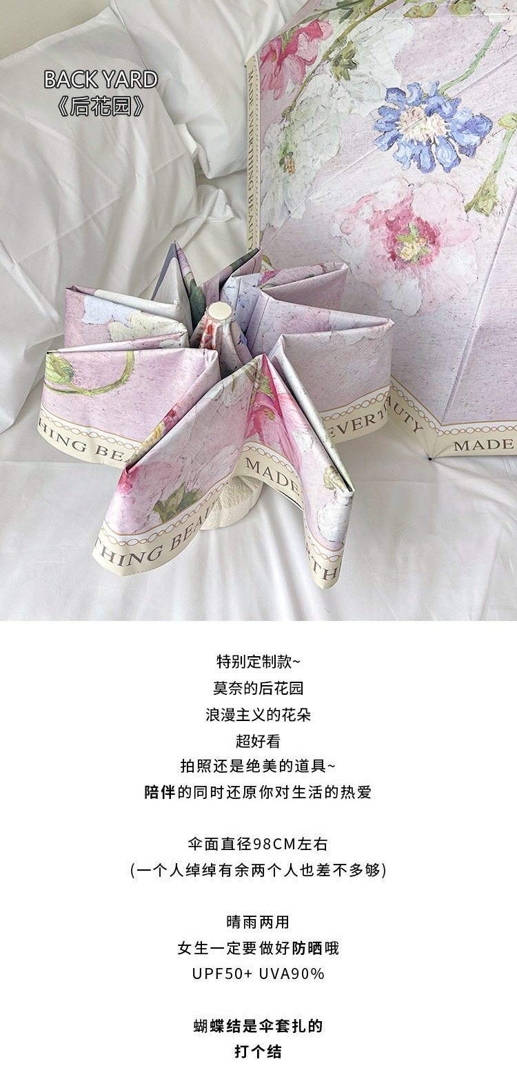 【品名】韩国AVRNA 法式高级感碎花 晴雨伞/太阳伞/遮阳伞 晴雨两用 自动款/手动款 【规格】 五折手动款/自动款/手动款:复古油画、荆棘花、小碎花 【产地】国内 【发货包装】独立包装 【发货地】浙江 【发货快递】普通快递随机发 【不发货区域】新疆、西藏、港澳台 【发货时效】48-72小时,周末节假日顺延 |