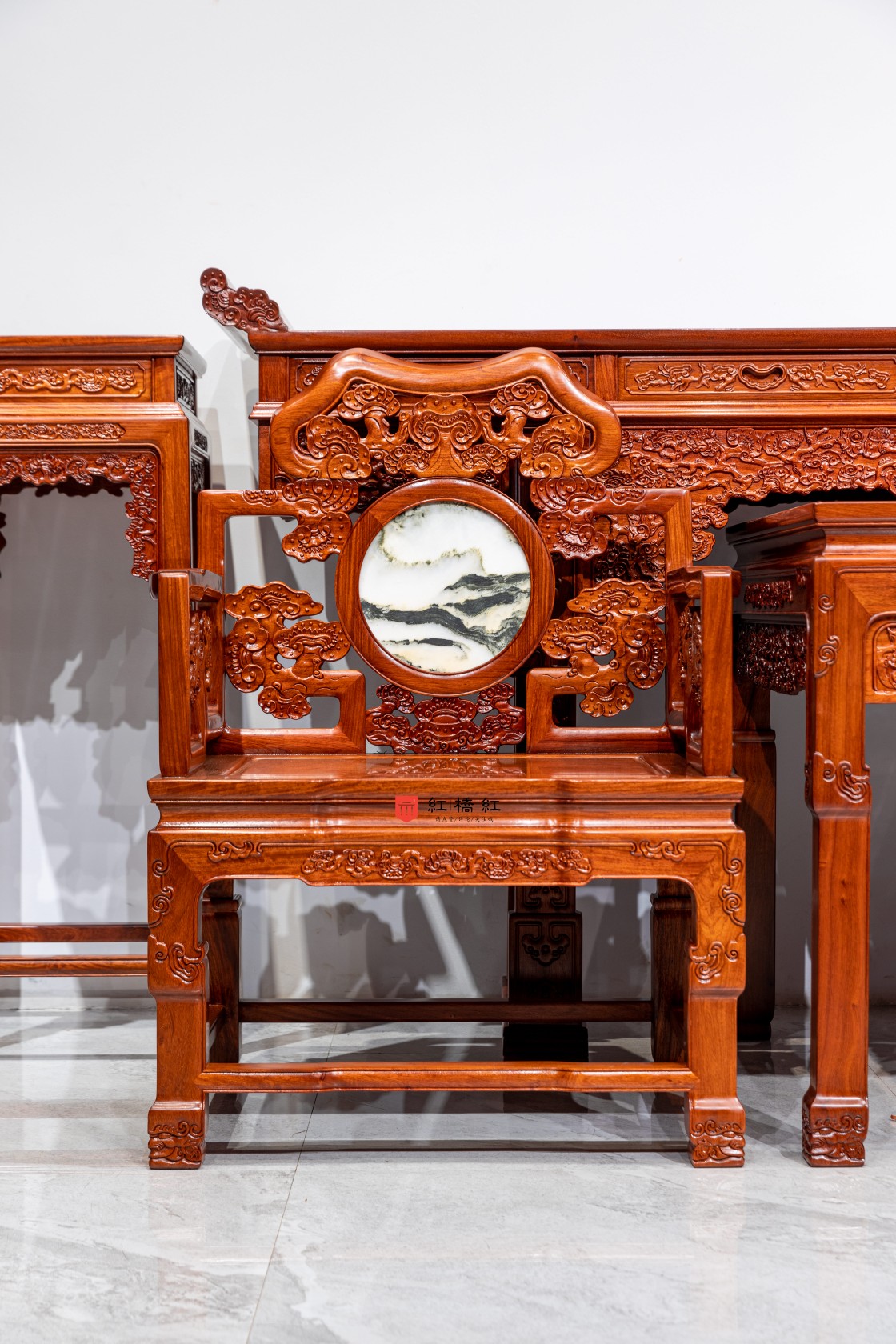 此套灵芝中堂,以一张八仙桌与成对的太师椅搭配,再加上翘头案以及花架组合而成,然后按厅堂的中轴对称摆放,搭配上楹联与匾额,更有庄重的仪式感。此中堂以缅甸花梨(大果紫檀)为用材,整器雕饰灵芝纹饰,《神农本草经》 记载灵芝有延年益寿的功效,太师椅三面椅围均镂空雕刻灵芝纹,背板中部镶圆形云石面心;云石为大自然天工造物,白质黑章,每必独一;有人物山水草木禽鱼之状,木石结合崇古尚雅。整器通体雕刻灵芝纹,寓意长寿福禄、吉祥如意,寓意美好。总体布局巧秒,层次分明,主题寓意突出。将中堂整天表现得更为沉稳大气。此款灵芝中堂器型庄重严谨,体量宽大,观感极为气派。