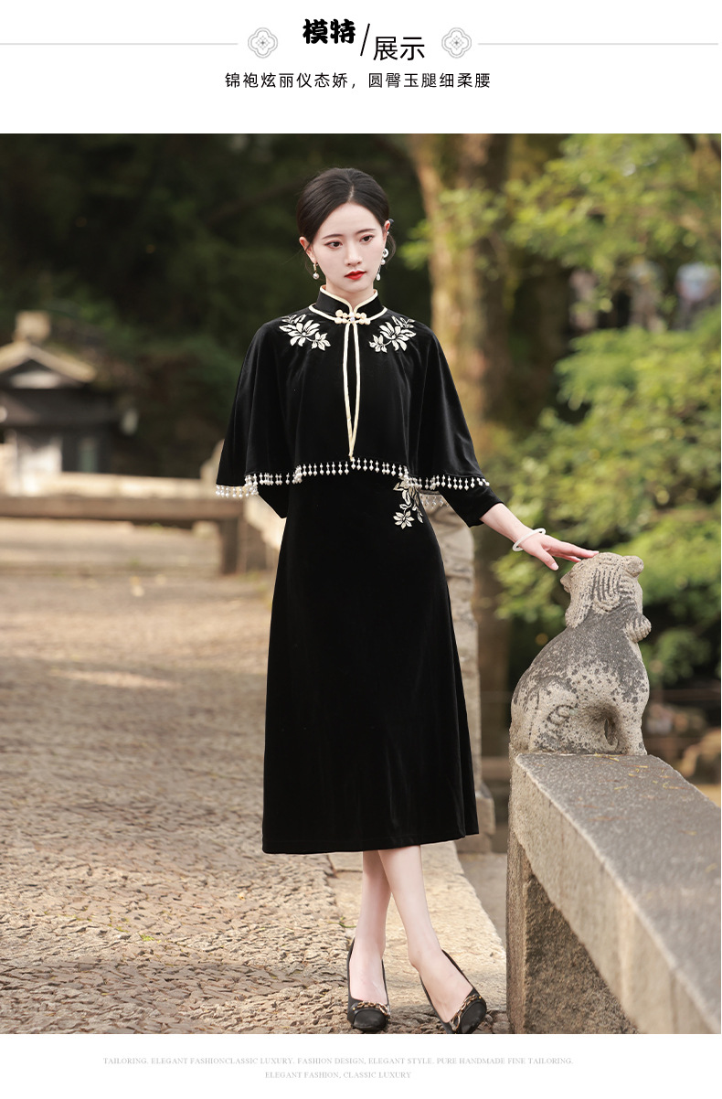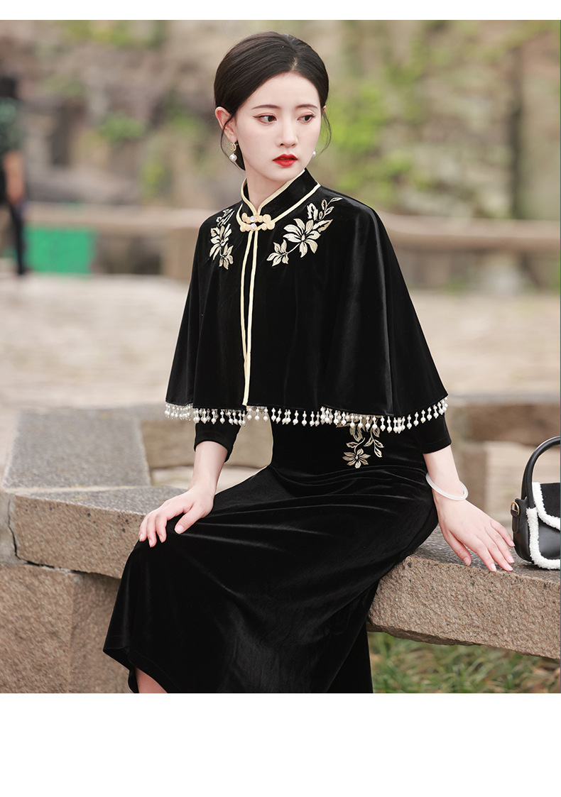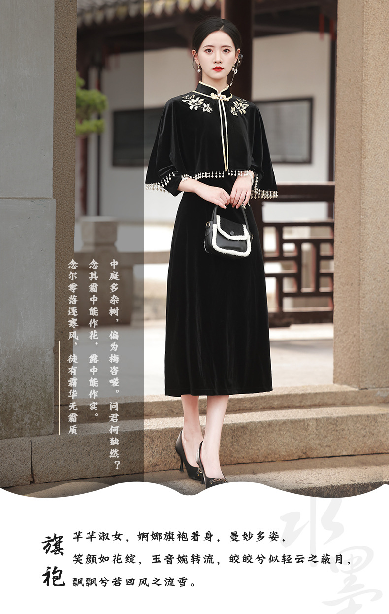 改良复古丝绒旗袍套装,秋季新款气质民国风绣花斗篷旗袍裙BJS-8002