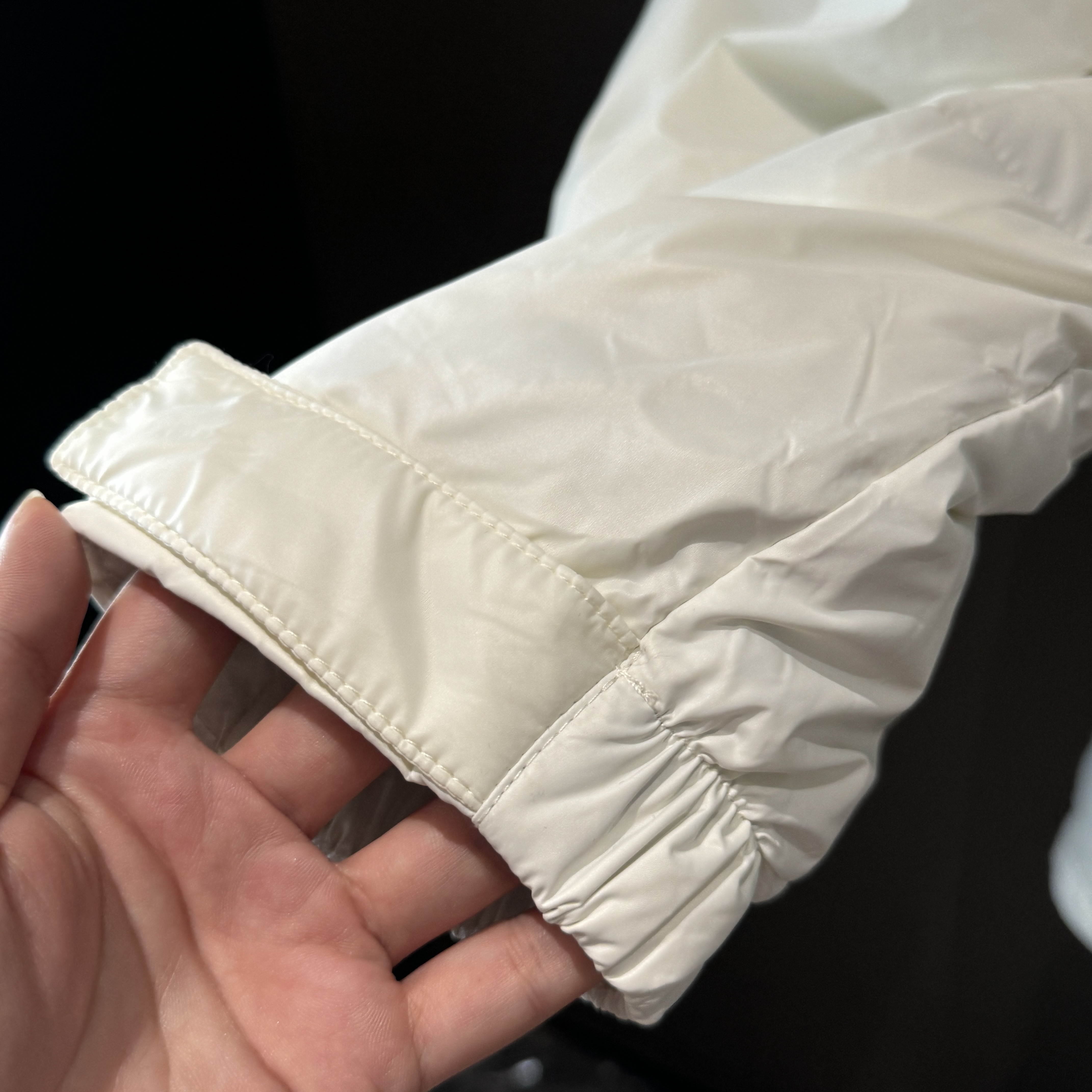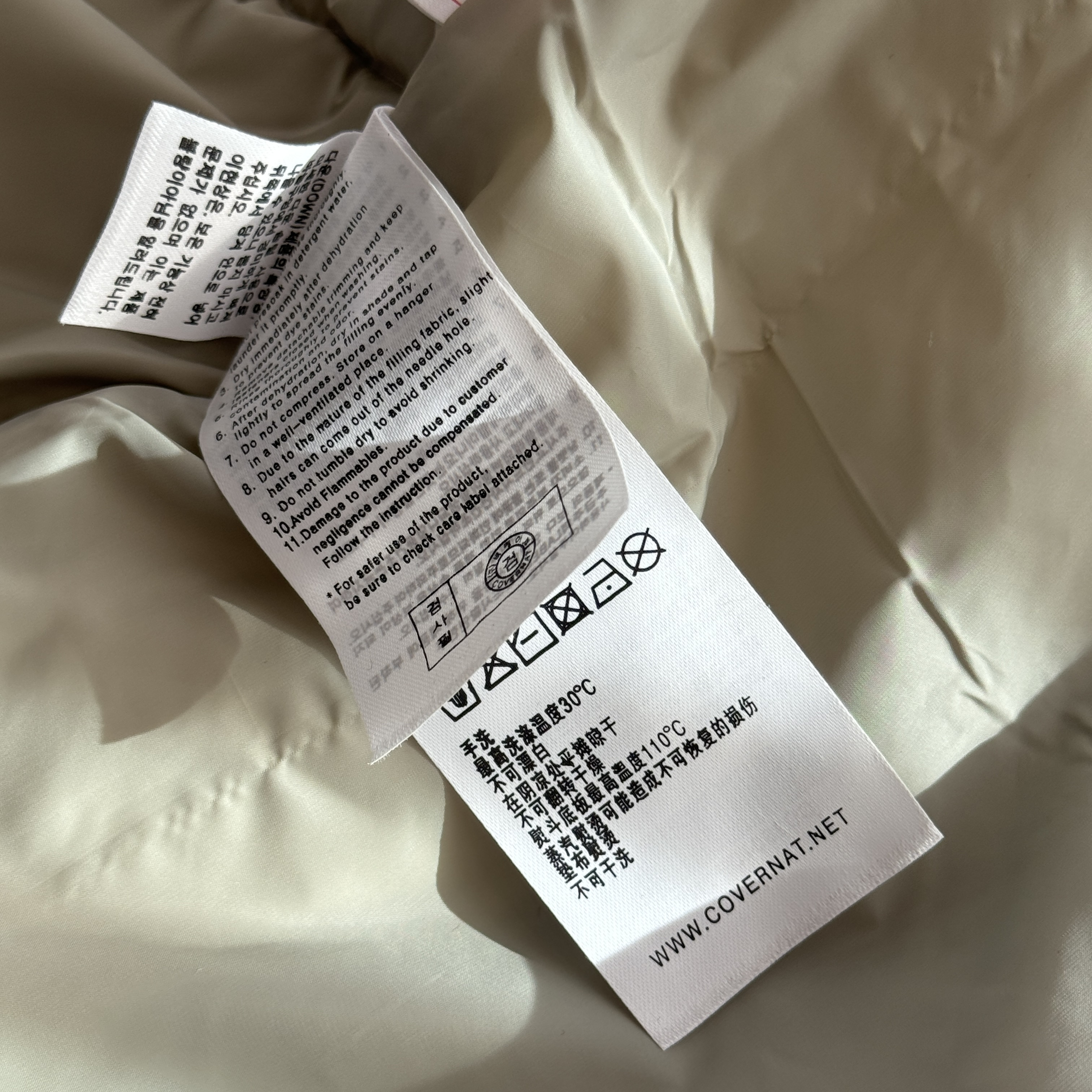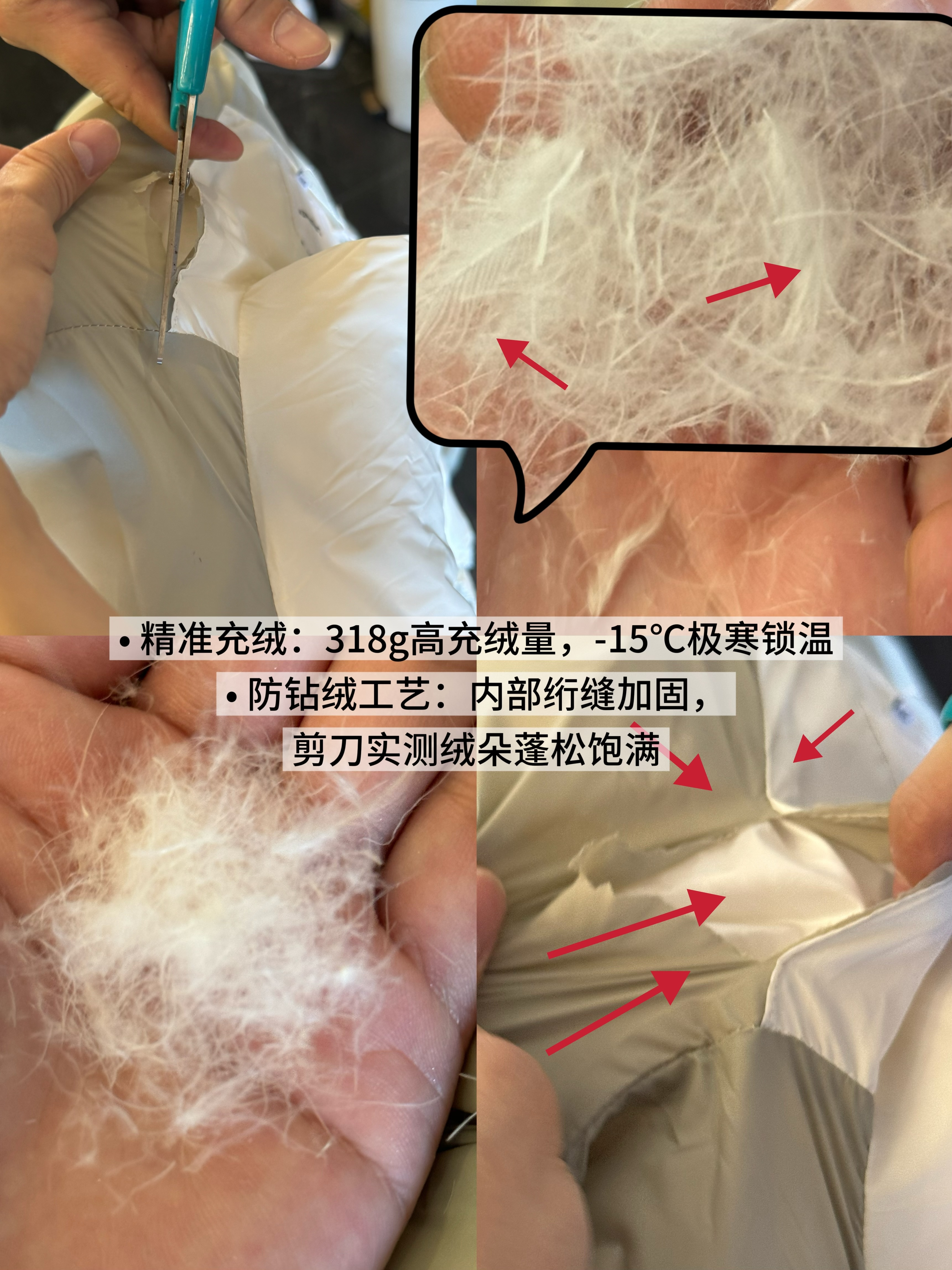 核心‼️防泼水面料:酱油污渍一擦即净,米白色也能任性穿。精准充绒:318g高充绒量,-15℃极寒锁温。防钻绒工艺:内部绗缝加固,剪刀实测绒朵蓬松饱满。品牌吊牌齐全:韩文原版吊牌+RDS认证标签,zheng品保障‼️
