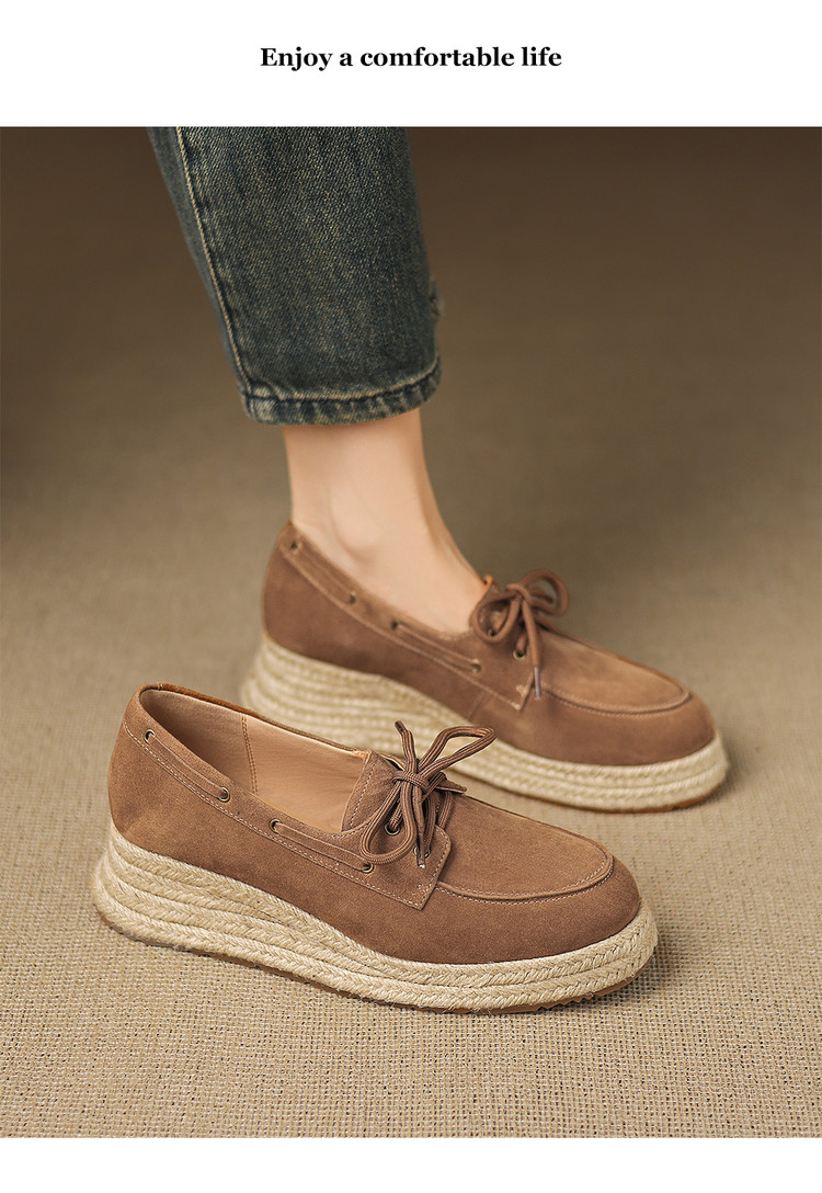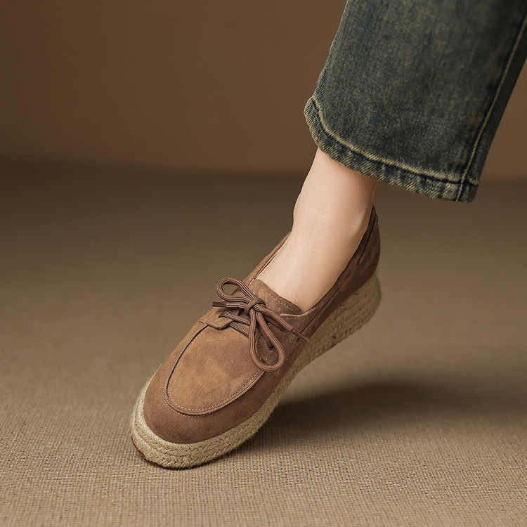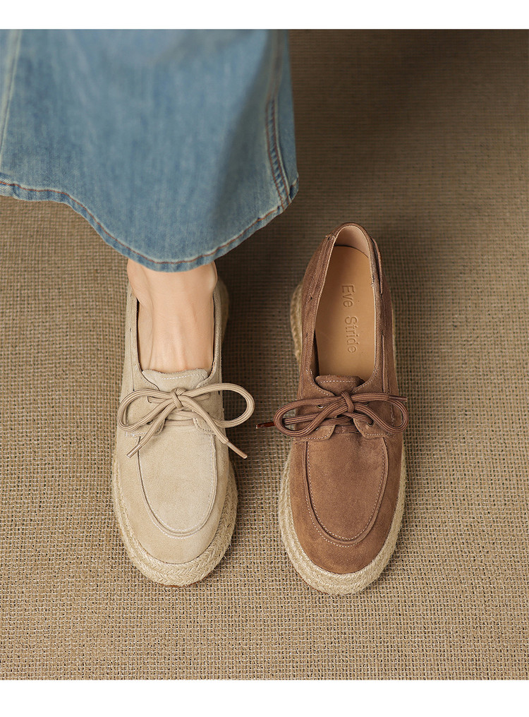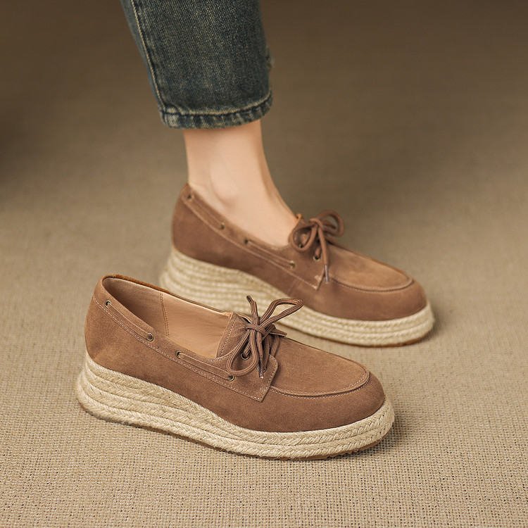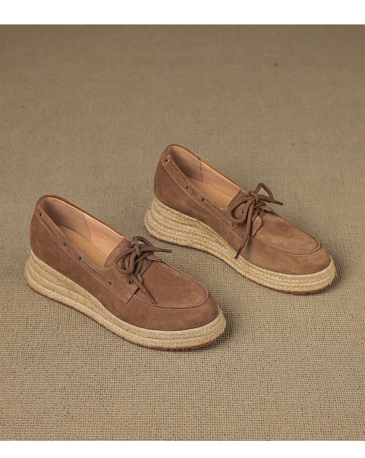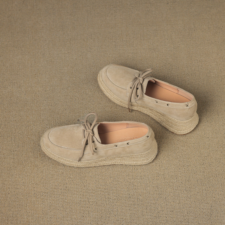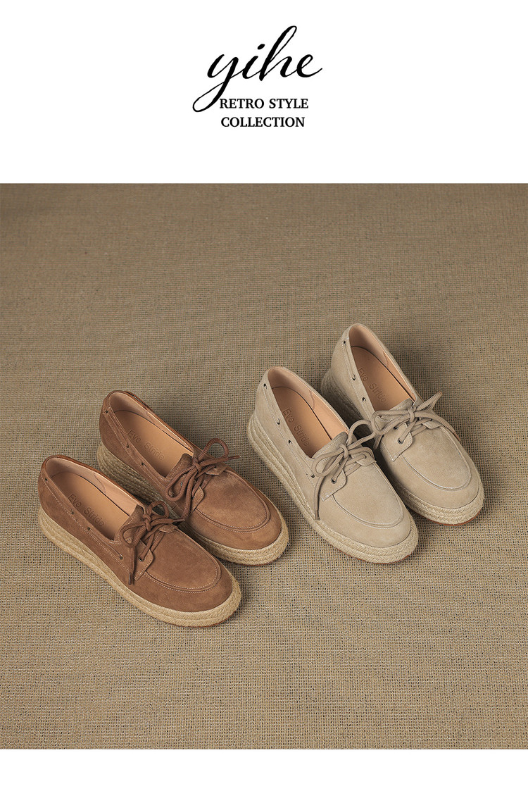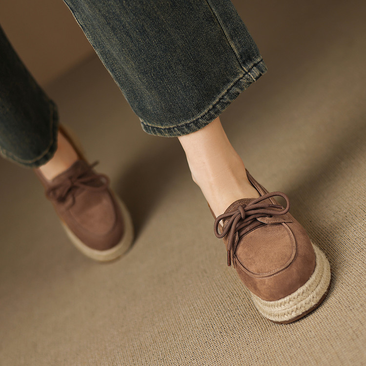 【预售5天】5cm复古磨砂真皮草编厚底单鞋女秋季新款圆头渔夫鞋系带乐福鞋MT&MD5291