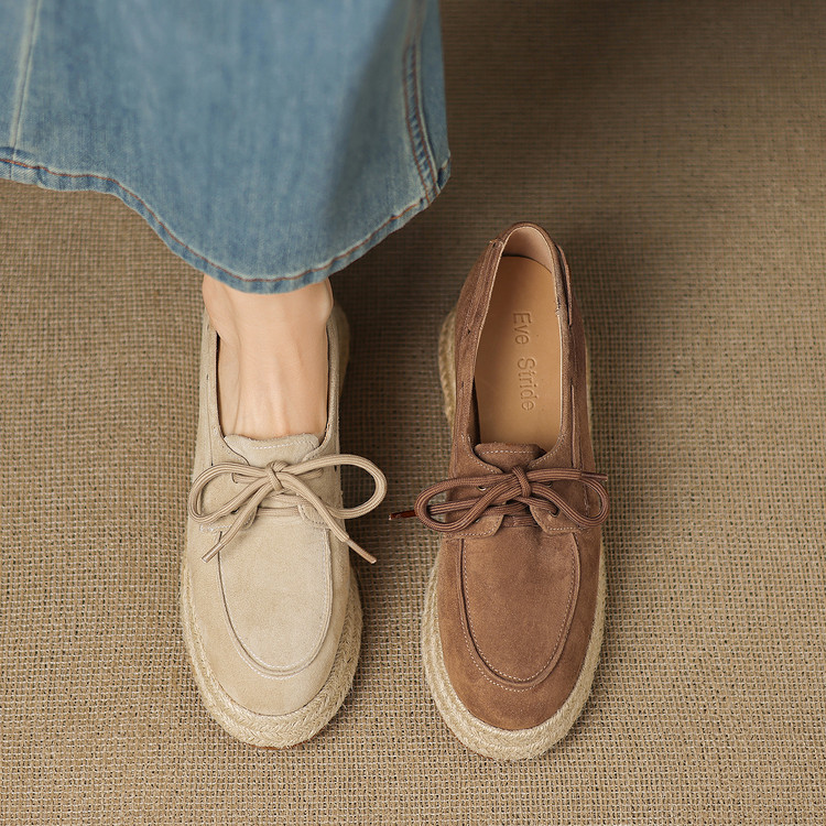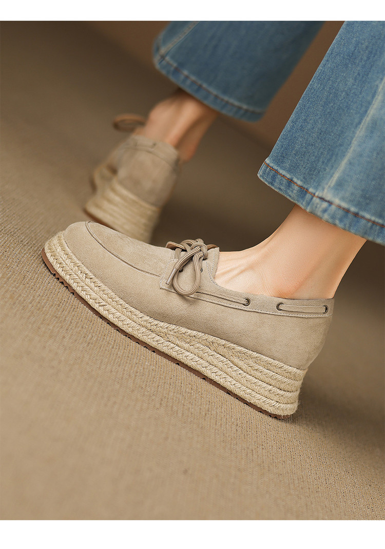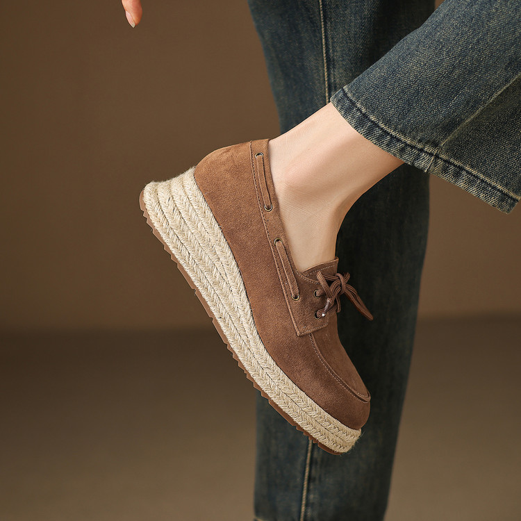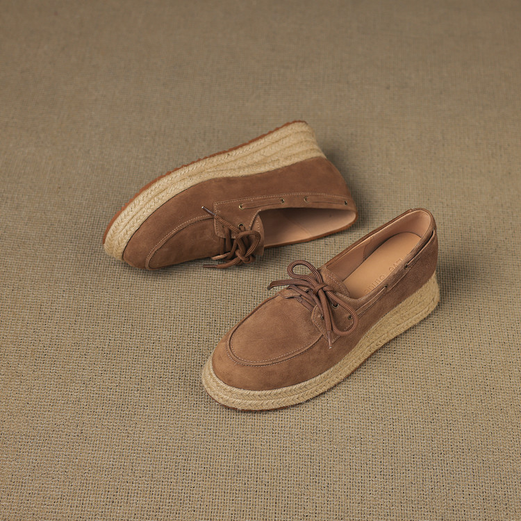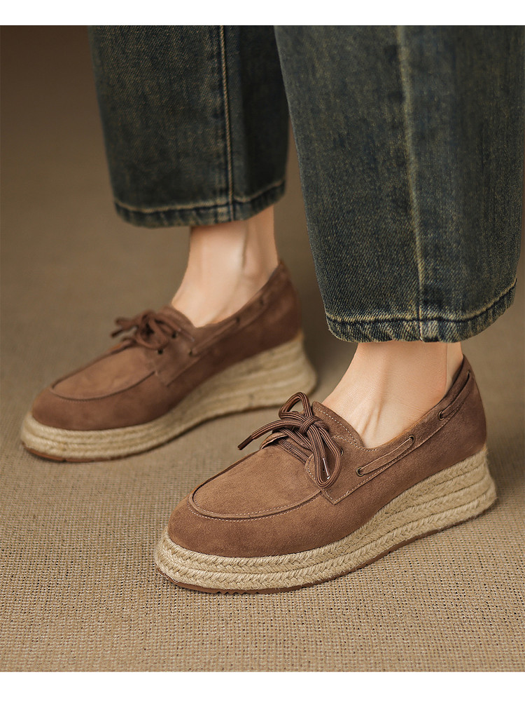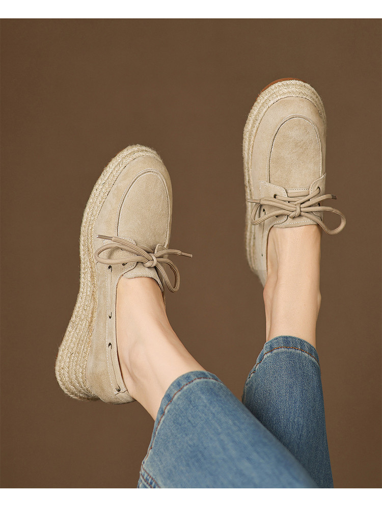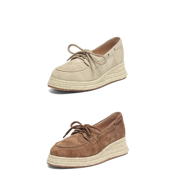 【预售5天】5cm复古磨砂真皮草编厚底单鞋女秋季新款圆头渔夫鞋系带乐福鞋MT&MD5291
