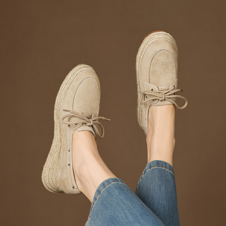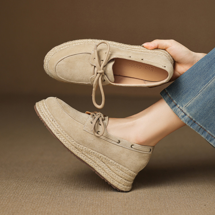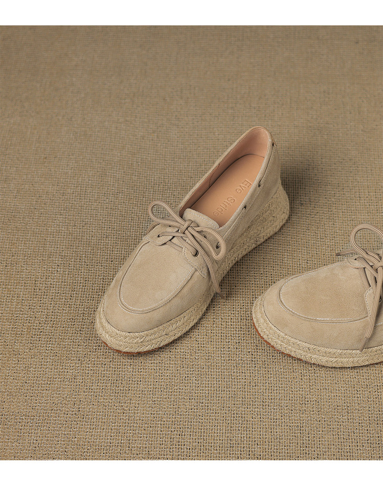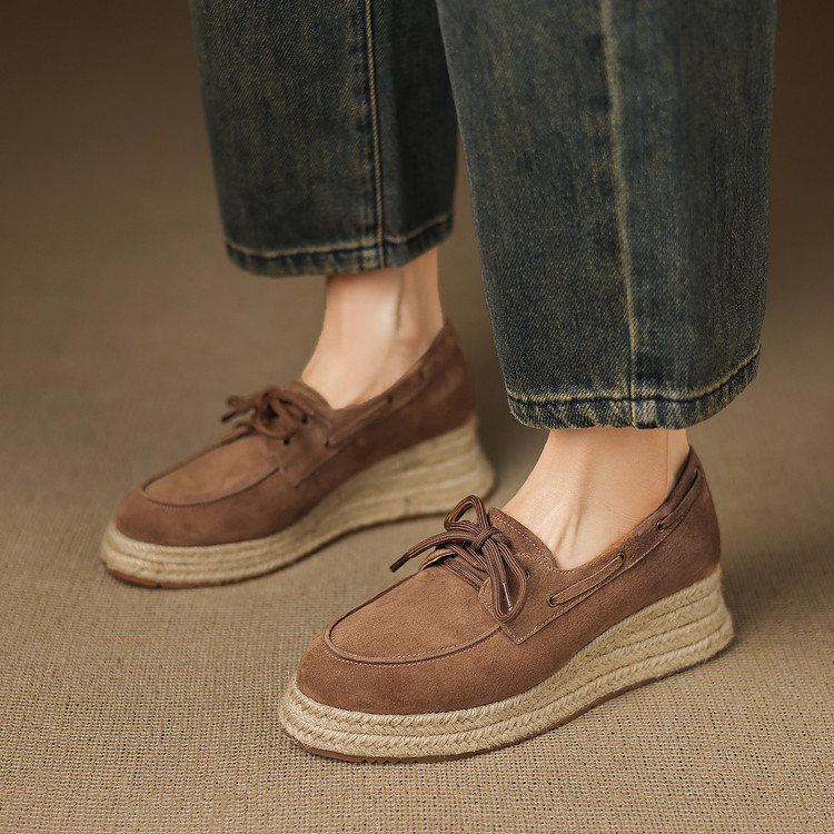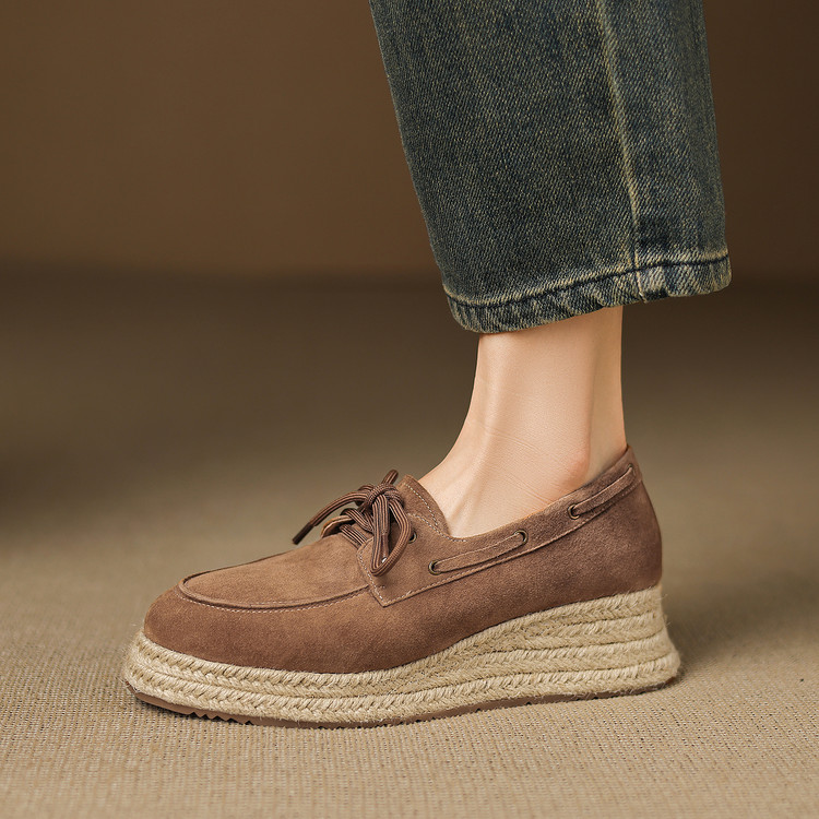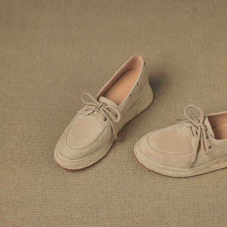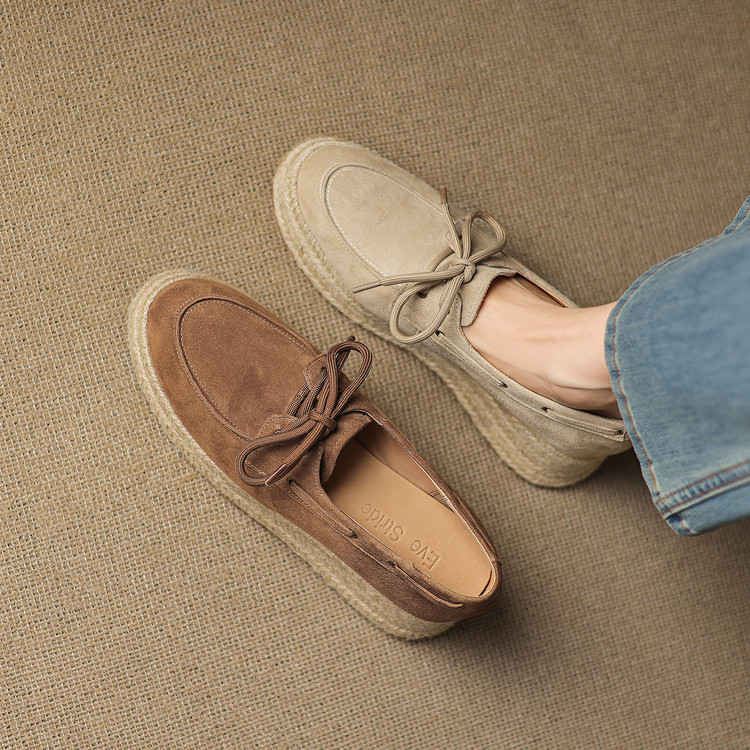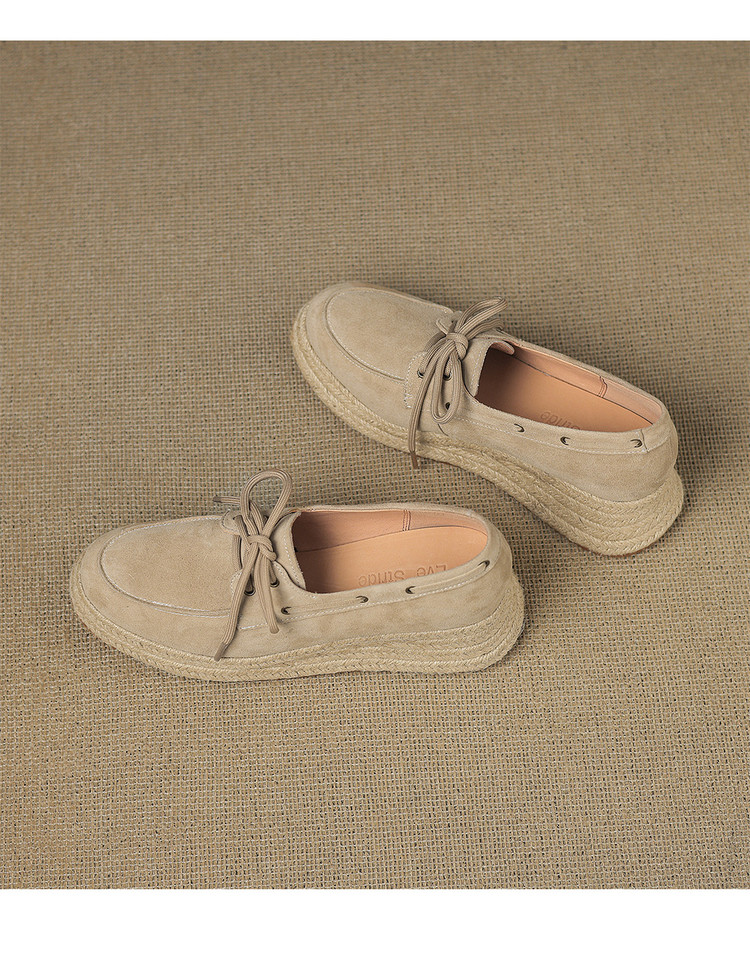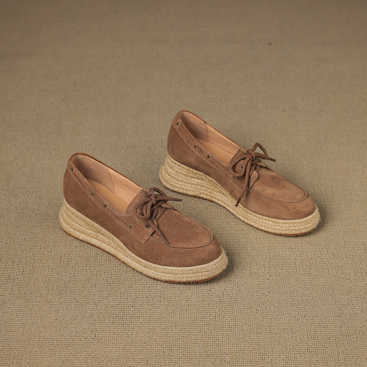 【预售5天】5cm复古磨砂真皮草编厚底单鞋女秋季新款圆头渔夫鞋系带乐福鞋MT&MD5291