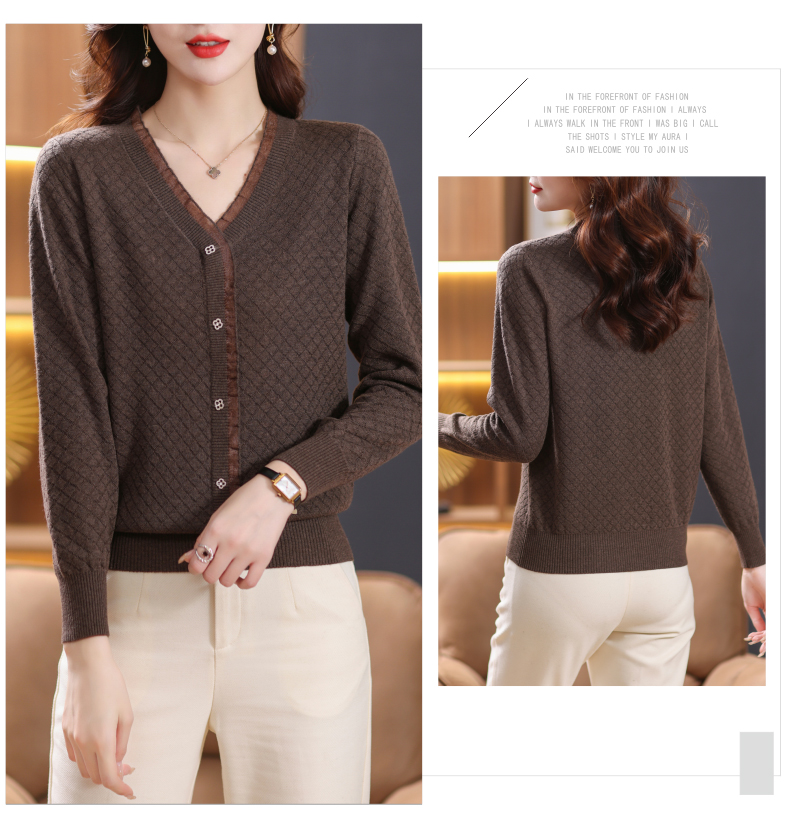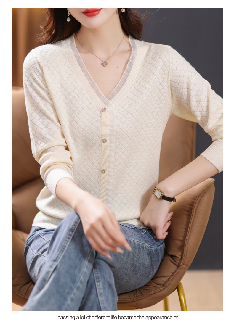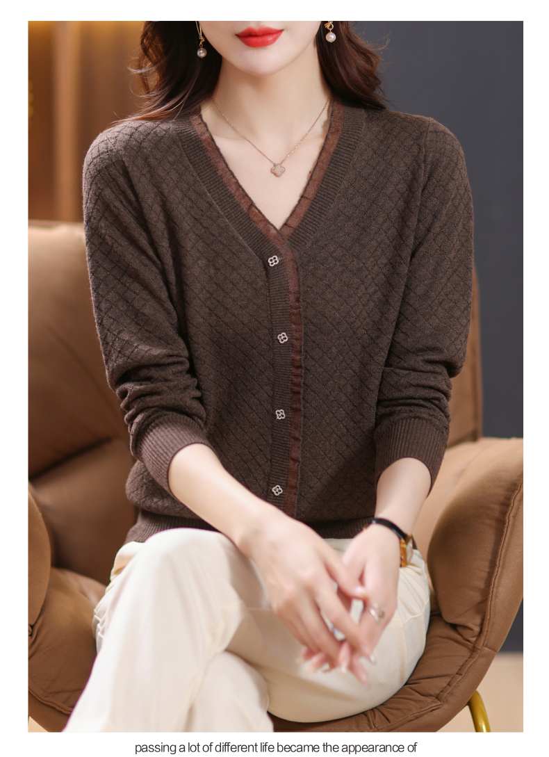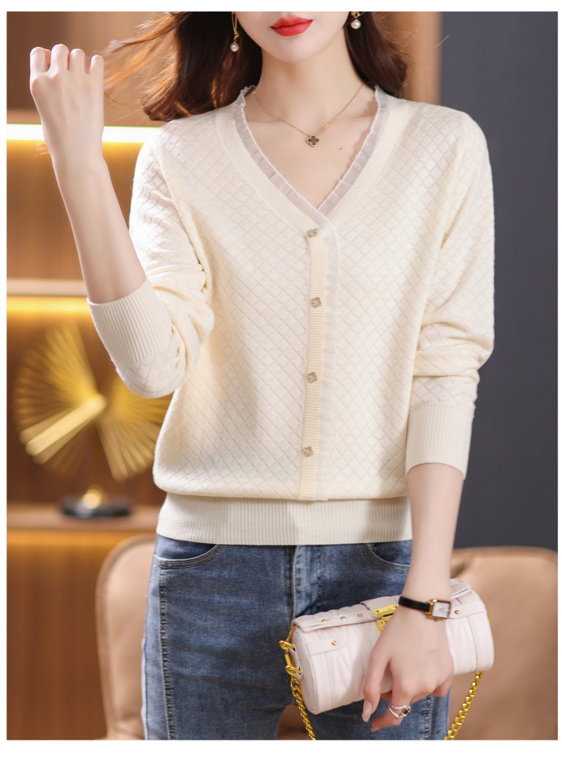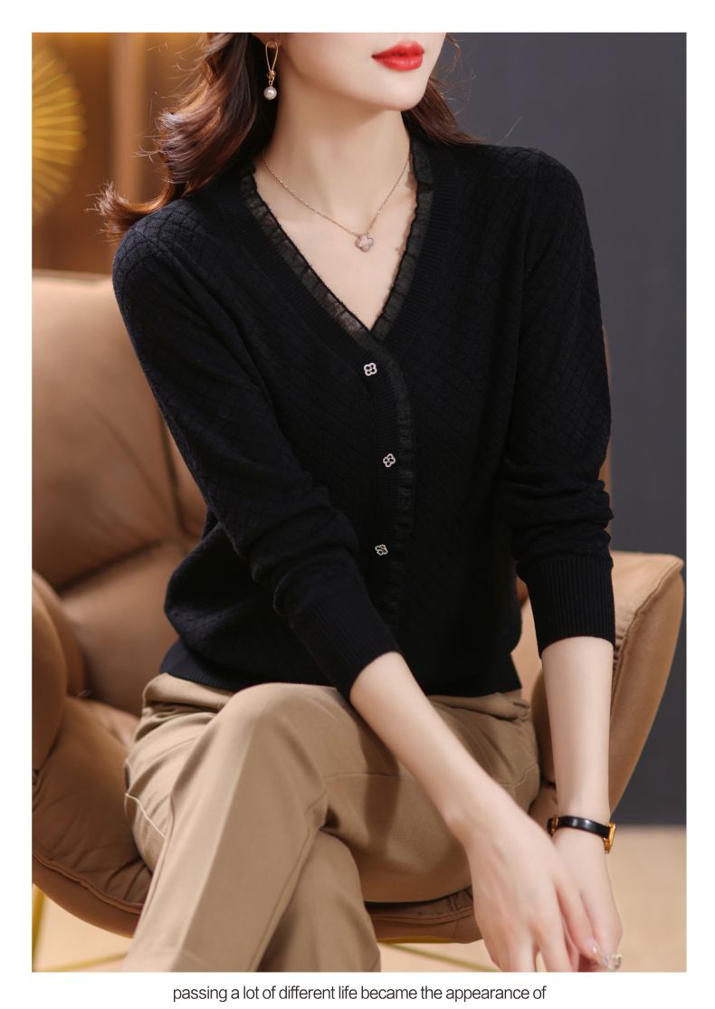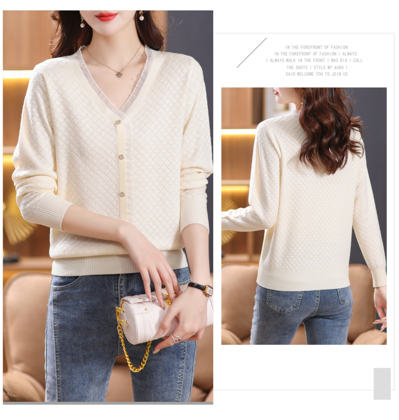 V领蕾丝针织打底衫女,秋冬春装新款女士毛衣假两件上衣短款CC-101-89215