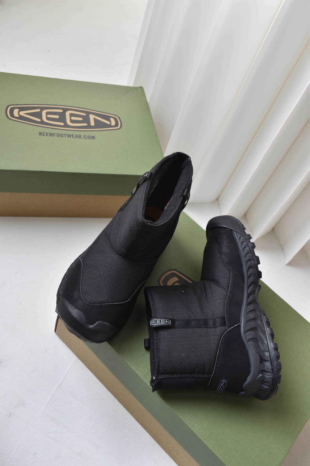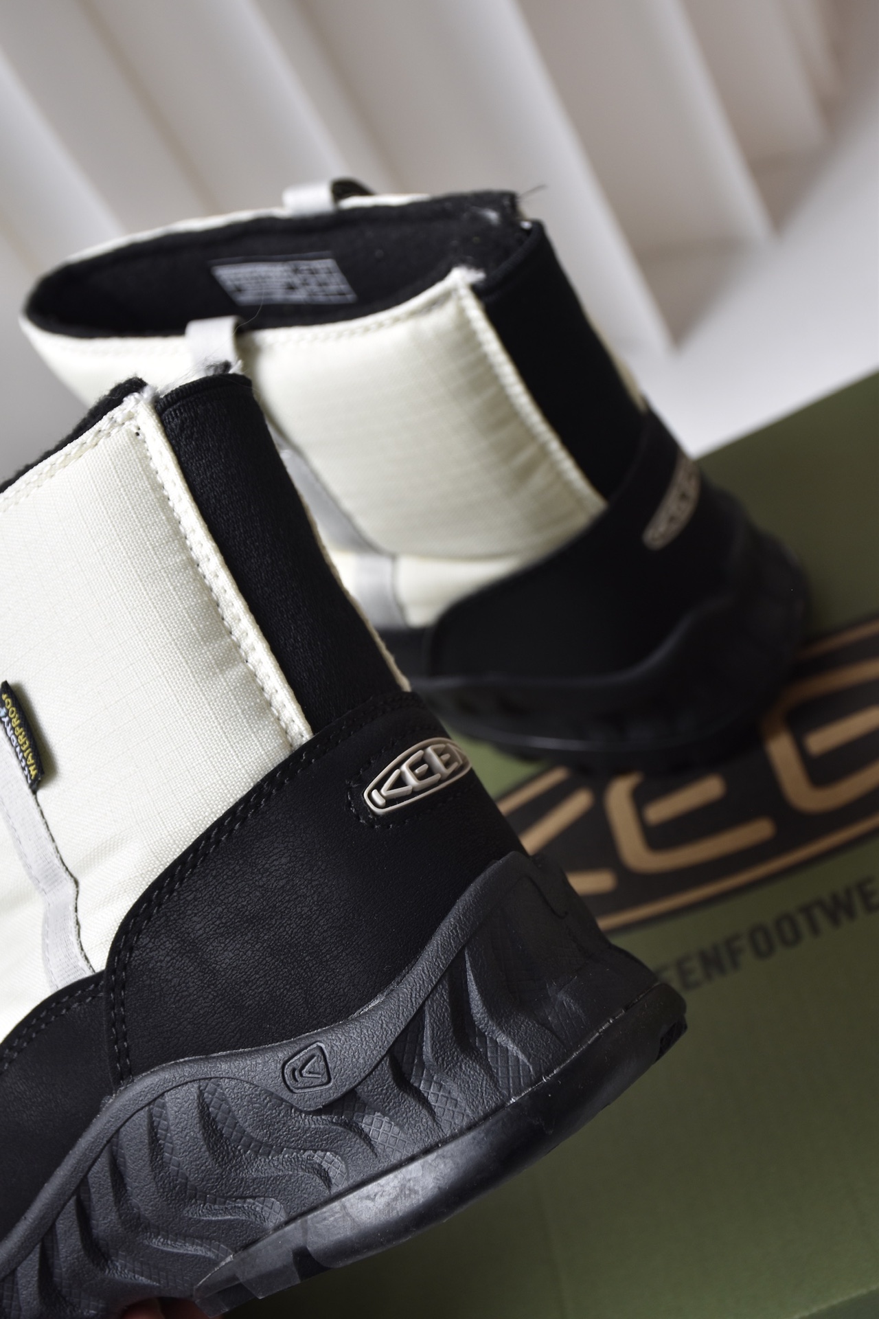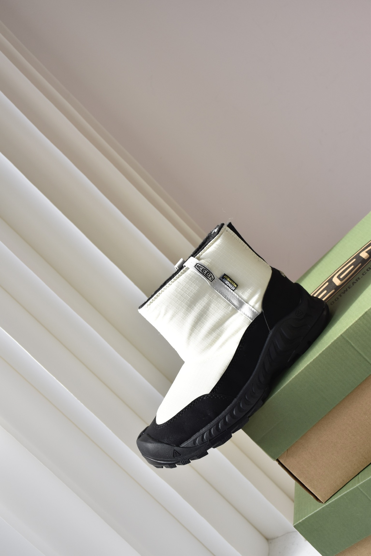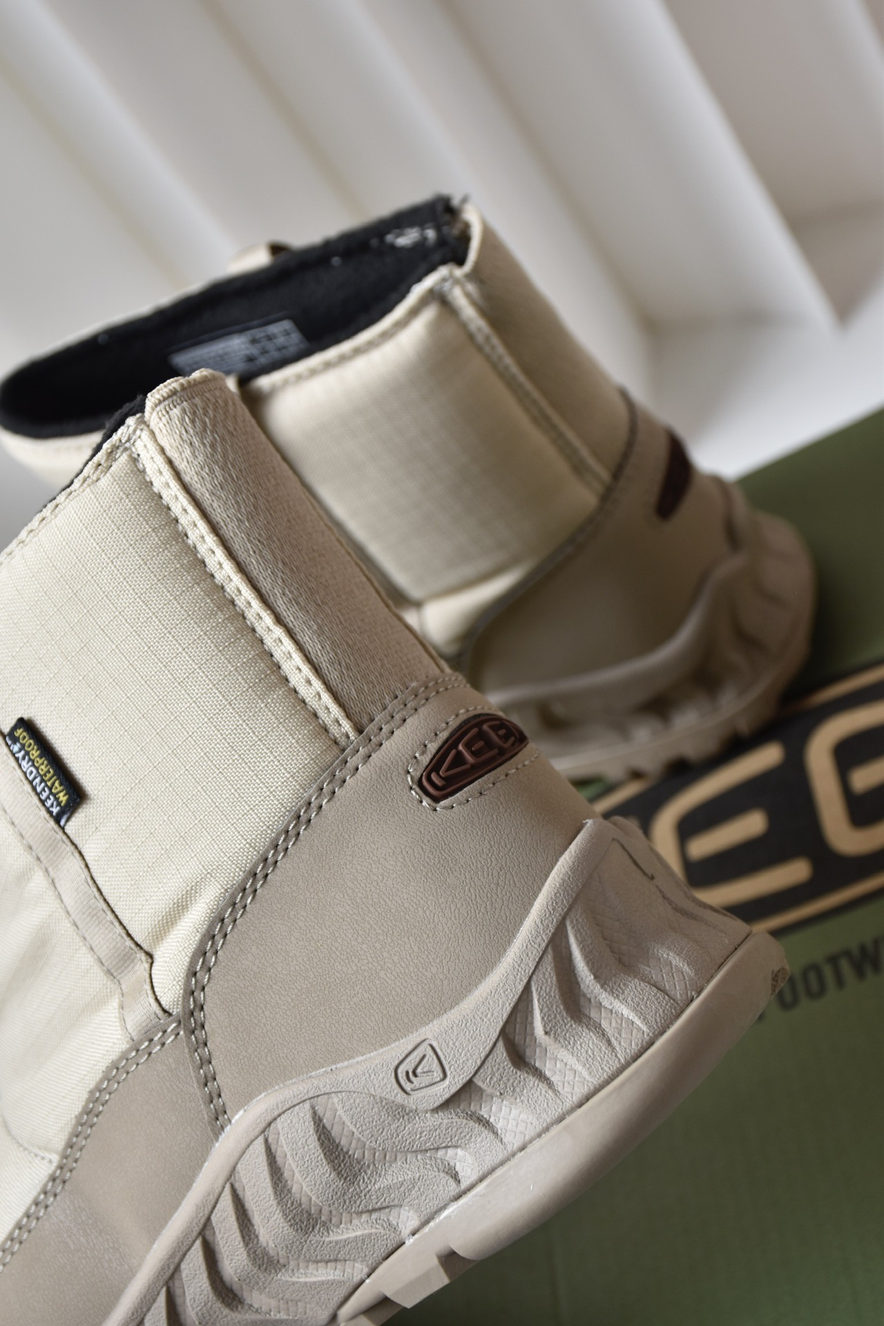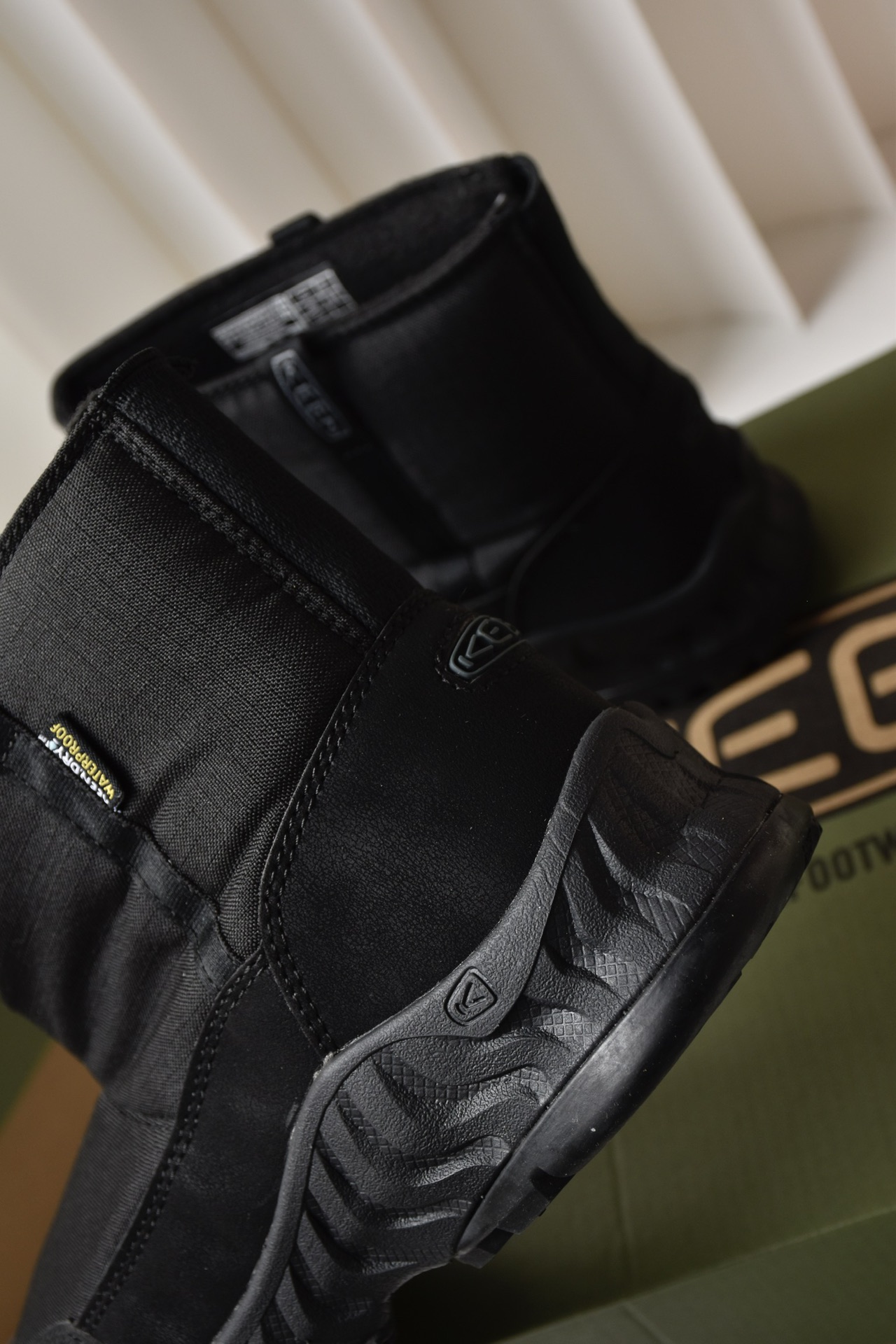 搭载KEEN.DRY防水透气薄膜和100g KEEN.WARM再生PET保温材料,可抵御-4°F/-20°C低温,采用Original Fit宽楦设计,前脚掌空间充足,配有可调节后跟带和FIDLOCK扣具,方便穿脱并提供定制化贴合感,配备压缩成型泡沫中底和可拆卸Luftcell空气注入鞋垫,提供良好的缓冲效果,KEEN.ALL-TERRAIN橡胶外底配4mm多向凸纹,提供卓越抓地力,适应各种复杂地形。
