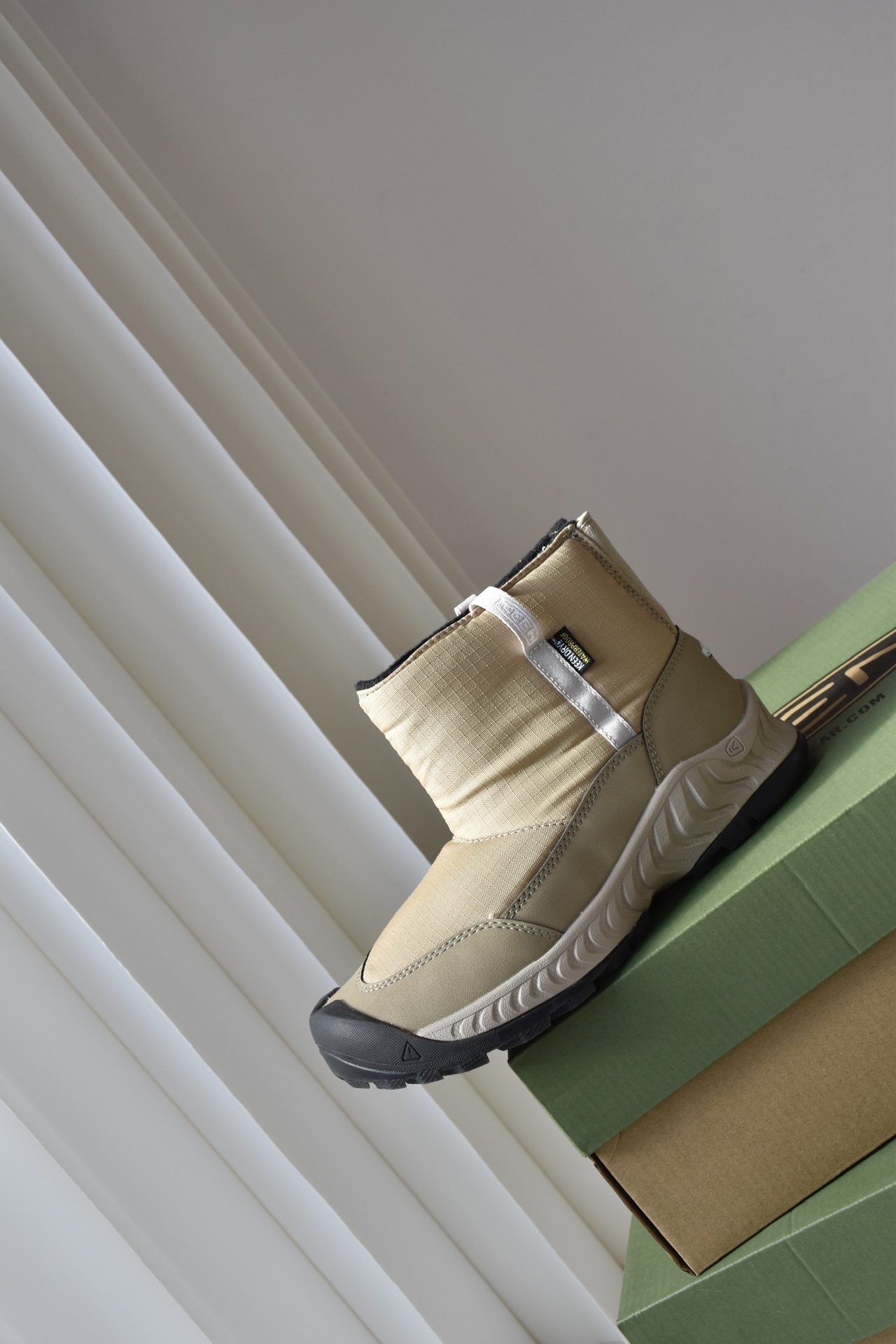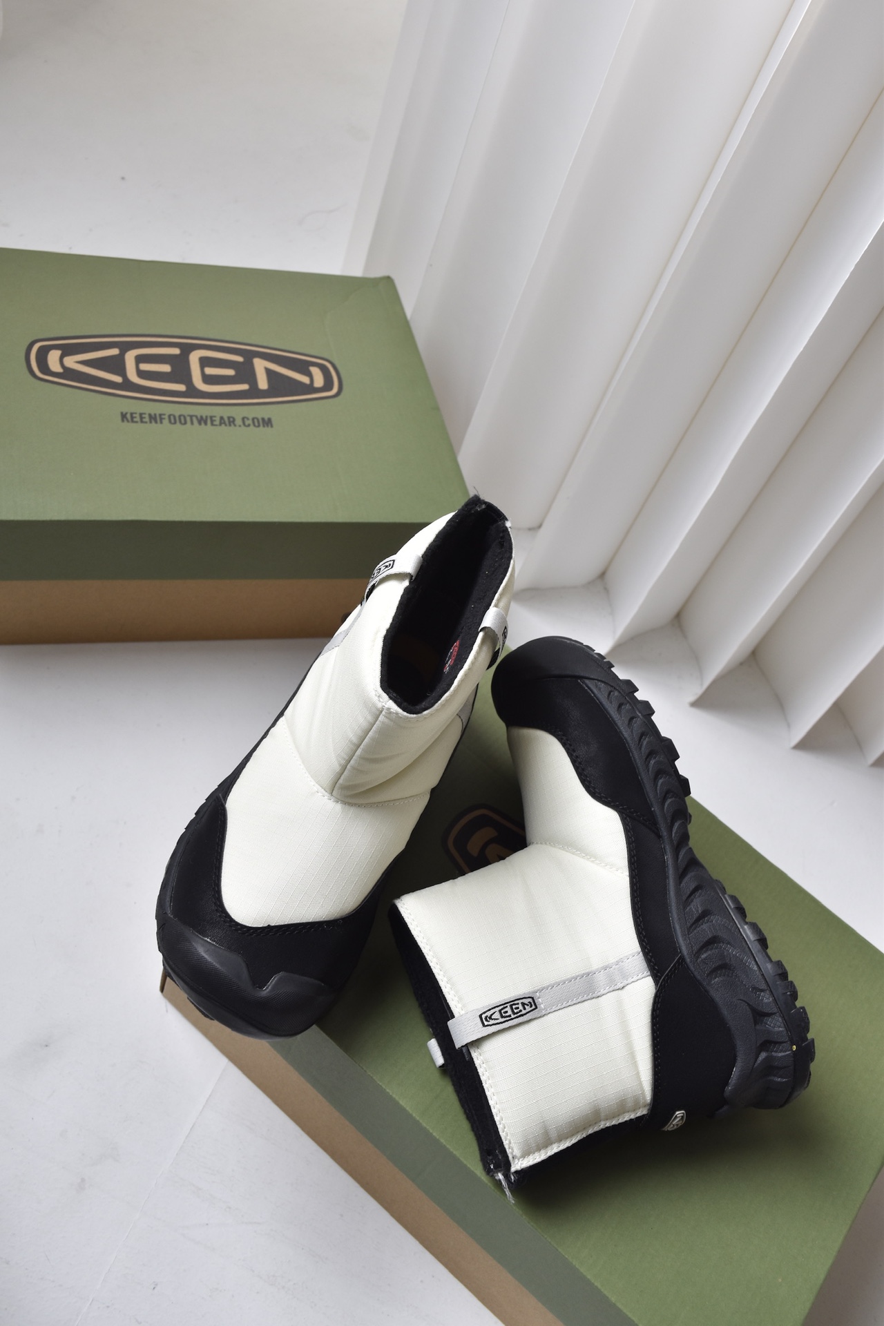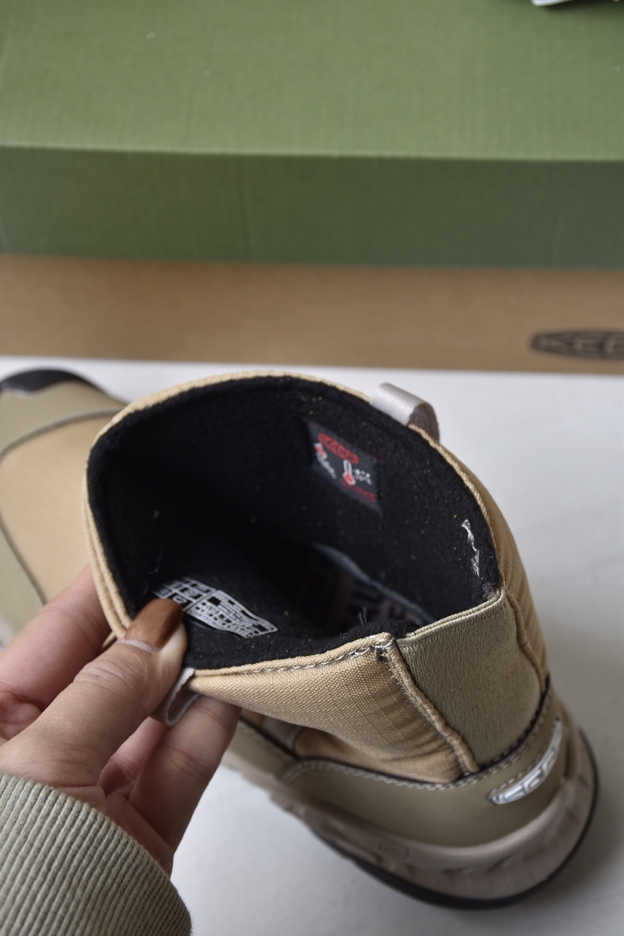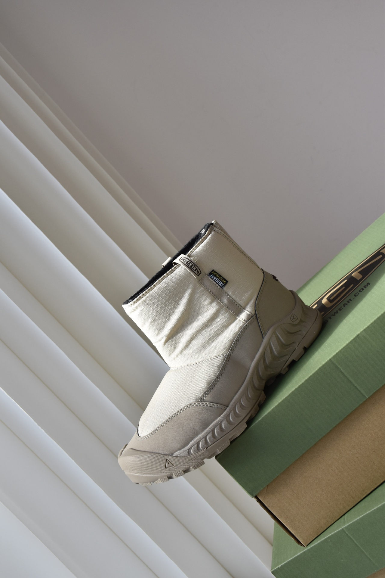 搭载KEEN.DRY防水透气薄膜和100g KEEN.WARM再生PET保温材料,可抵御-4°F/-20°C低温,采用Original Fit宽楦设计,前脚掌空间充足,配有可调节后跟带和FIDLOCK扣具,方便穿脱并提供定制化贴合感,配备压缩成型泡沫中底和可拆卸Luftcell空气注入鞋垫,提供良好的缓冲效果,KEEN.ALL-TERRAIN橡胶外底配4mm多向凸纹,提供卓越抓地力,适应各种复杂地形。