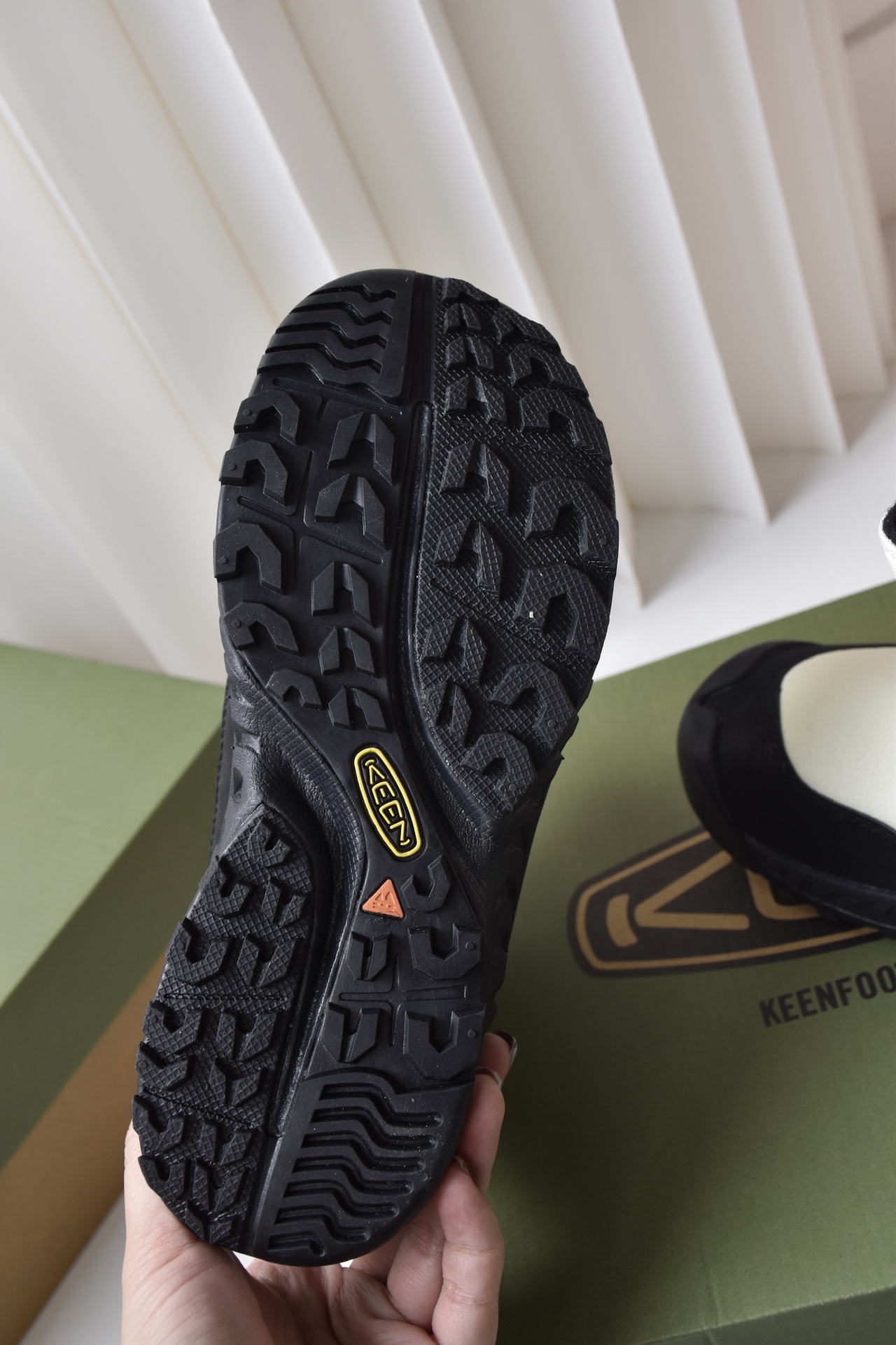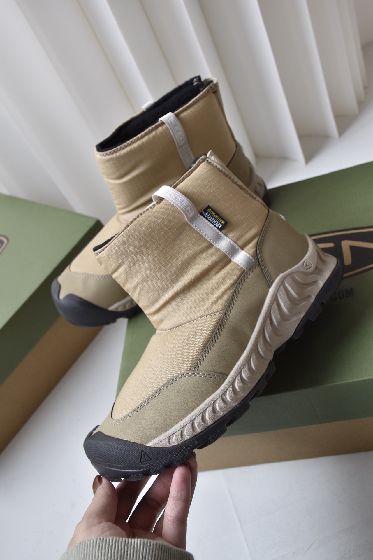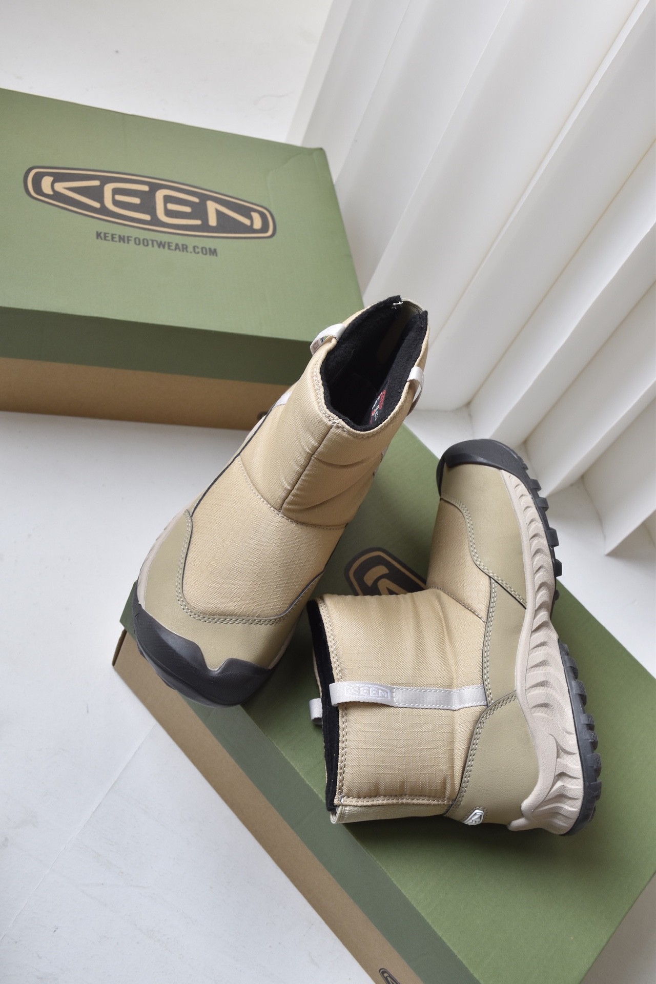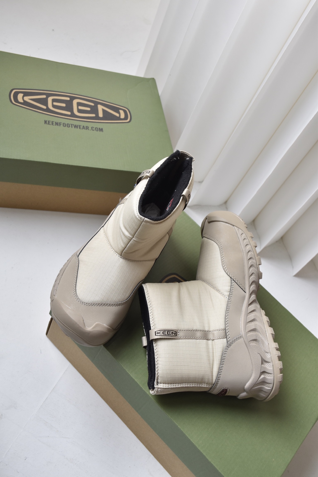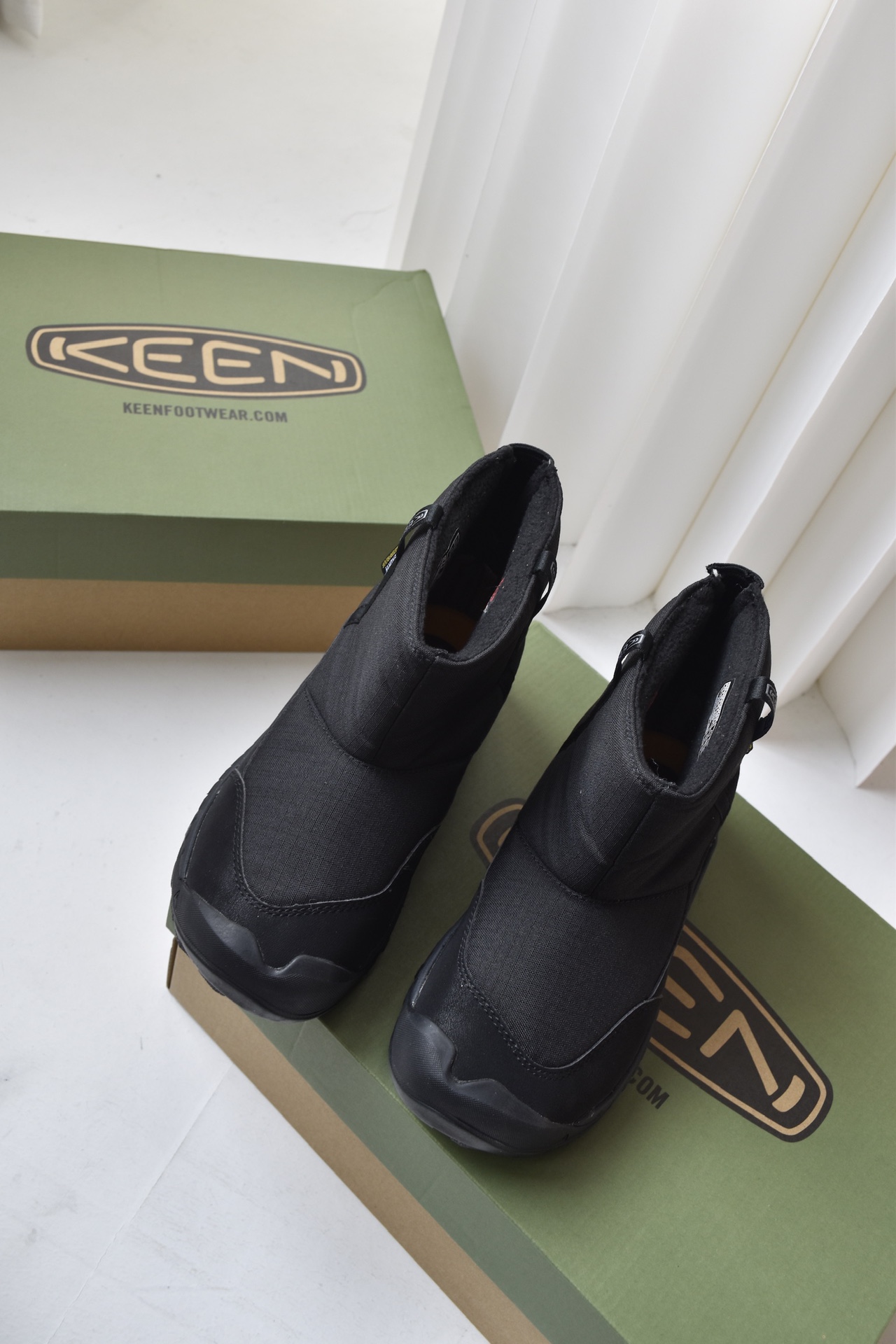 搭载KEEN.DRY防水透气薄膜和100g KEEN.WARM再生PET保温材料,可抵御-4°F/-20°C低温,采用Original Fit宽楦设计,前脚掌空间充足,配有可调节后跟带和FIDLOCK扣具,方便穿脱并提供定制化贴合感,配备压缩成型泡沫中底和可拆卸Luftcell空气注入鞋垫,提供良好的缓冲效果,KEEN.ALL-TERRAIN橡胶外底配4mm多向凸纹,提供卓越抓地力,适应各种复杂地形。
