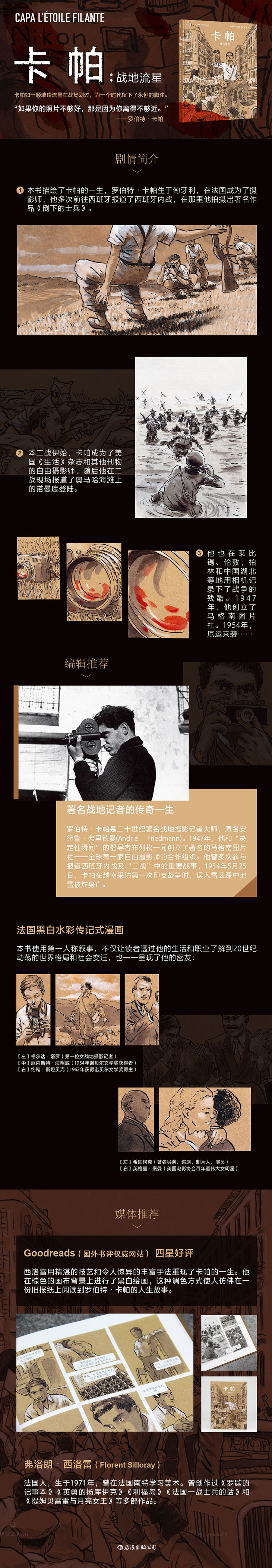 这是一本法国黑白水彩传记式漫画,它描绘了卡帕传奇的一生——卡帕出生于1913年布达佩斯的一个犹太家庭,本名为安德烈·弗里德曼,1933年,他前往巴黎与卡蒂埃·布列松共用一家暗室,并和著名女摄影师格尔达·塔罗同居。他们共同想出使用“卡帕”这一化名来署名他们的摄影作品。“卡帕”多次前往西班牙记录了西班牙内战,在那里他们拍摄出了著名作品《倒下的士兵》,从此奠定了卡帕作为伟大的战地摄影师的地位。二战伊始,他参与并拍摄了奥马哈海滩上的诺曼底登陆,并前往莱比锡、伦敦、柏林和中国湖北等地,用手中的相机记录下了这场战争的惨烈。