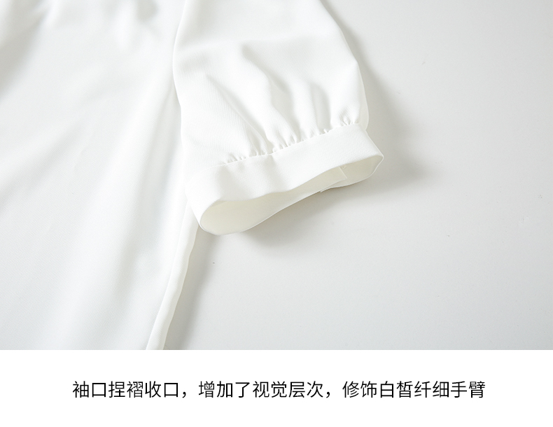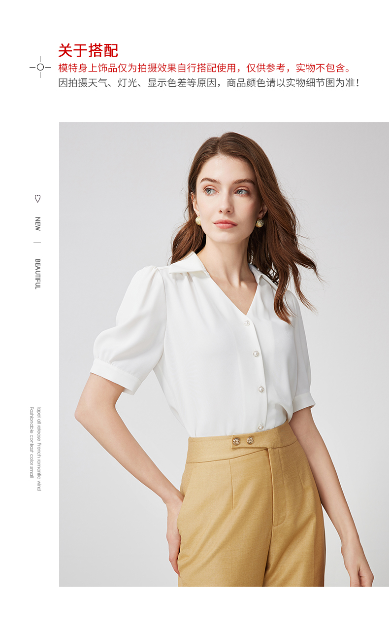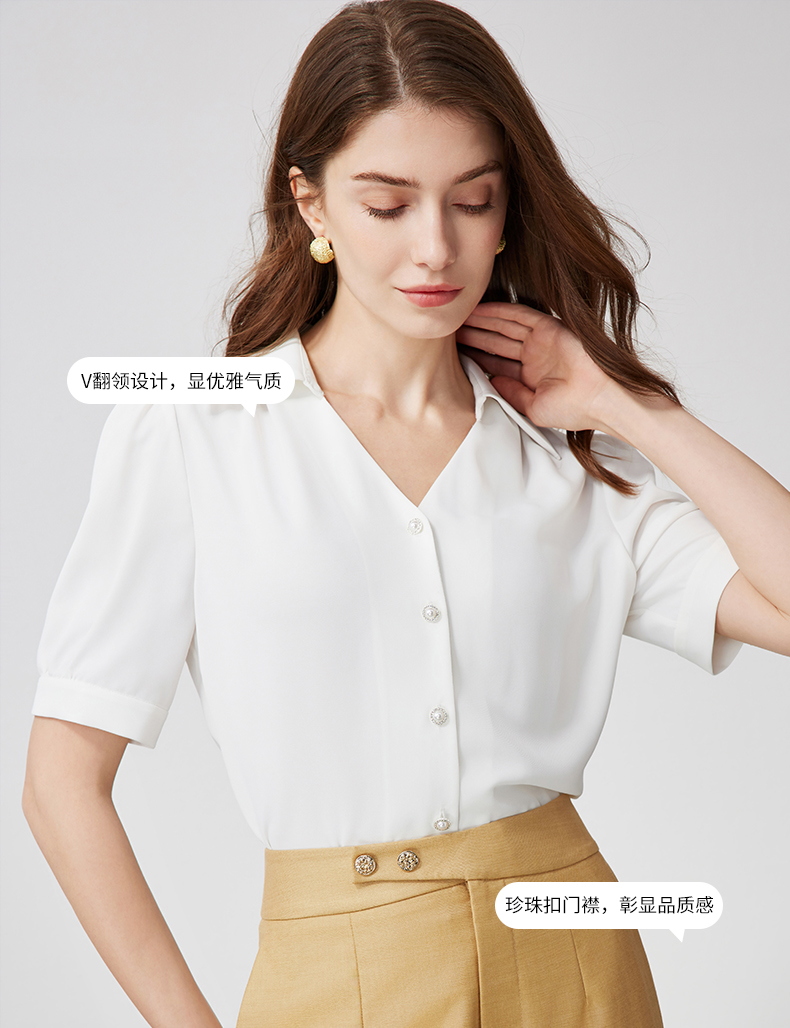 EITIE爱特爱夏季新款气质通勤V领显瘦灯笼袖白色短袖衬衫上衣B2409302
