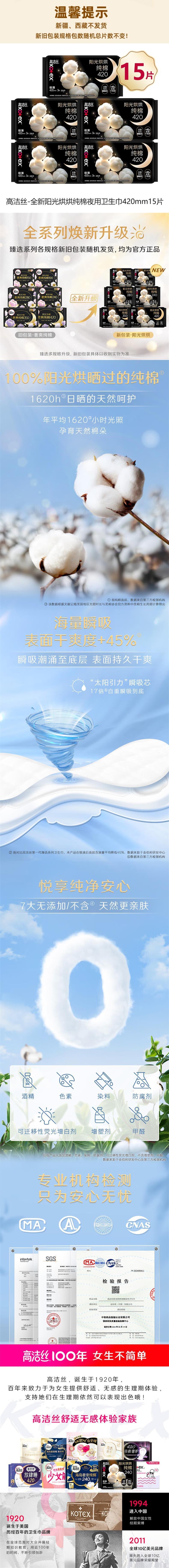 高洁丝 全新阳光烘烘纯棉夜用卫生巾420mm3片*5包 JGS0HY3P5B
