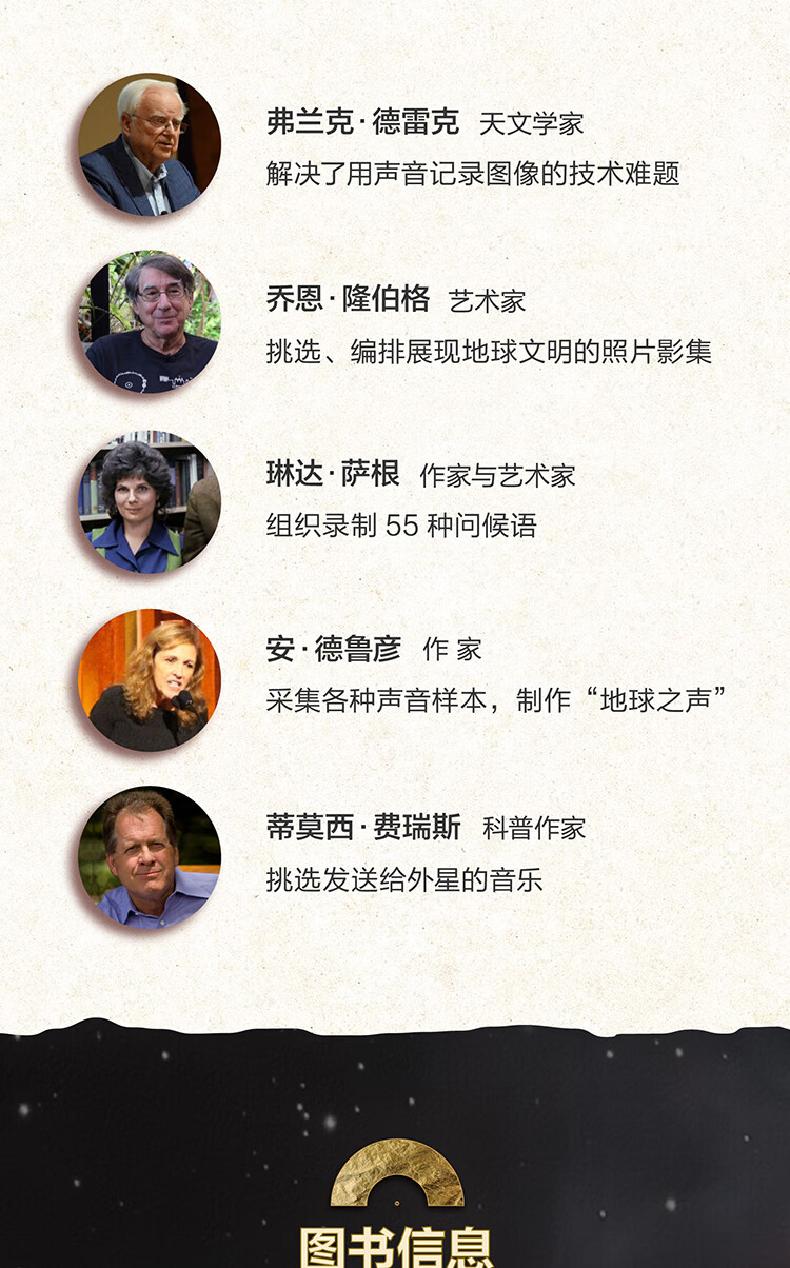 《星际唱片:致外星生命的地球档案》收录了这张金唱片的全部内容,并带有详细解说。作为这段传奇的亲历者,唱片原班制作团队从他们各自的角度讲述了这张唱片从构想变为现实,并终飞入太空的故事。