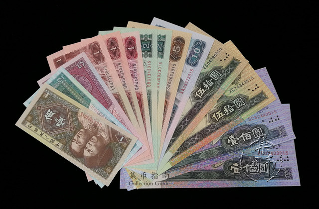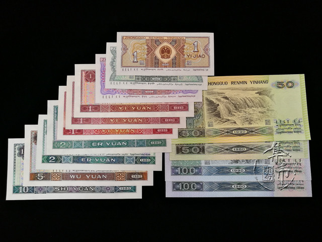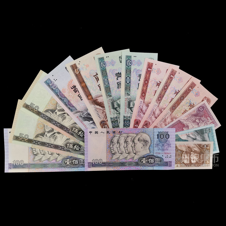 含9种面值14种券别:80版100元劵一枚、90版100元劵一枚、80版50元劵一枚(第四人民币钞王)、90版50元劵一枚、80版10元劵一枚、80版5元劵一枚、80版2元劵一枚、90版2元劵一枚、80版1元劵一枚、90版1元券一枚、96版1元劵一枚、80版5角劵一枚、80版2角劵一枚、80版1角劵一枚,共14张。