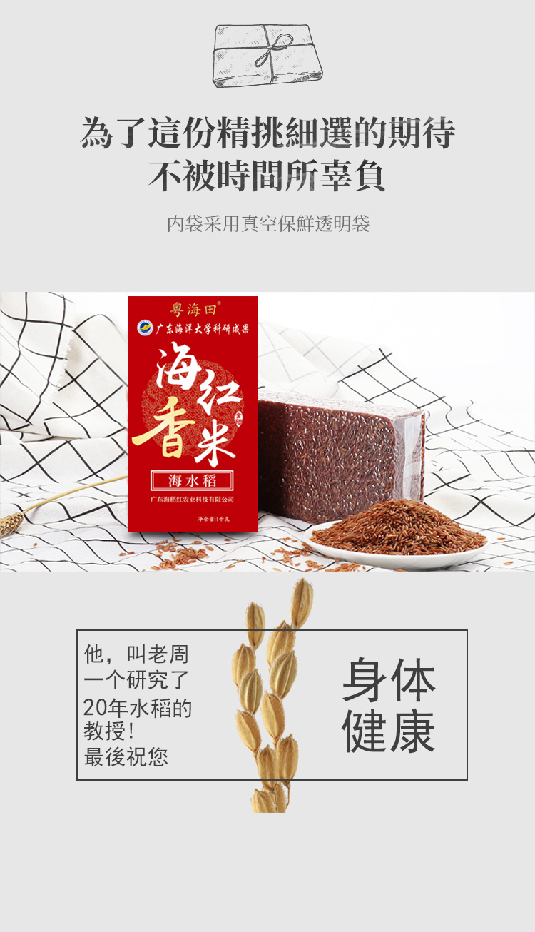 海红香米种植于海田边,平时吸收海水滋养灌溉长大,里面的抗性淀粉比较多,适合血糖高的人群食用,米质有一些硬。