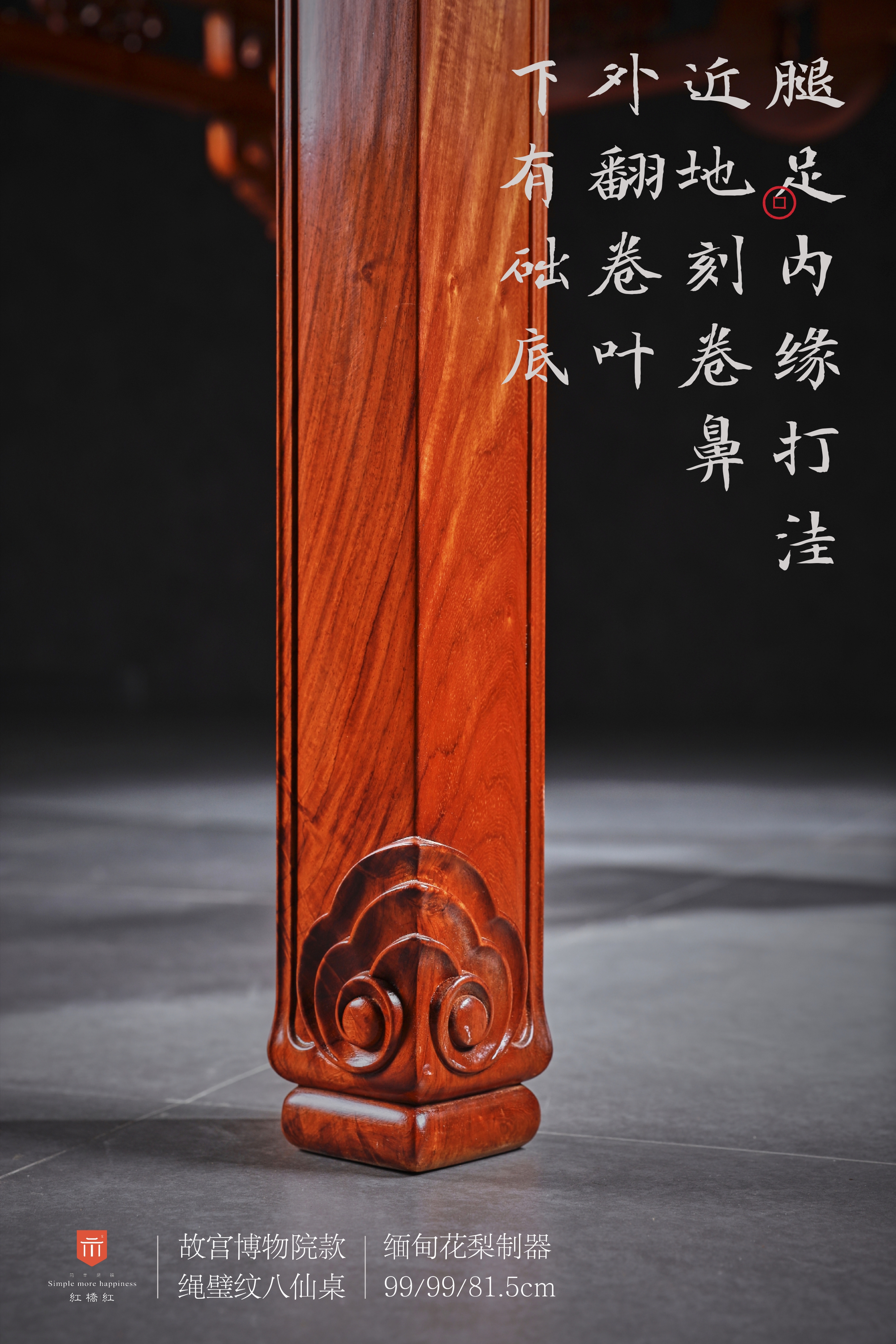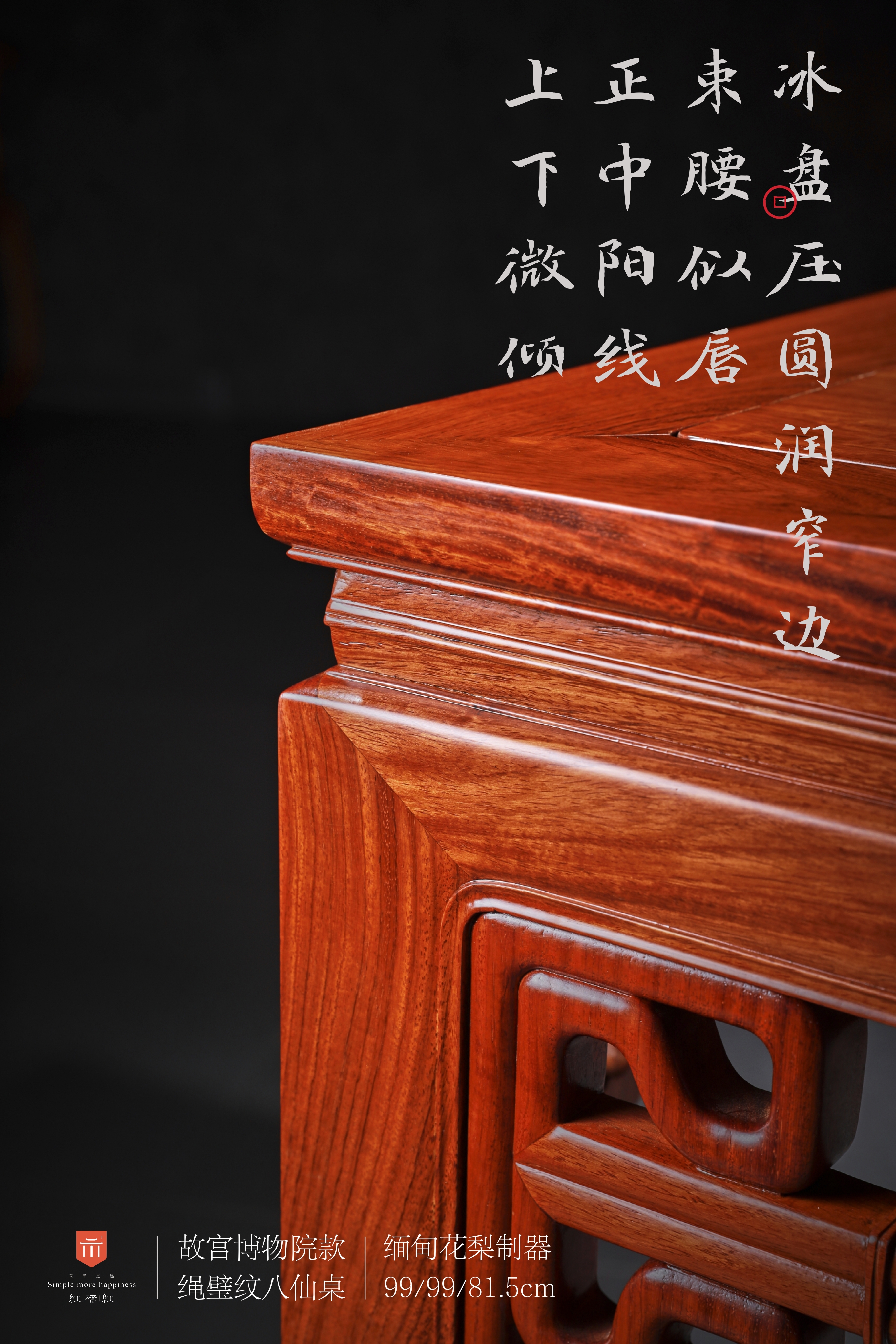 绳纹早至石器时代就被广泛以拍印手法应用于陶器。玉璧则自三代以来即为礼制重器,《周礼•春官》中有云:以苍璧礼天。含有示君权受命于天的明确指向。而绳璧纹的流行则自乾隆朝起,宫廷礼器、祭器、家具、饰品等的应用大行其道。此方桌原型亦来自故宫博物院藏清红木制。