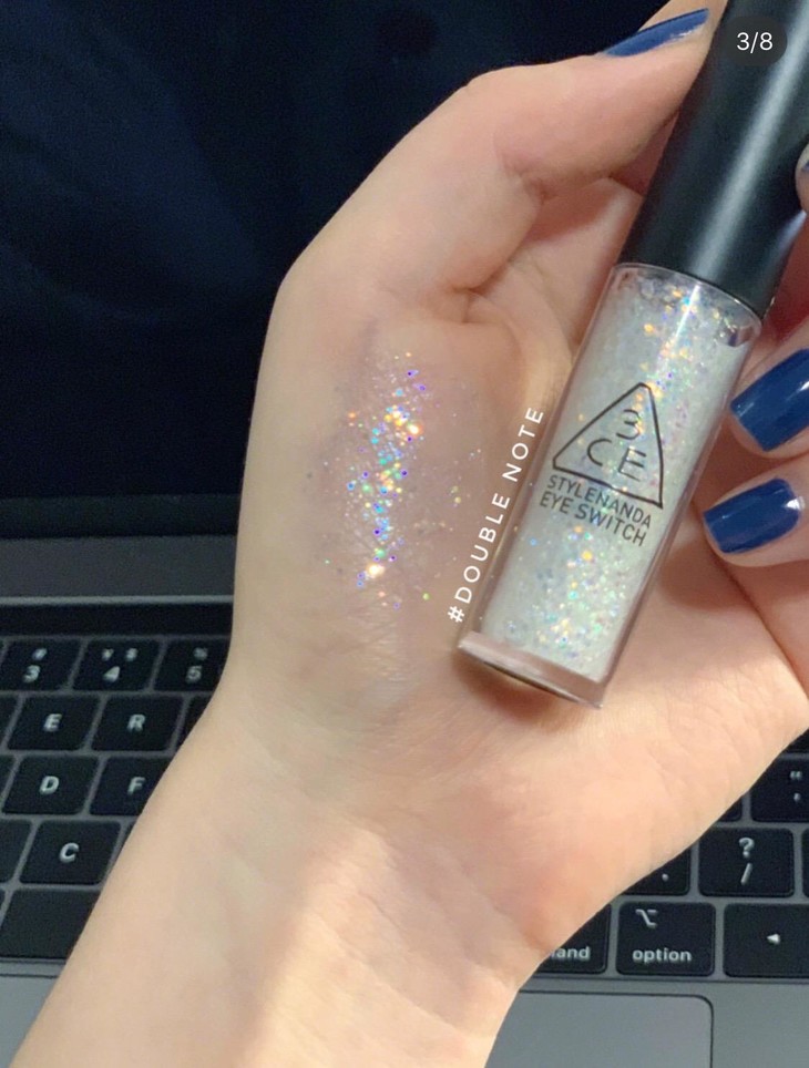 3ce眼影亮片#double note👍透明胶为底,大小亮片混合其中。偏光颜色也搭配得超级好,独角兽蓝💙,小鸭黄💛,仙女紫💜,闪闪白。上眼以后分布各处,有种此起彼伏blingbling✨ ,真正做到了星光点点,泪光闪闪的感觉💓。