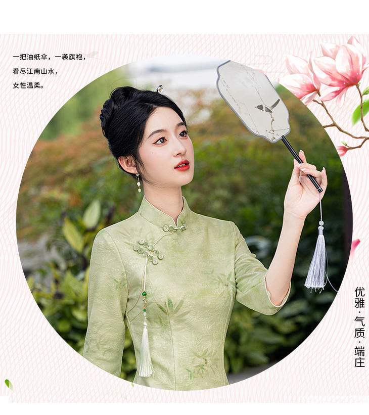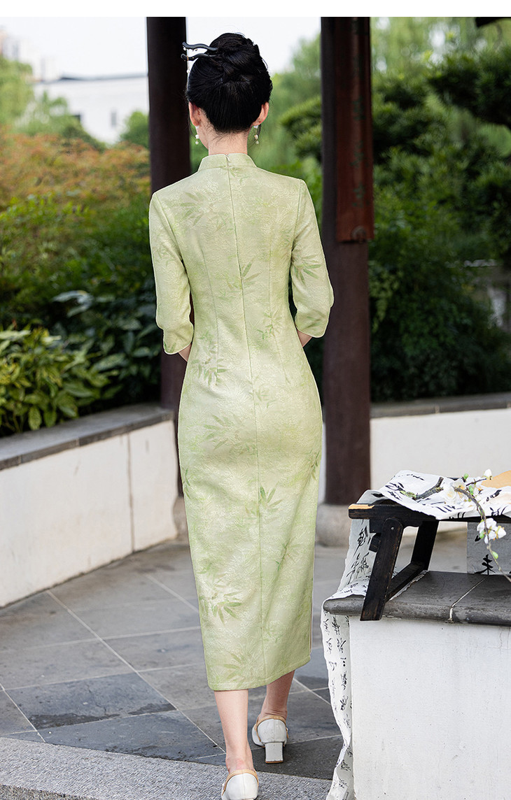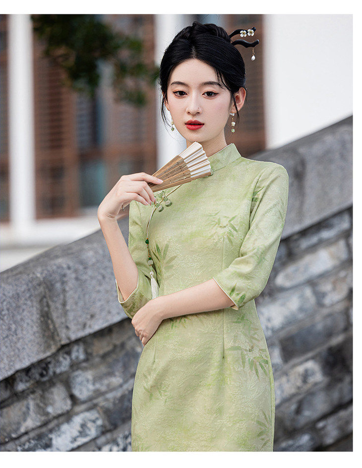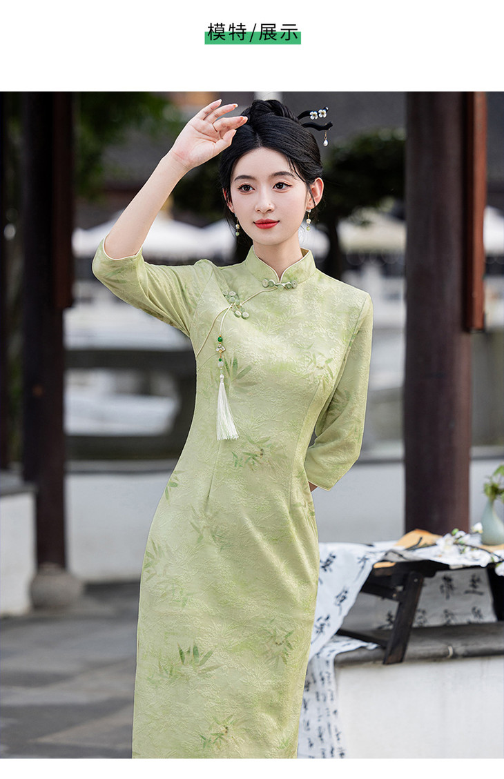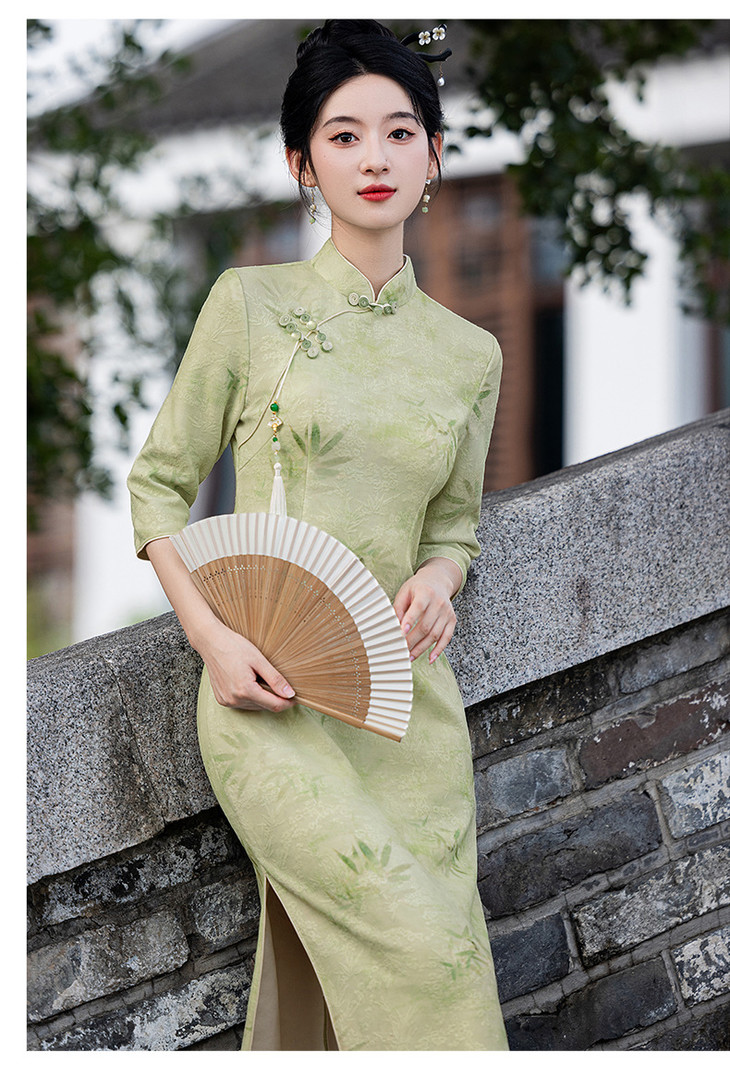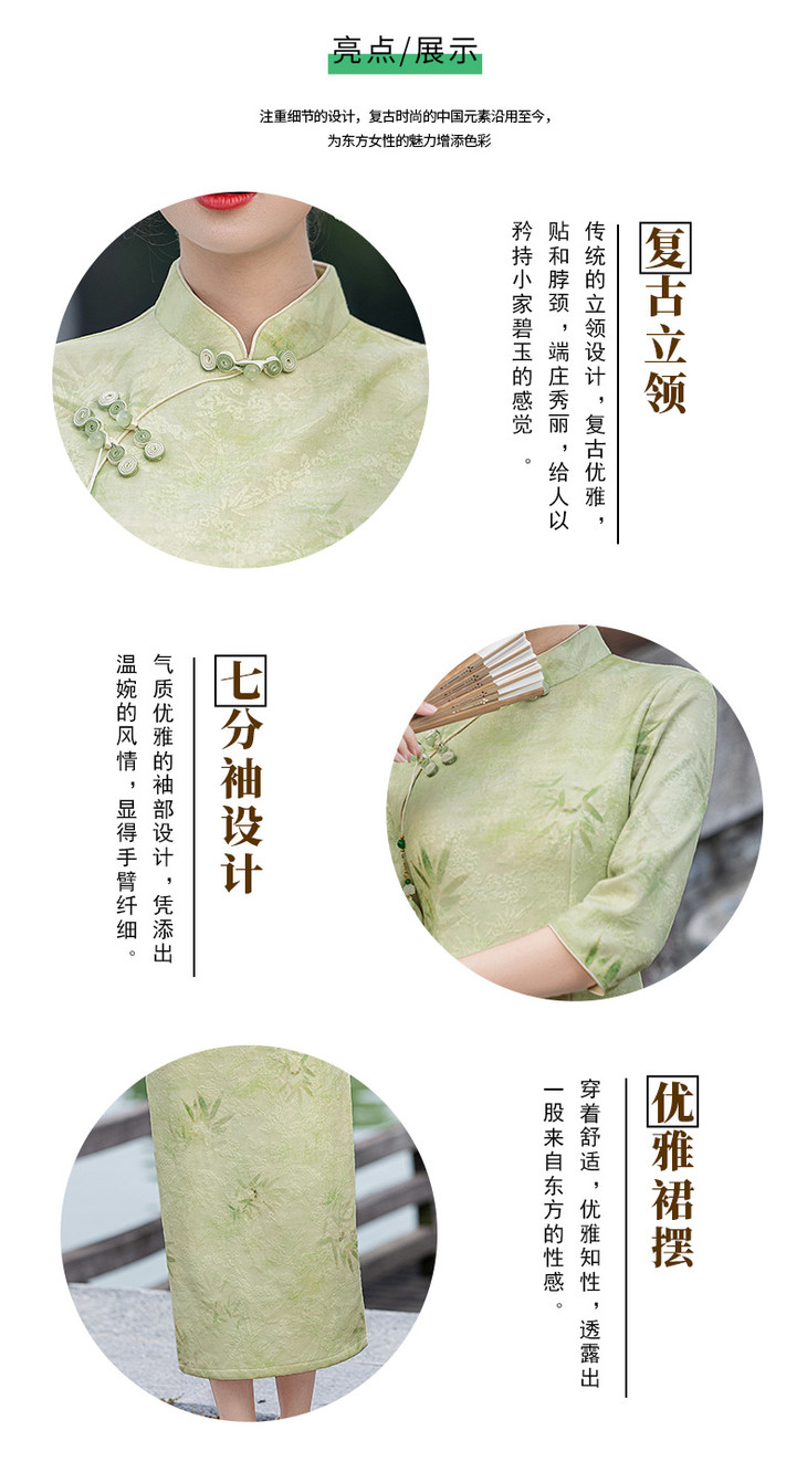 秋冬新款时尚气质改良国风新中式绿色竹叶提花旗袍MLS6975