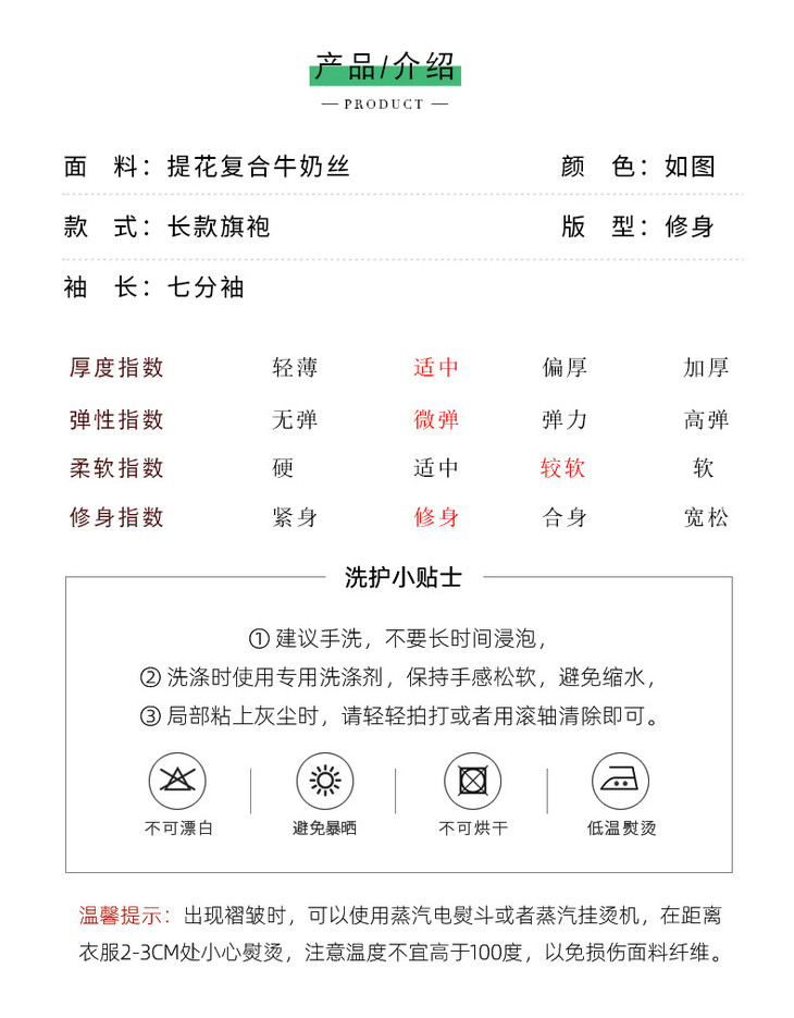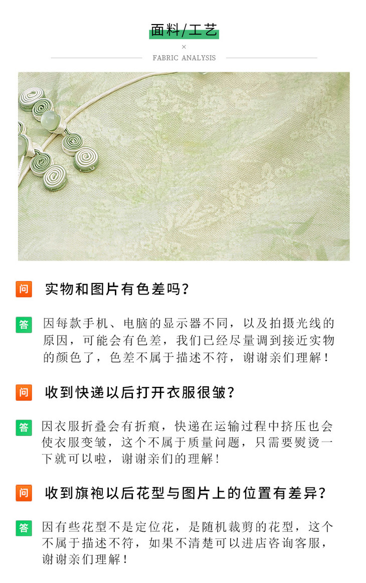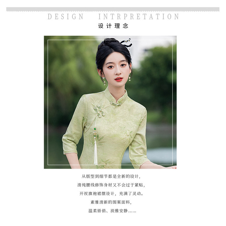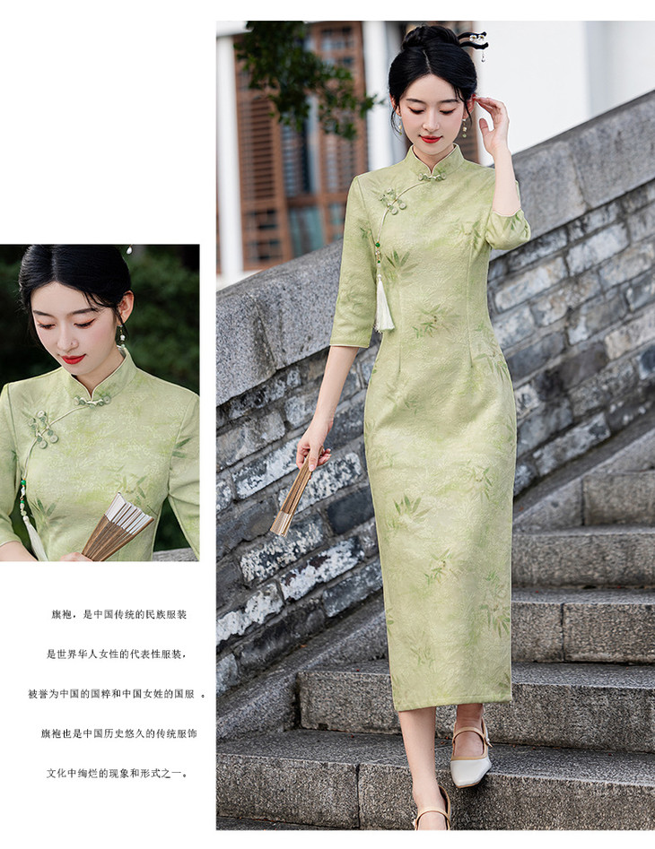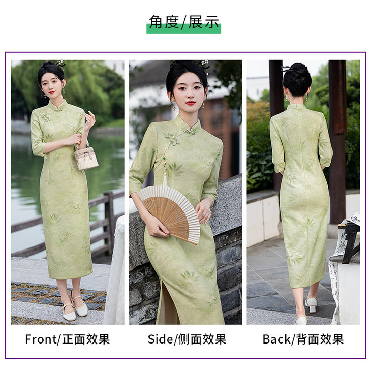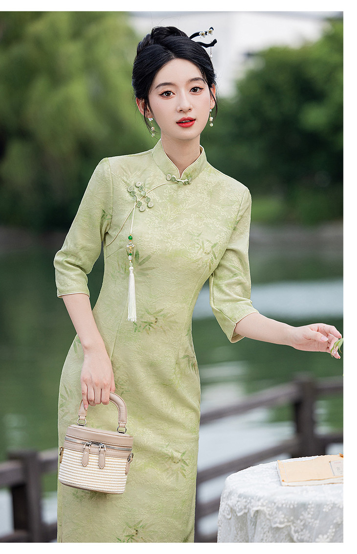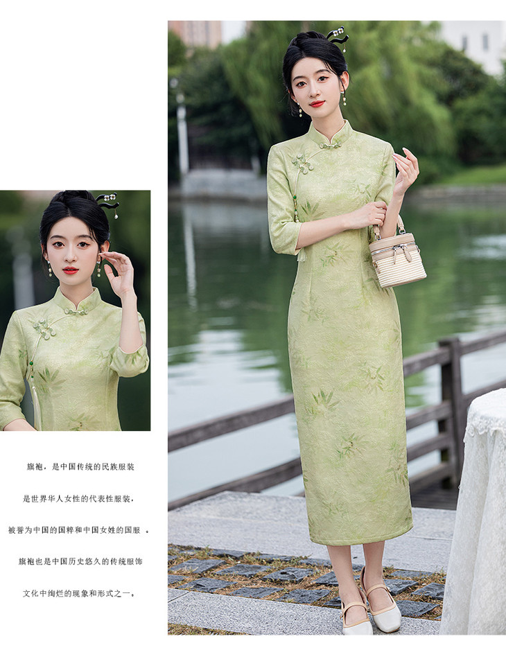 秋冬新款时尚气质改良国风新中式绿色竹叶提花旗袍MLS6975