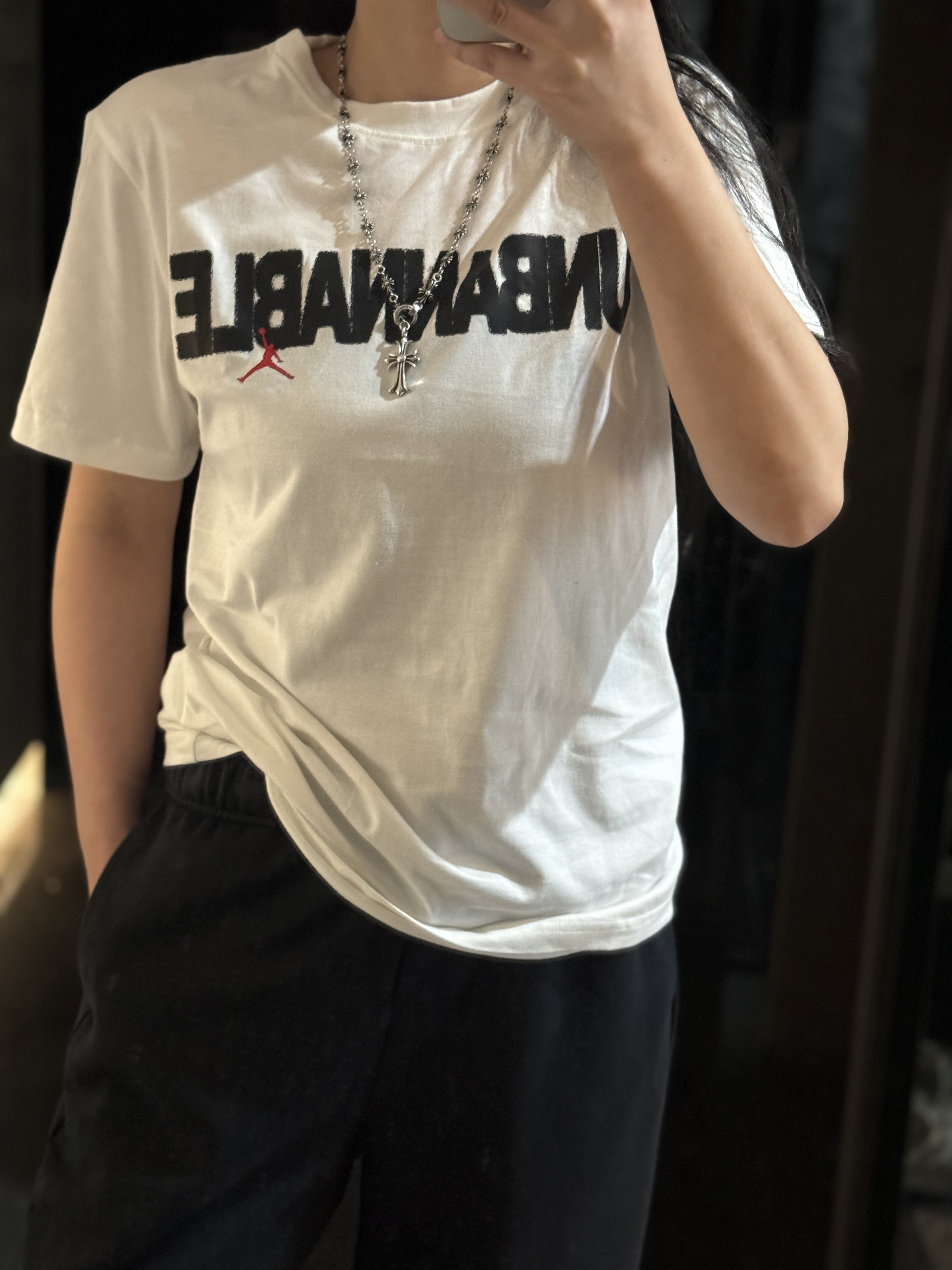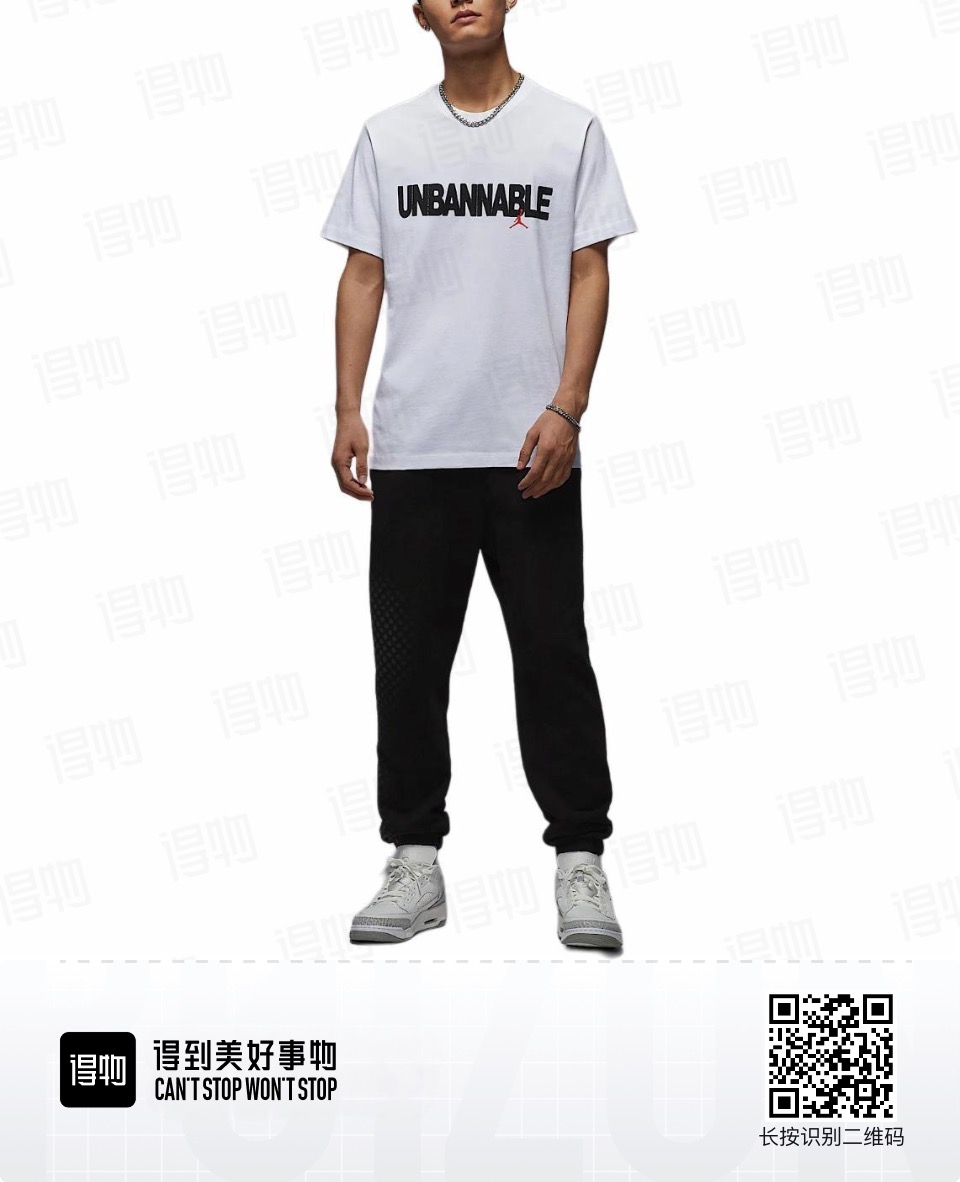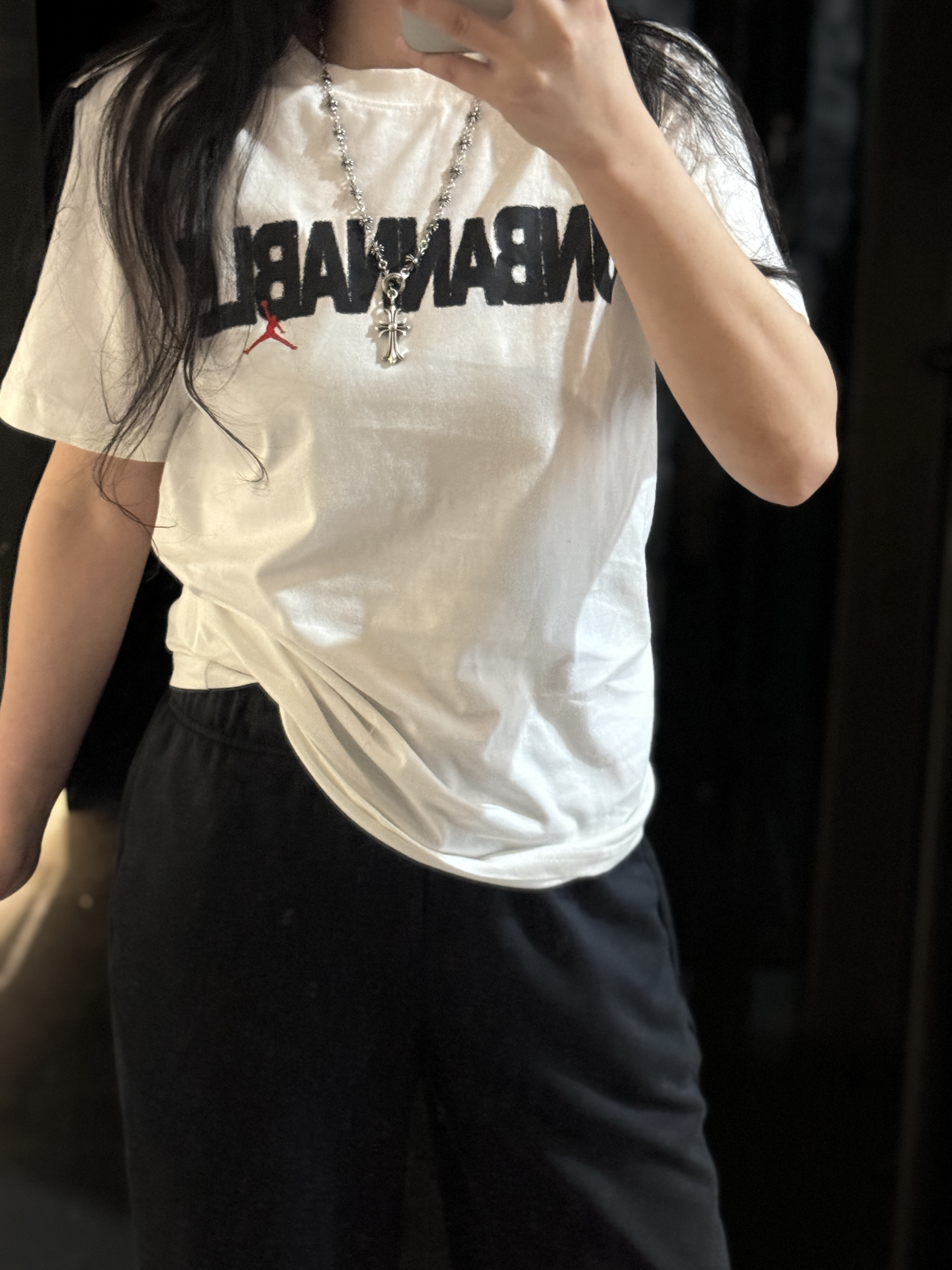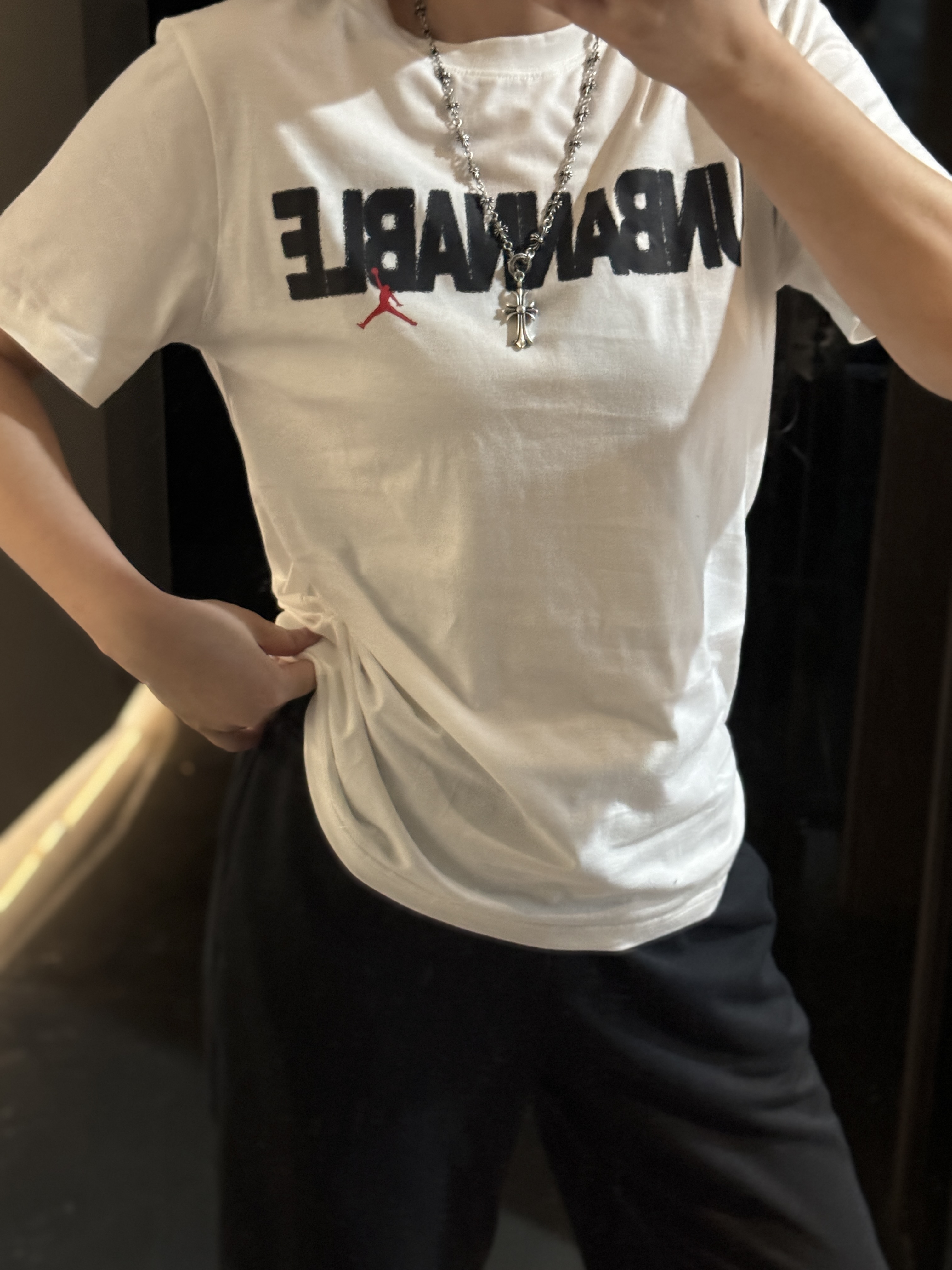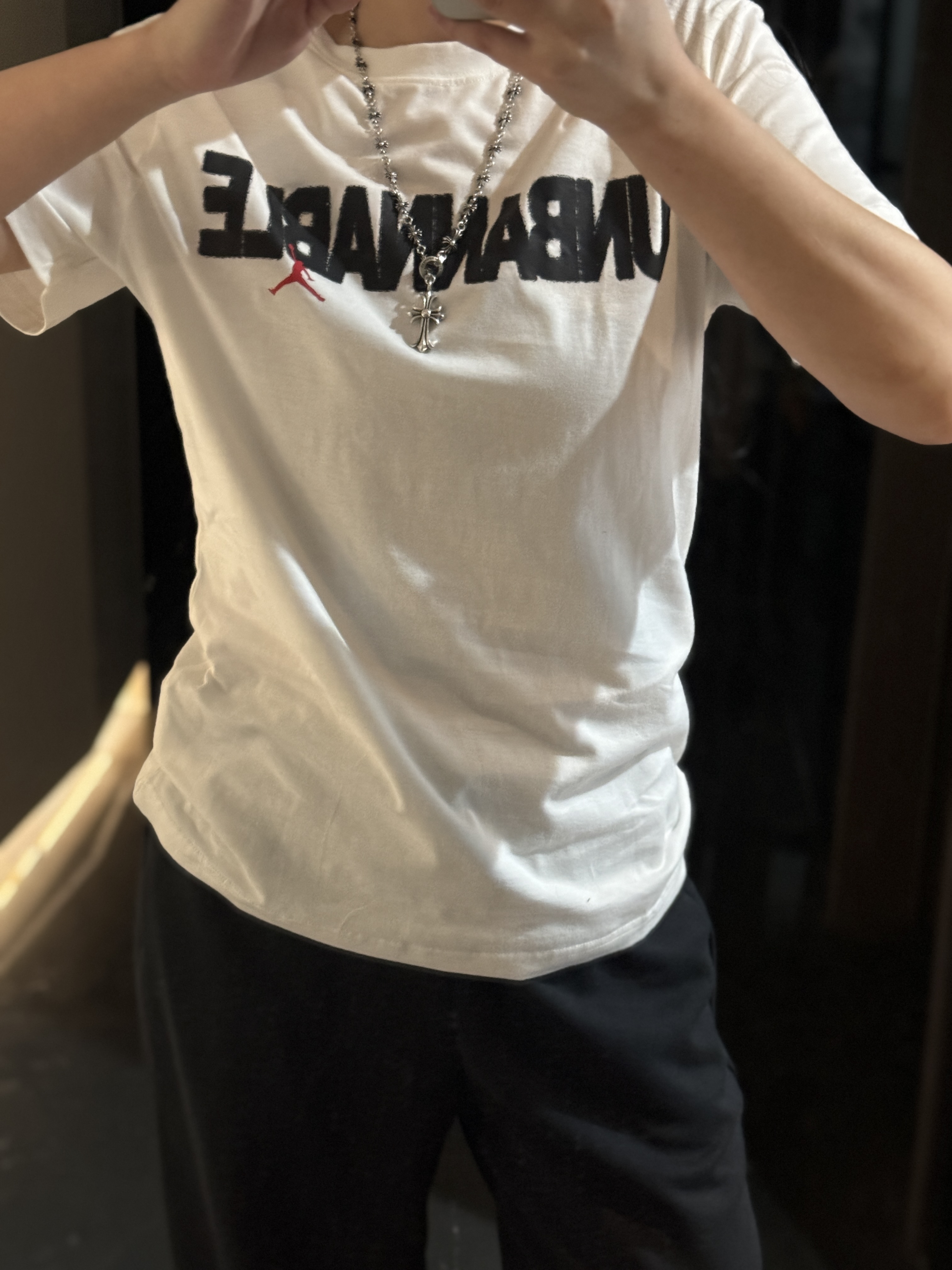 白T恤+黑裤+银链基础搭配,胸前「UNBA&NNABLE」大字+红色Jumpmanlogo简约却炸街!自拍挡脸也能秒变氛围感帅哥