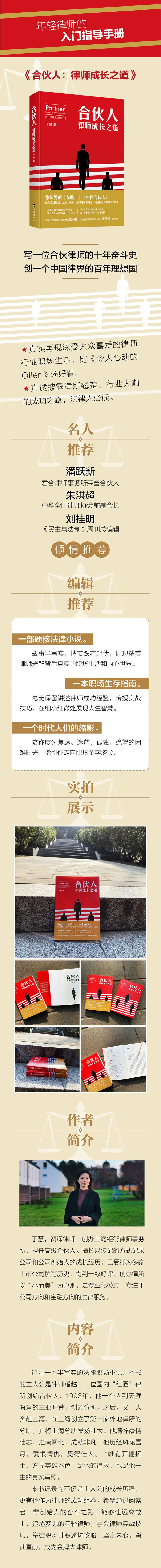 我的学生丁慧写了一部律政小说《合伙人:律师成长之道》。她是一个被法律耽误了的作家,又因为写小说,耽误了她成为一个大律师。“两栖型”的人才要么平庸,要么卓越,但凡两头通吃的时候那可不得了。记得当年毛主席就夸陈毅元帅“上马能打仗,下马能赋诗”,是诗人元帅。如果丁慧的律政小说《合伙人:律师成长之道》一炮而红,她有可能成为“出庭能打官司,在家能写小说”的作家律师或者律师作家。