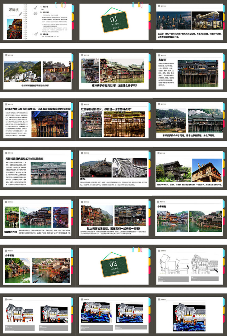 1.了解吊脚楼的文化,表现出吊脚楼的造型。