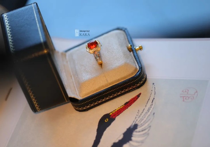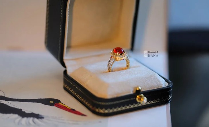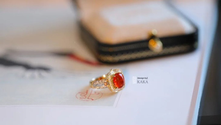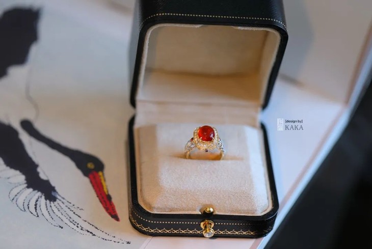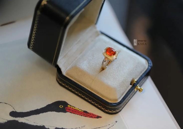 欧珀如童话般的色彩,一直是热爱童话的设计师我这种人的爱,之前蓝色幻彩铁欧珀用的多,偶尔尝试这火欧珀,有着极其热烈的橙红色,幻彩流星,配以钻石黄金,更是饱满华贵,需火之人必备。