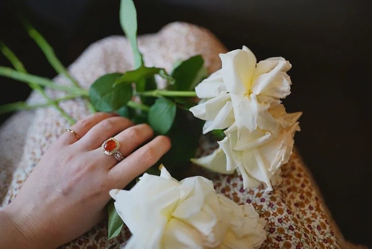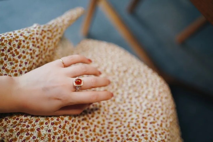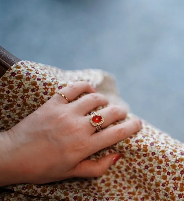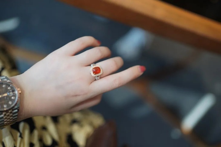 红色的宝石,是最提气的,火欧珀比红翡翠和红宝石,多了一点浪漫灵动的气质,它素面却流光溢彩,轻盈又显白。