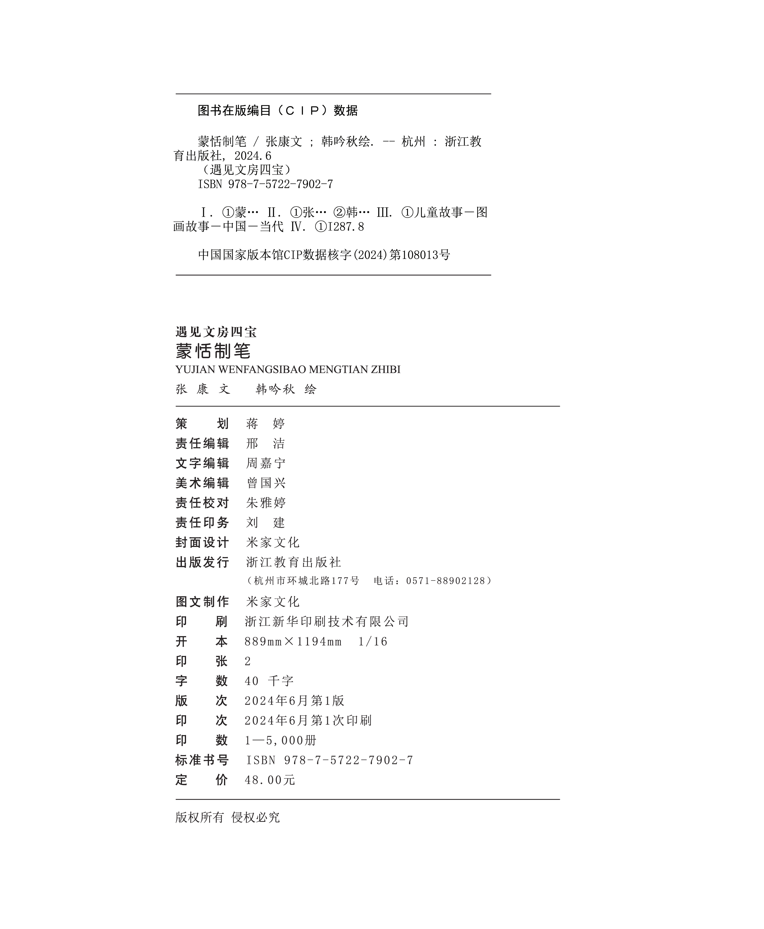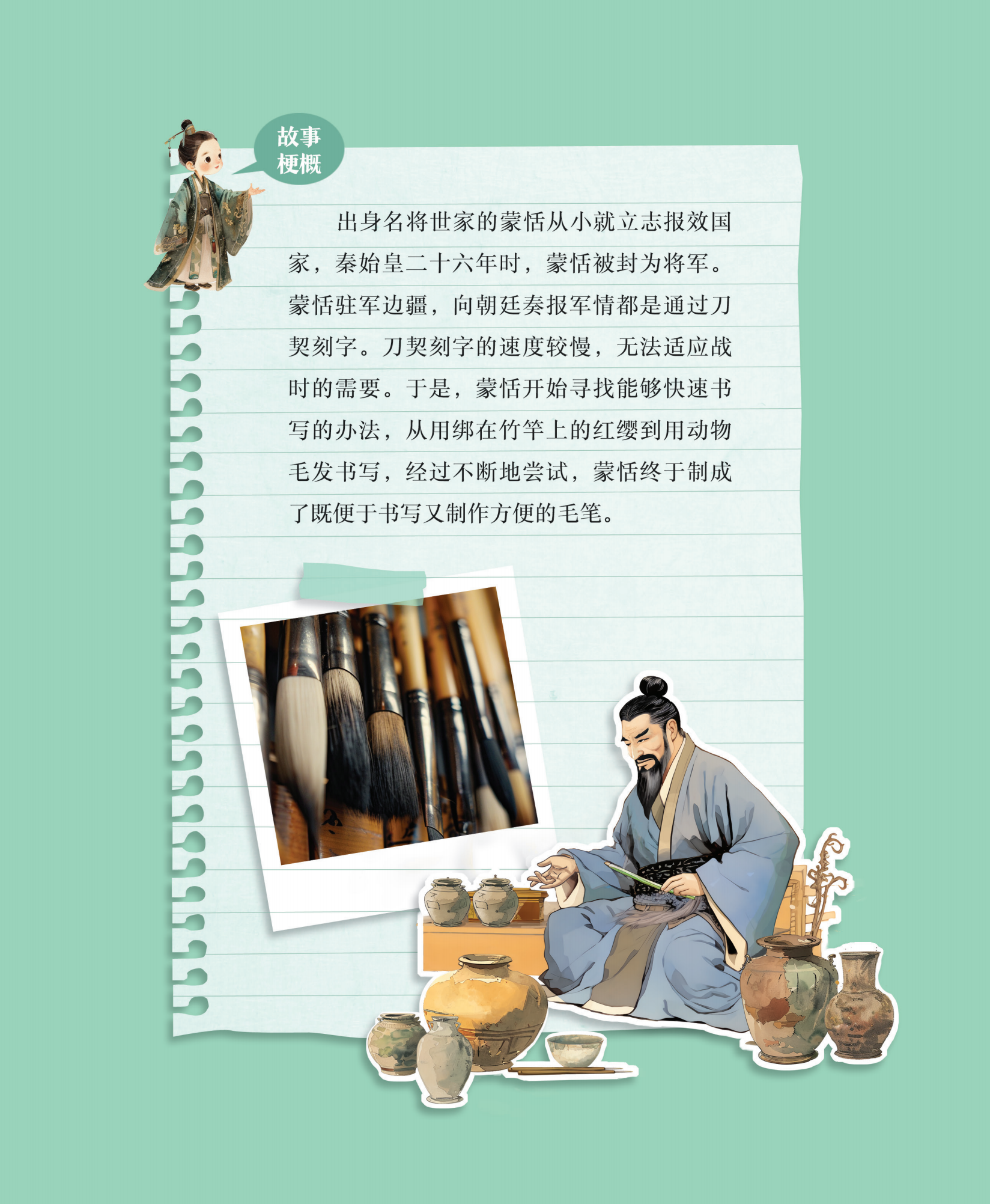 本书从各地区广为流传的民间故事着眼,围绕中华千年历史文化,提炼出具有代表性的蒙恬制笔故事,将可触可感的表达形式与富含中华美学的动漫形象相结合,是一本兼具可读性与易读性的现代绘本。本书以大量精美的绘图,辅之以深入浅出的文字描述,描绘了一位骁勇善战、精忠报国的边塞将军根据从军经历制作、改良毛笔的民间故事,带领读者走近文房四宝之一的“毛笔”的诞生,为孩子打开与历史人物对话的闸门,提升少年儿童对传统文化的兴趣和认同感。