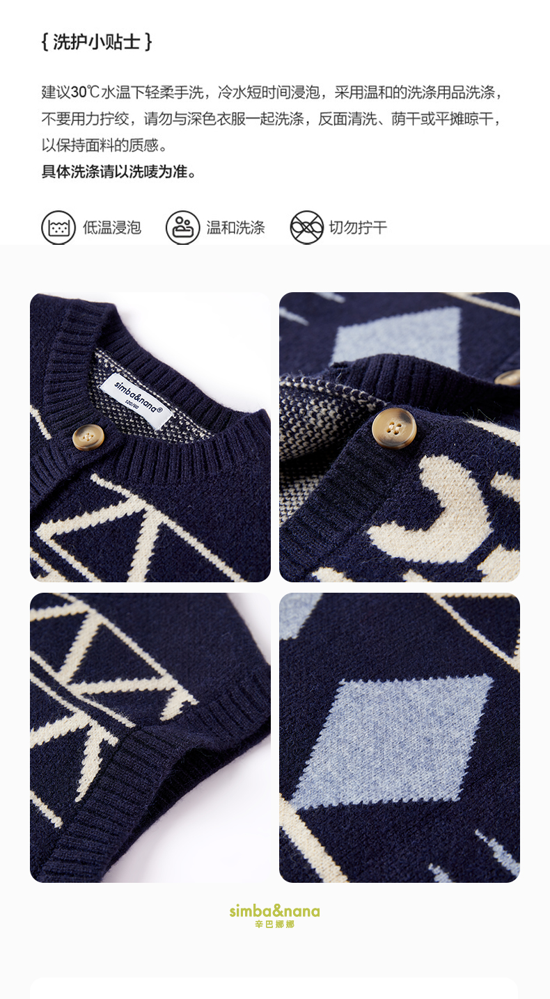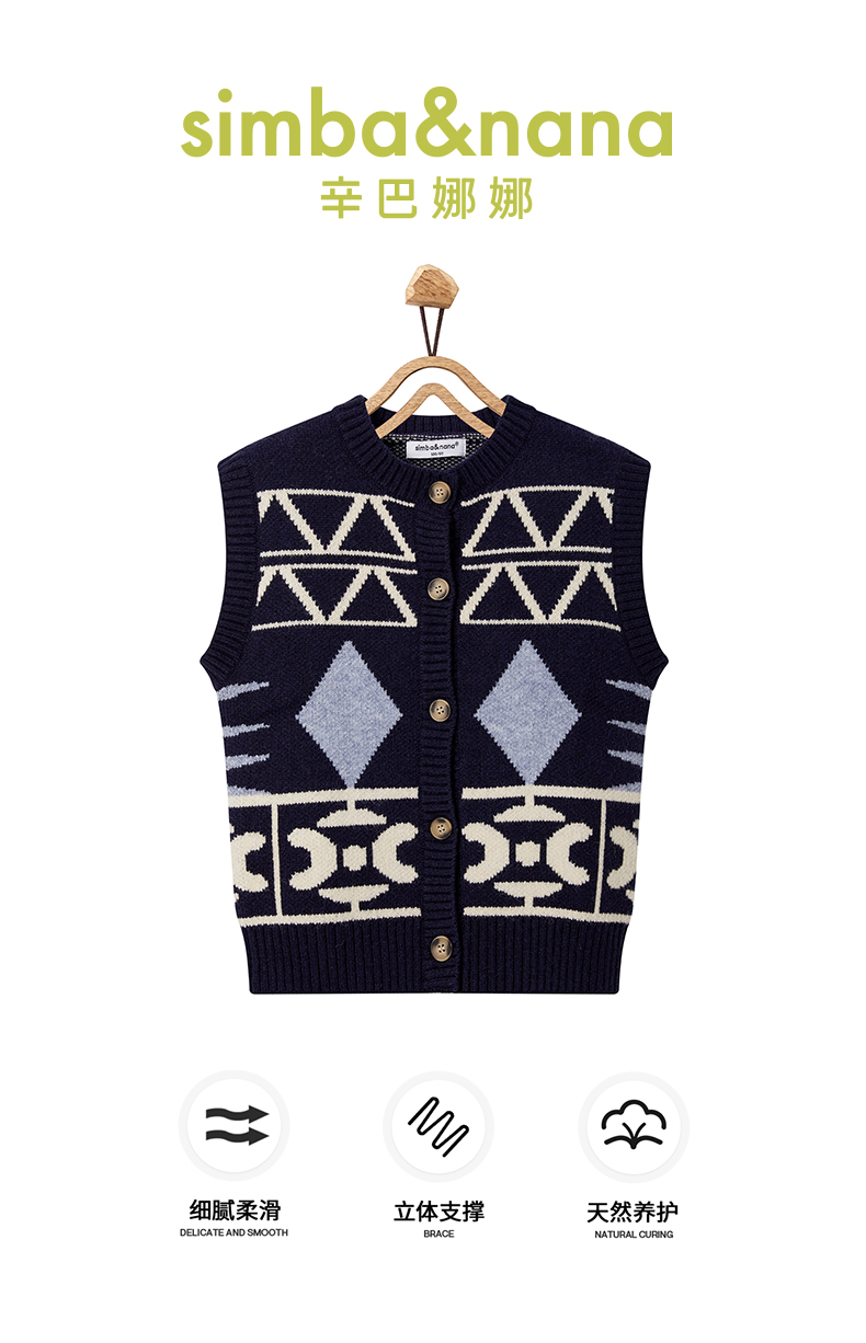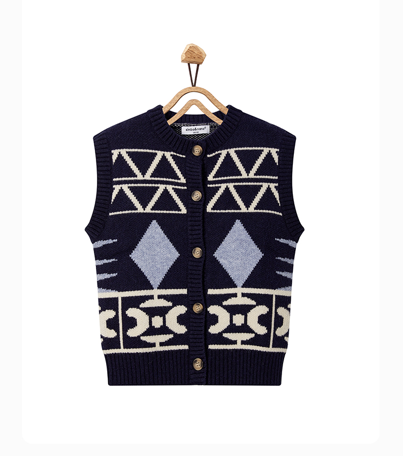 【辛巴娜娜】simbanana秋新款女中大童复古提花拼色外搭学院风开衫针织背心马甲