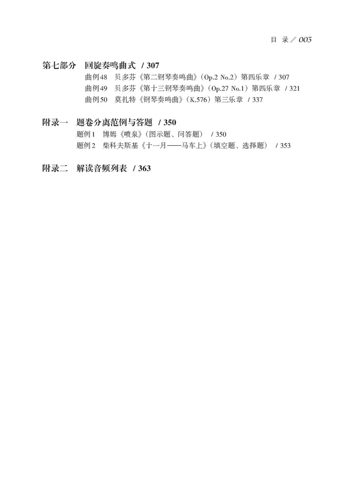 本书是一本包含和声与曲式分析的曲式学考试经典案例集。作者根据本科考试和考研命题特点,选择了50首谱例的典型乐曲进行和声分析和曲式分析。本书分为7个部分和附录,每个部分对应一种典型的曲式类型,按结构由简单到复杂的原则排列:单二部曲式、单三部曲式、复三部曲式、变奏曲式、回旋曲式、奏鸣曲式、回旋奏鸣曲式。作品分析由三个部分组成:(1)清晰的乐谱分析,标注了曲式结构、调式调性、和弦、终止式等,有些还标注了主要材料的发展方法;(2)规范的曲式结构分析图式,简约、严谨;(3)详细的分析报告,突出重点、要点。分析内容紧扣试题要点,兼顾普及性与典型性,既可以直接作为考试答题的参考,又对其他题型的试题具有基础分析和示范答题的参考意义。 |
