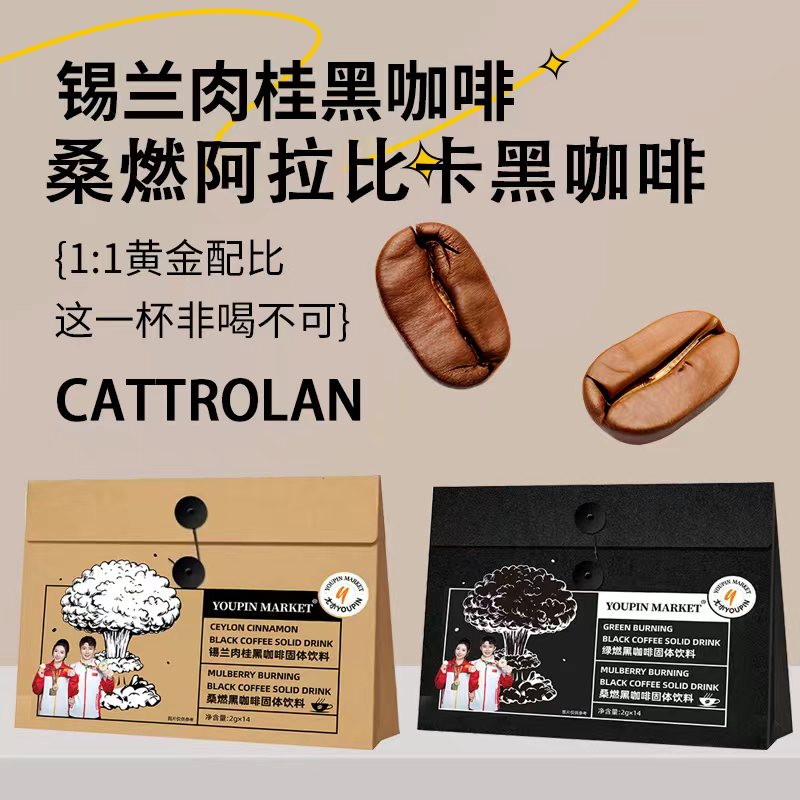 CATTROLAN减脂黑咖啡 阿拉比卡咖啡豆+绿咖啡豆!0糖0卡0热量 口感丰富 饱腹感强 冷热双泡速溶便携包装随泡随喝 ins爆火黑咖啡 全球打卡14条/袋