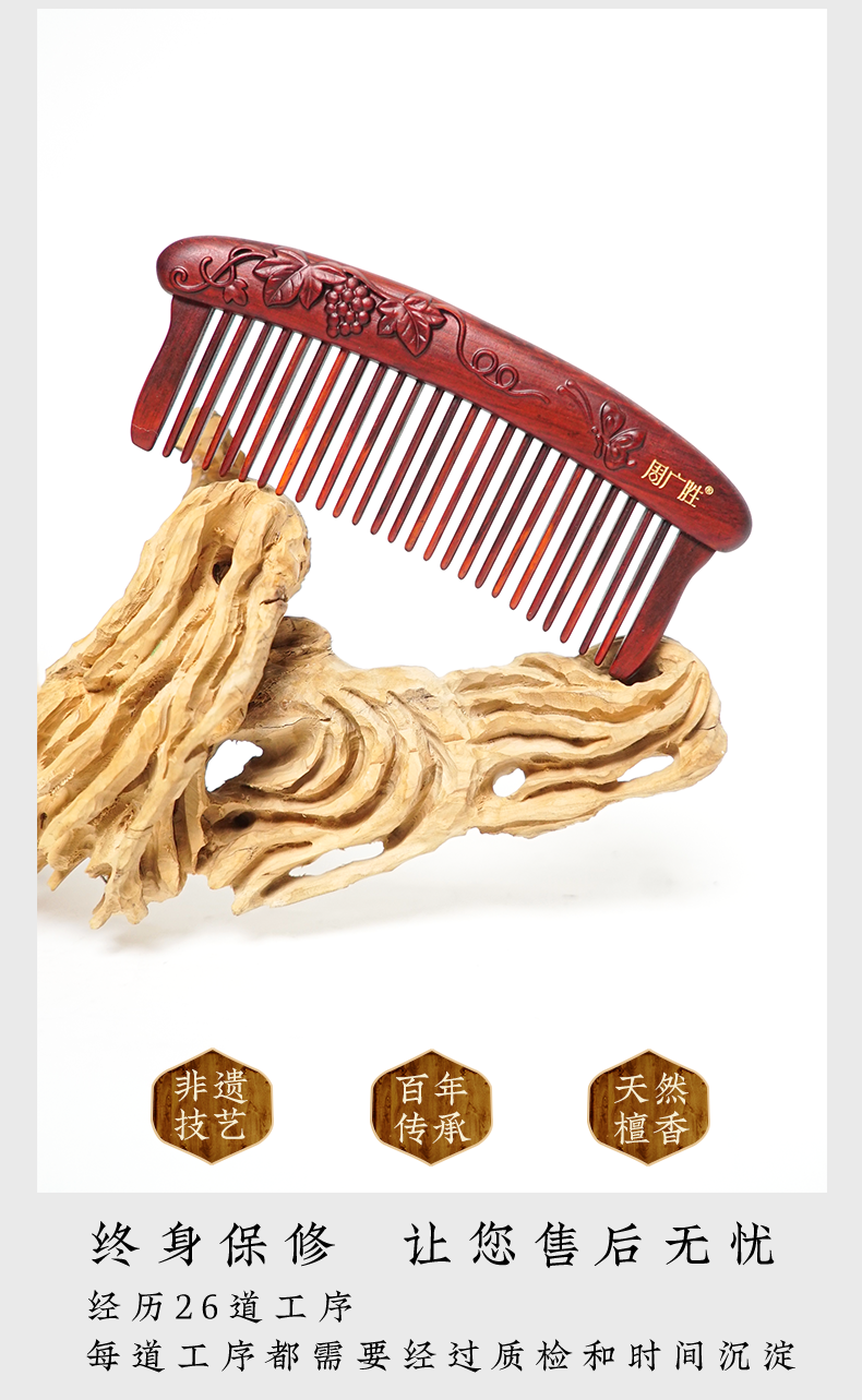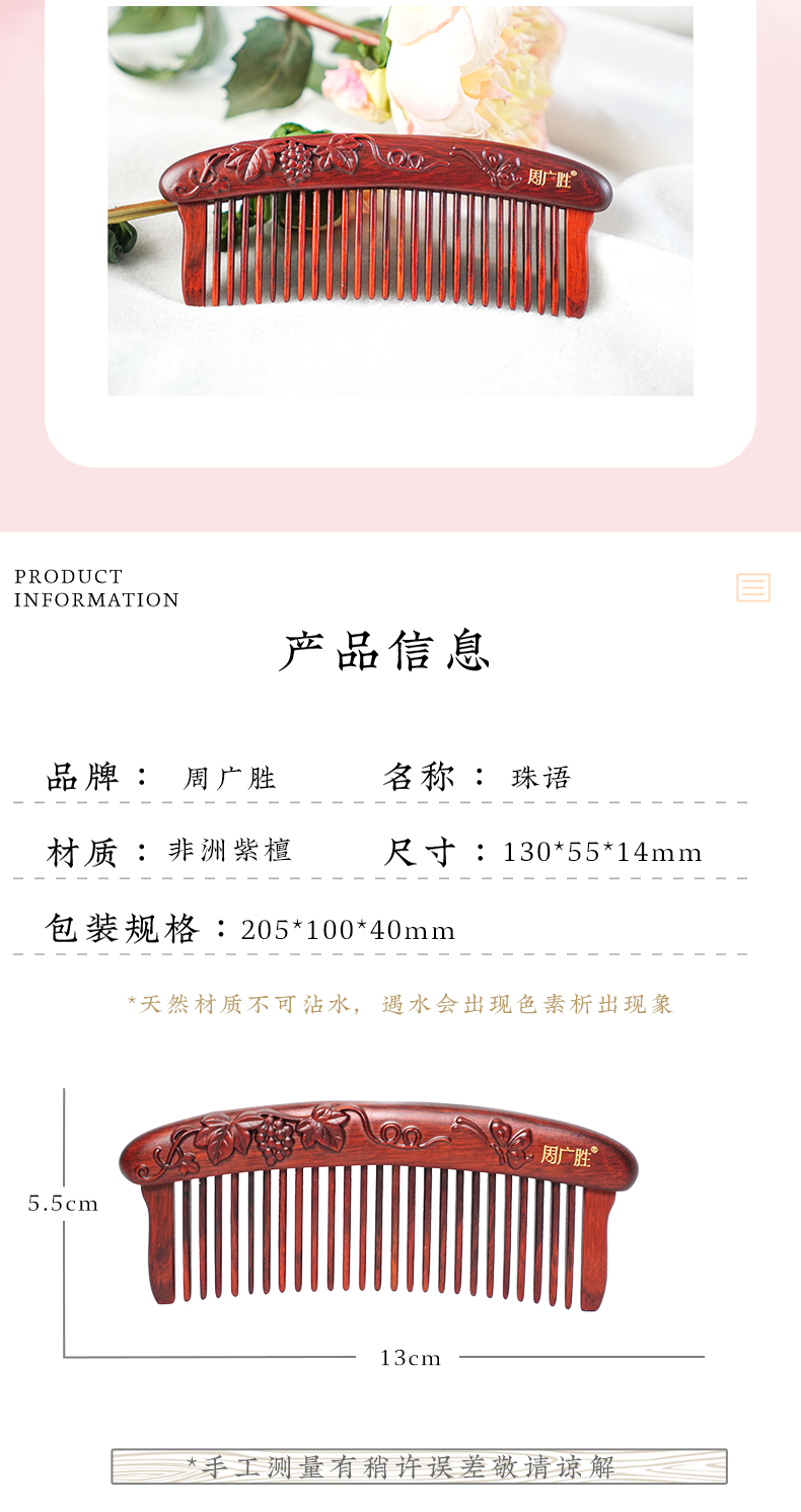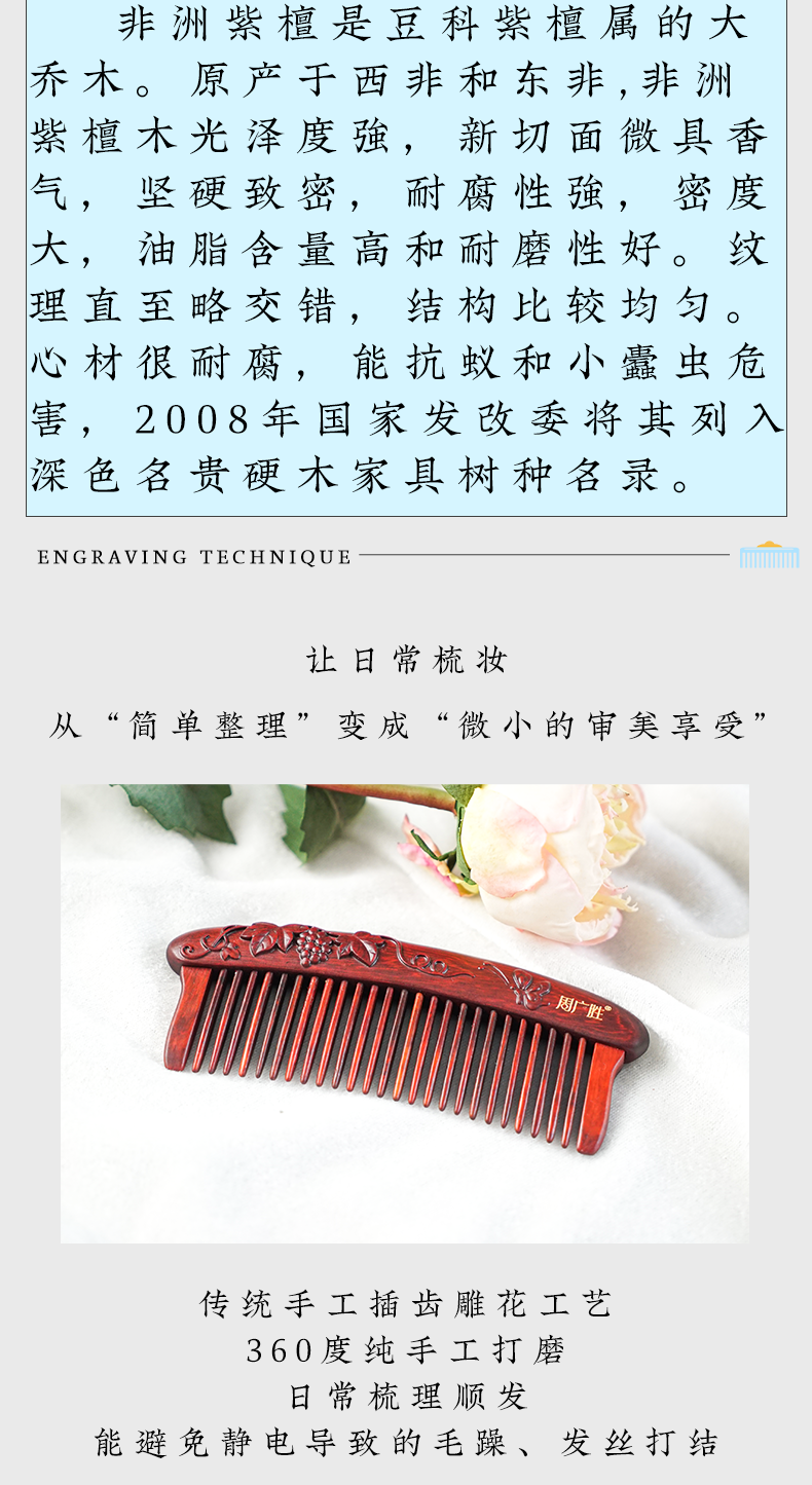 周广胜紫檀雕花珠语防静电按摩插齿梳子女士专用护发顺发礼盒