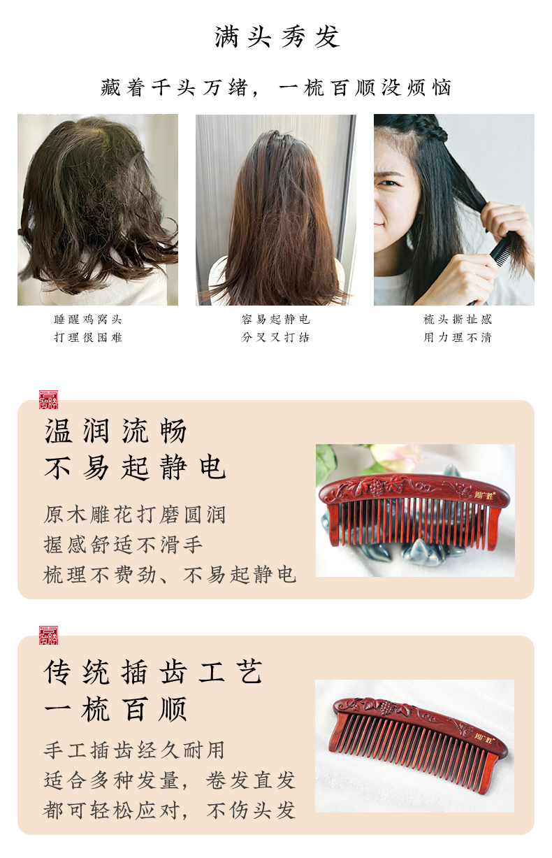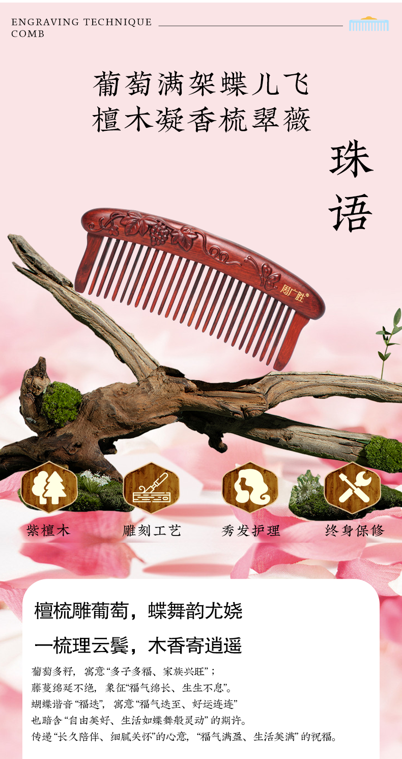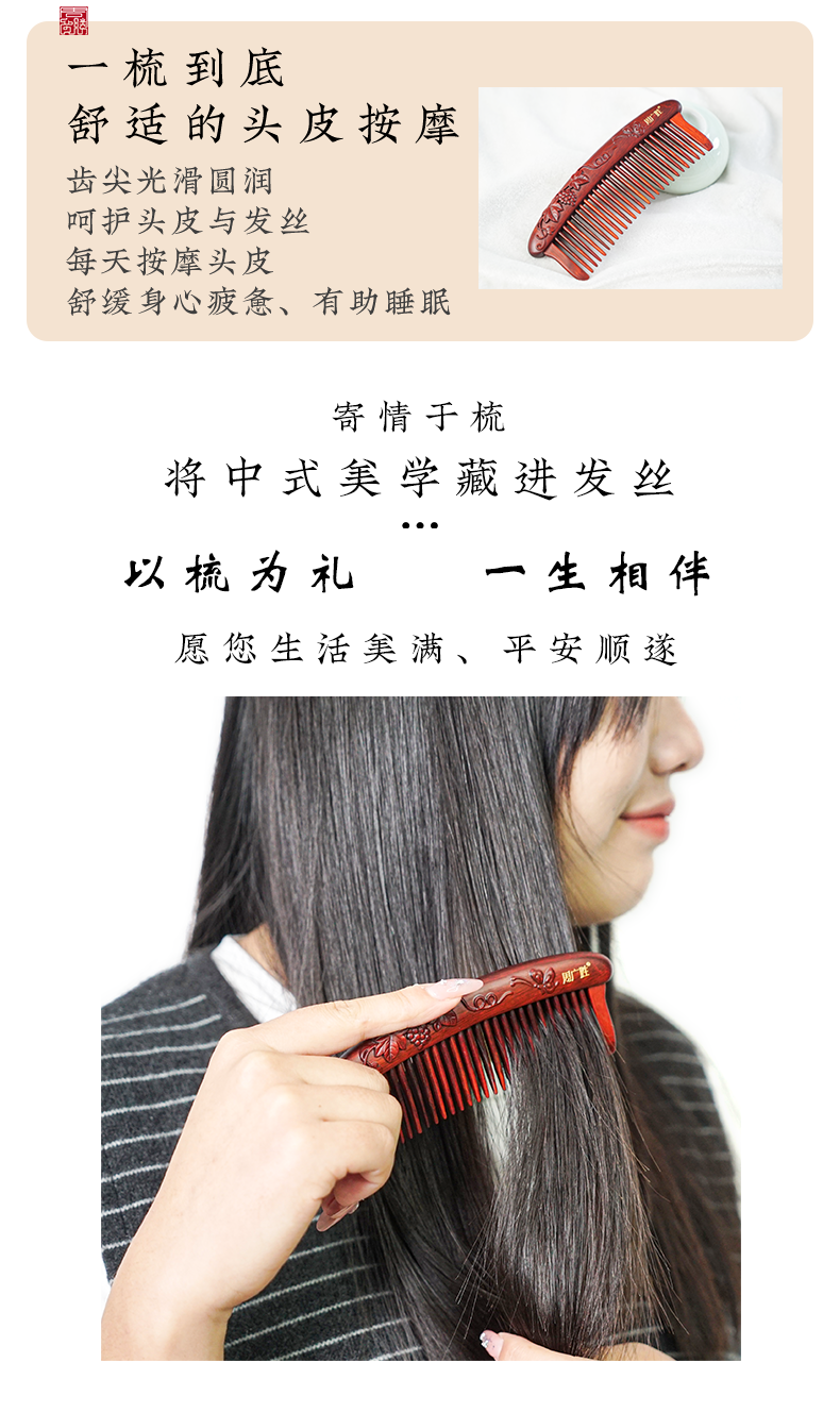 周广胜紫檀雕花珠语防静电按摩插齿梳子女士专用护发顺发礼盒