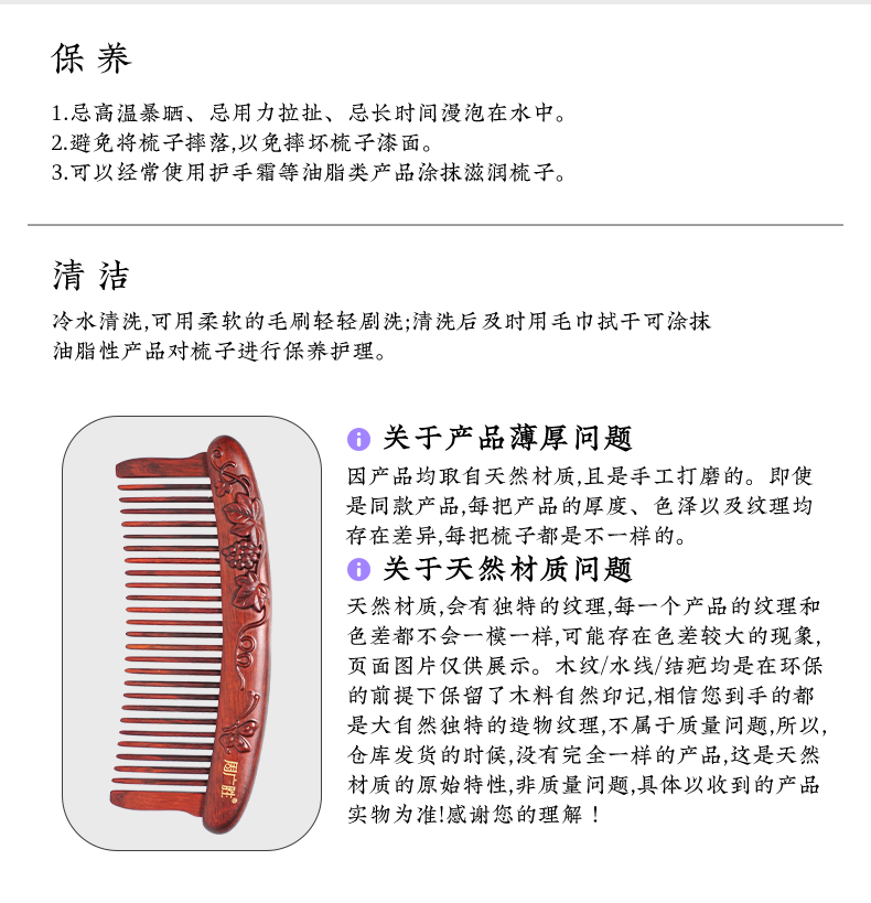 周广胜正品南美酸枝绶带鸟合木梳防静电个人清洁护理送女士长发家用便携