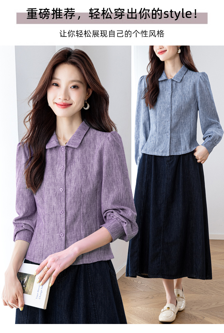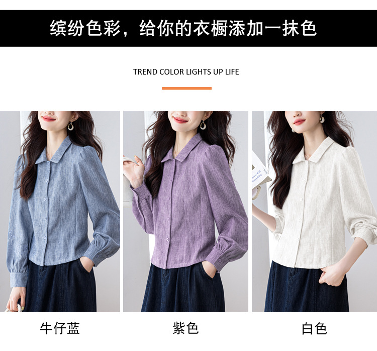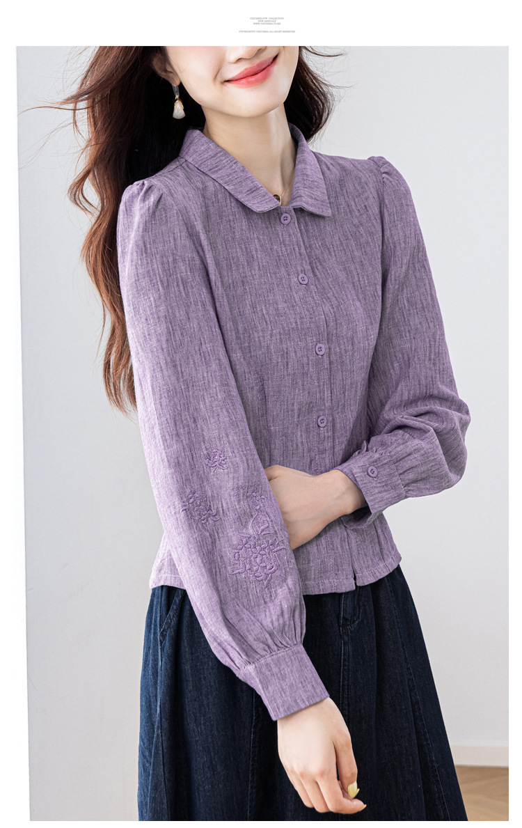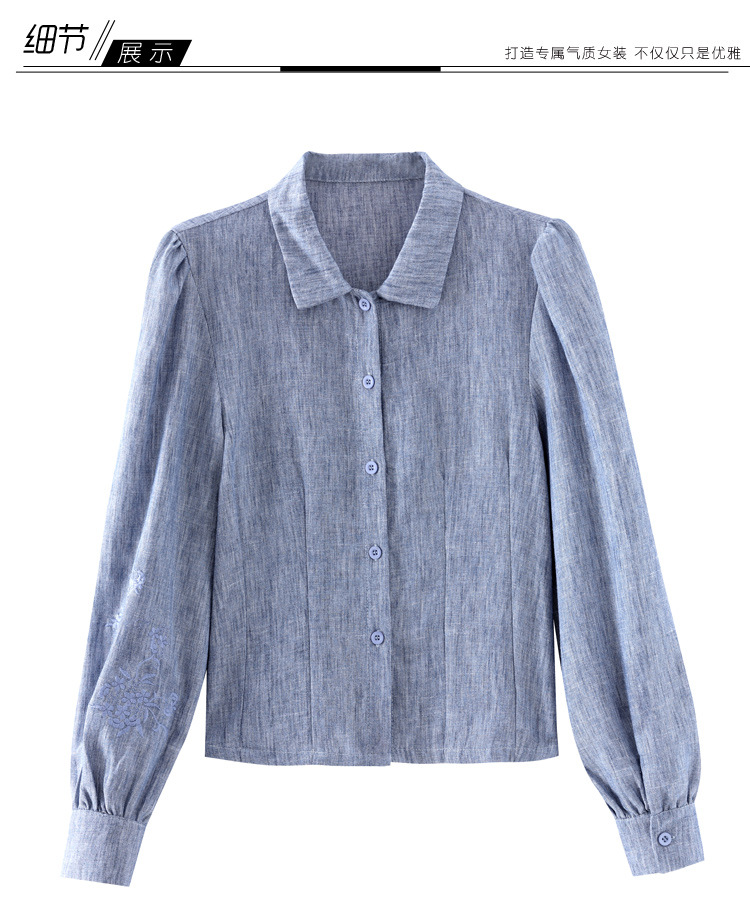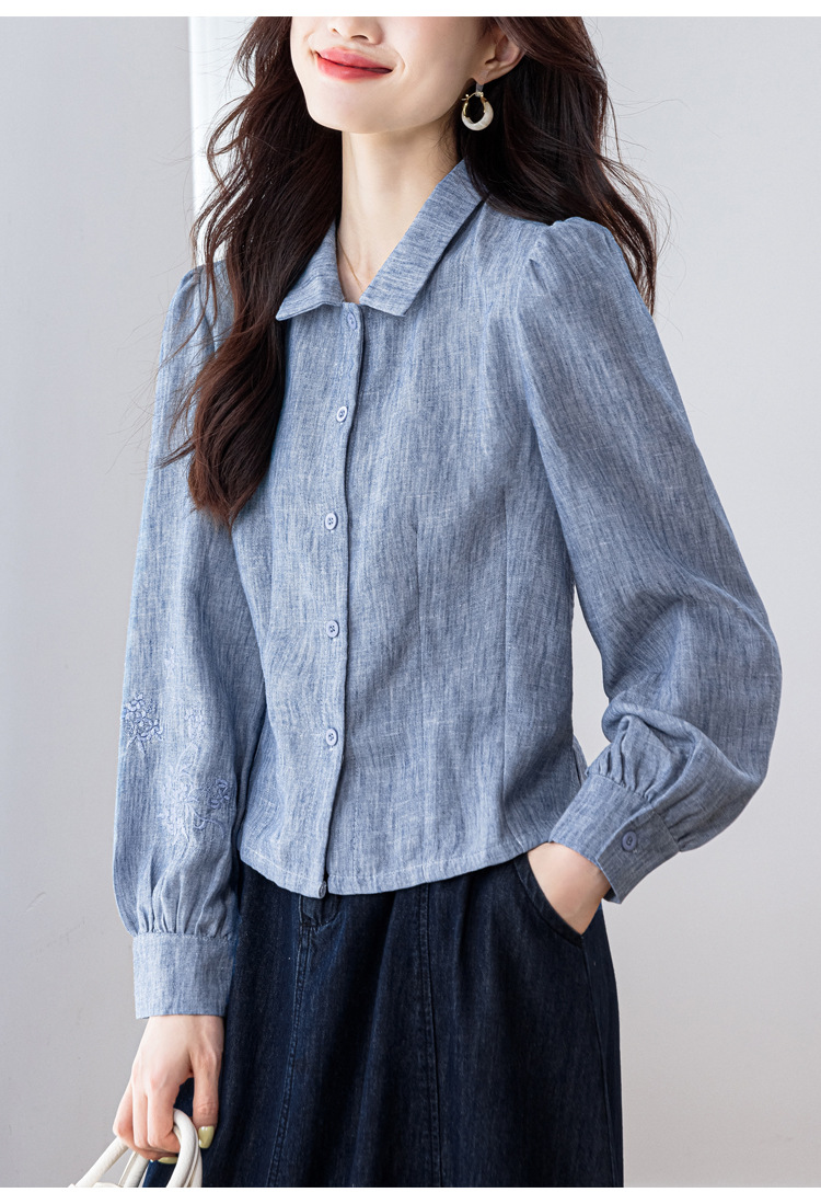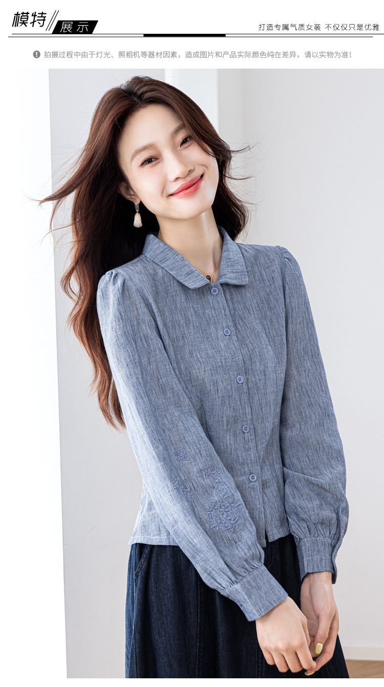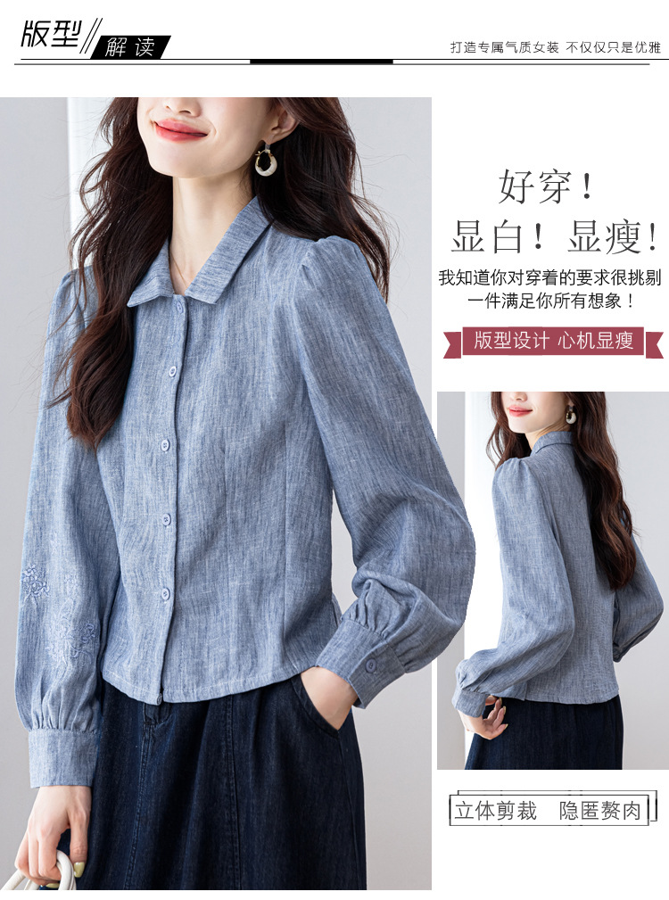 KQL2025年秋季新款亚麻百搭修身长袖刺绣灯笼袖衬衫宽松显瘦上衣批发
