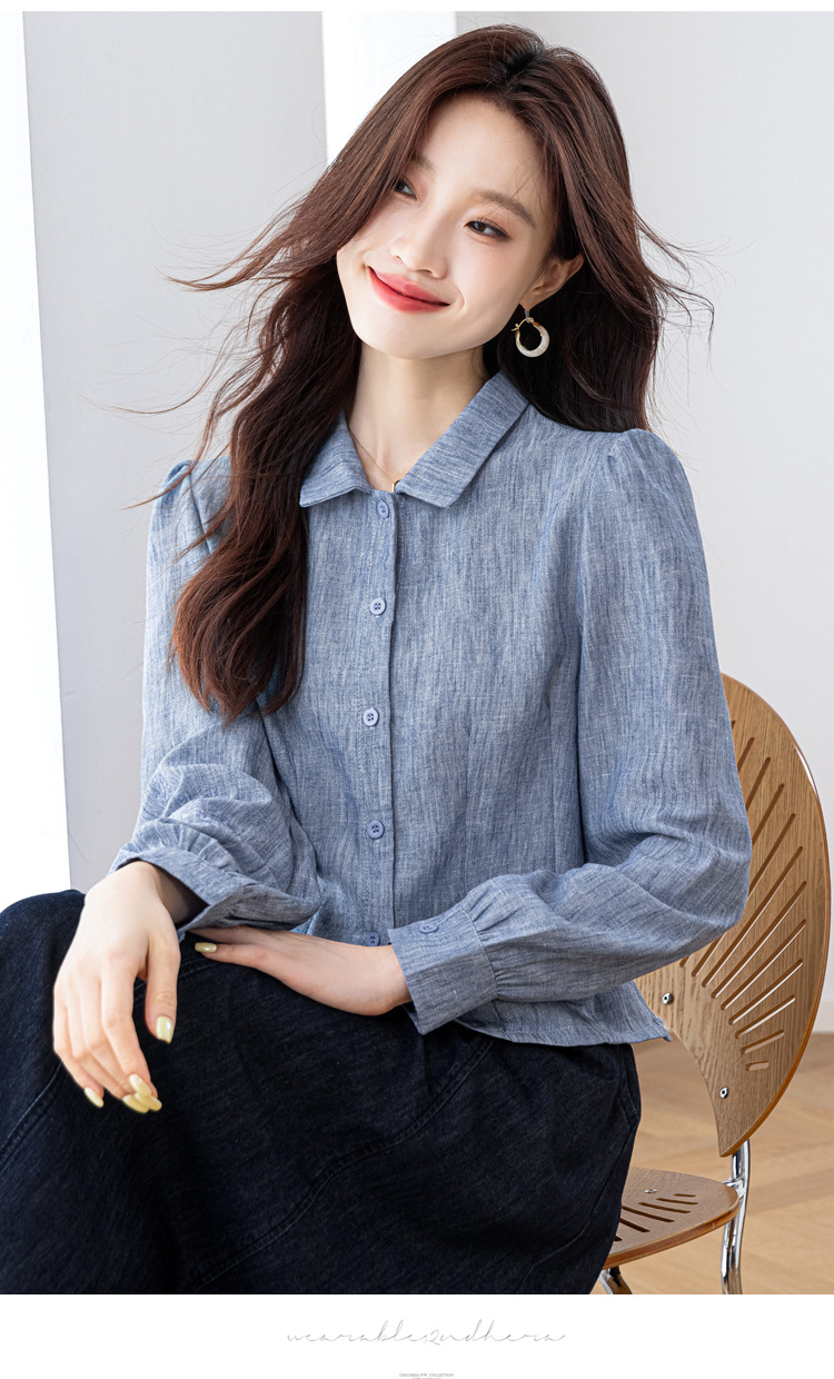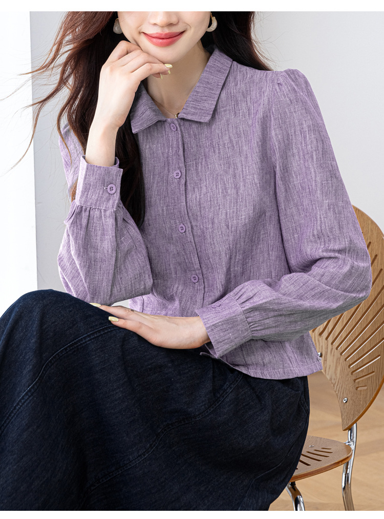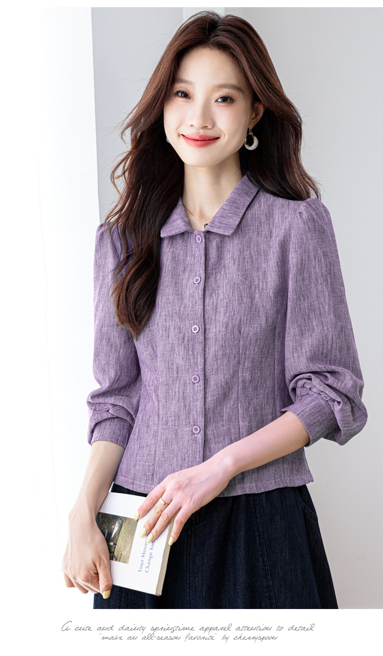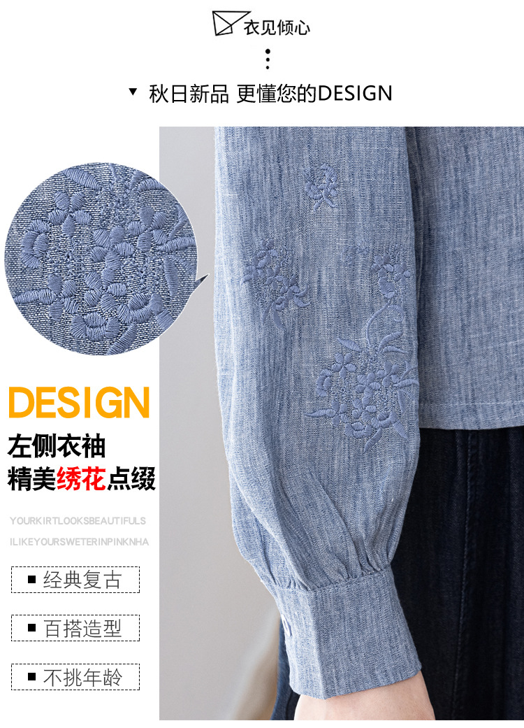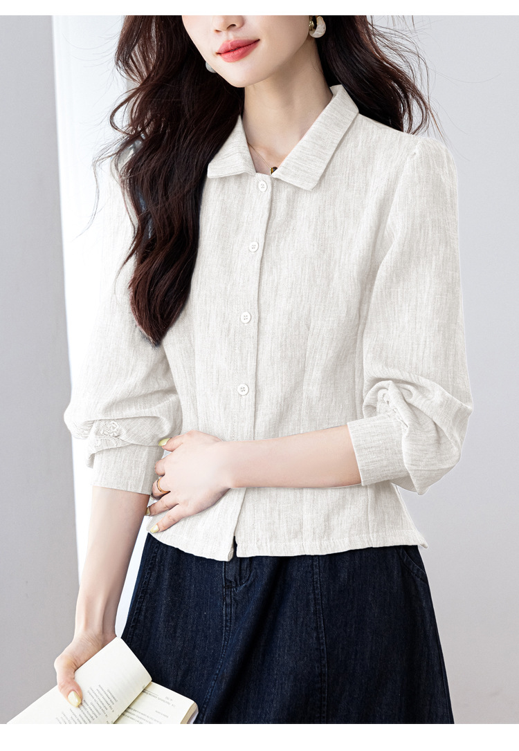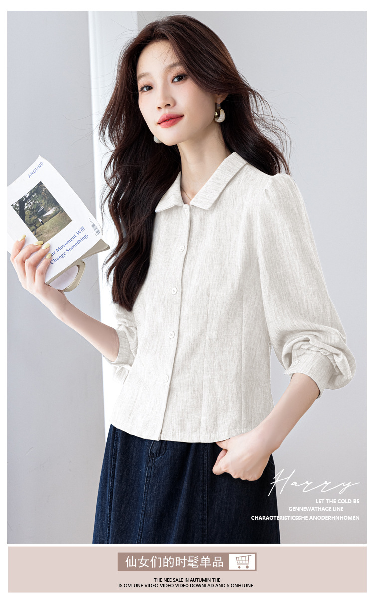 KQL2025年秋季新款亚麻百搭修身长袖刺绣灯笼袖衬衫宽松显瘦上衣批发