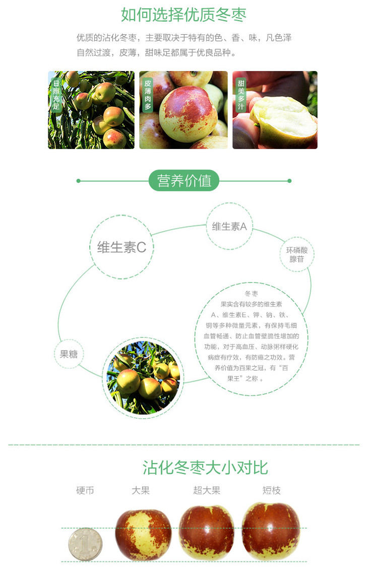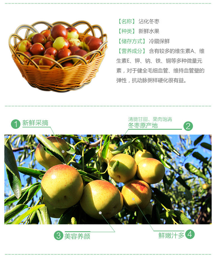 品名:山东•沾化冬枣 规格1:3斤中果彩箱装(约40枚左右/斤;以重量为准) 规格2:5斤中果彩箱装(约40枚左右/斤;以重量为准) 规格3:5斤大果彩箱装(约30枚左右/斤;以重量为准) 规格1:5斤特大果彩箱装(约20枚左右/斤;以重量为准);拍几份发几个包裹,不一定能同时到达,请耐心等待 发货地/产地:山东 包装方式:彩箱装(以实际收货彩箱为准) 物流信息:默认京东快递,不支持指定快递 发货区域:西藏、新疆不发; 物流详情:周六、周日及节假日除外,正常48小时内发货,到货时间约为2~5天,请耐心等待 售后说明:收到货后有质量问题,在24小时内都可以拍照(坏果+快递单面箱子一起拍)上传,申请按坏果比例理赔或联系客服,生鲜性质特殊,不支持7天无理由退换货;因地址错误,手机号联系不上,拒收等造成的损失无法售后,请理解; |