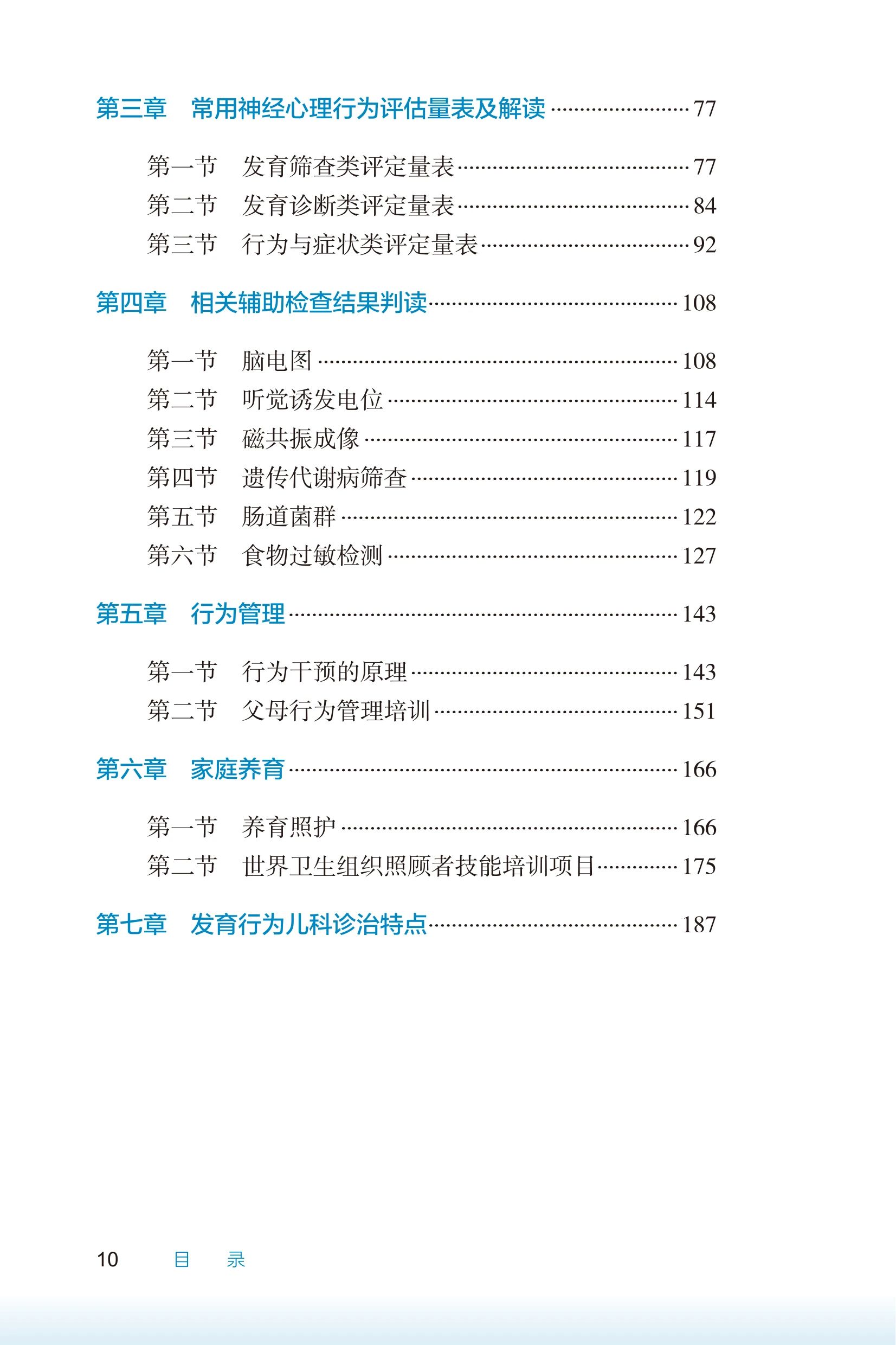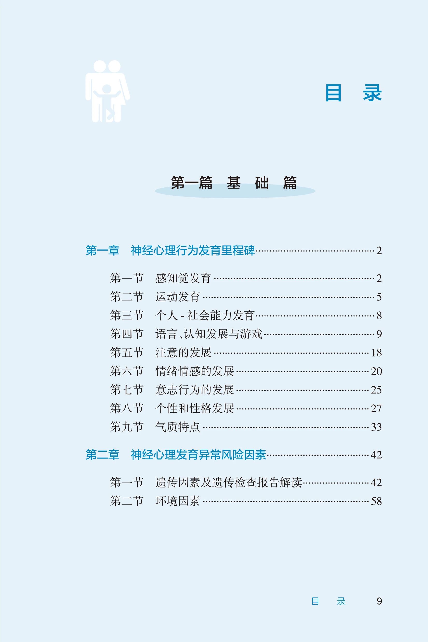 1. 基础篇从使用者的需求角度出发,阐述了神经心理行为发育里程碑、神经心理发育异常风险因素、常用神经心理行为评估量表及解读、相关辅助检查结果判读、行为管理、家庭养育、发育行为儿科诊治特点等神经发育障碍相关基础知识,为读者理解神经发育障碍的诊治奠定了基础,并有助于实现有效的双向转诊。