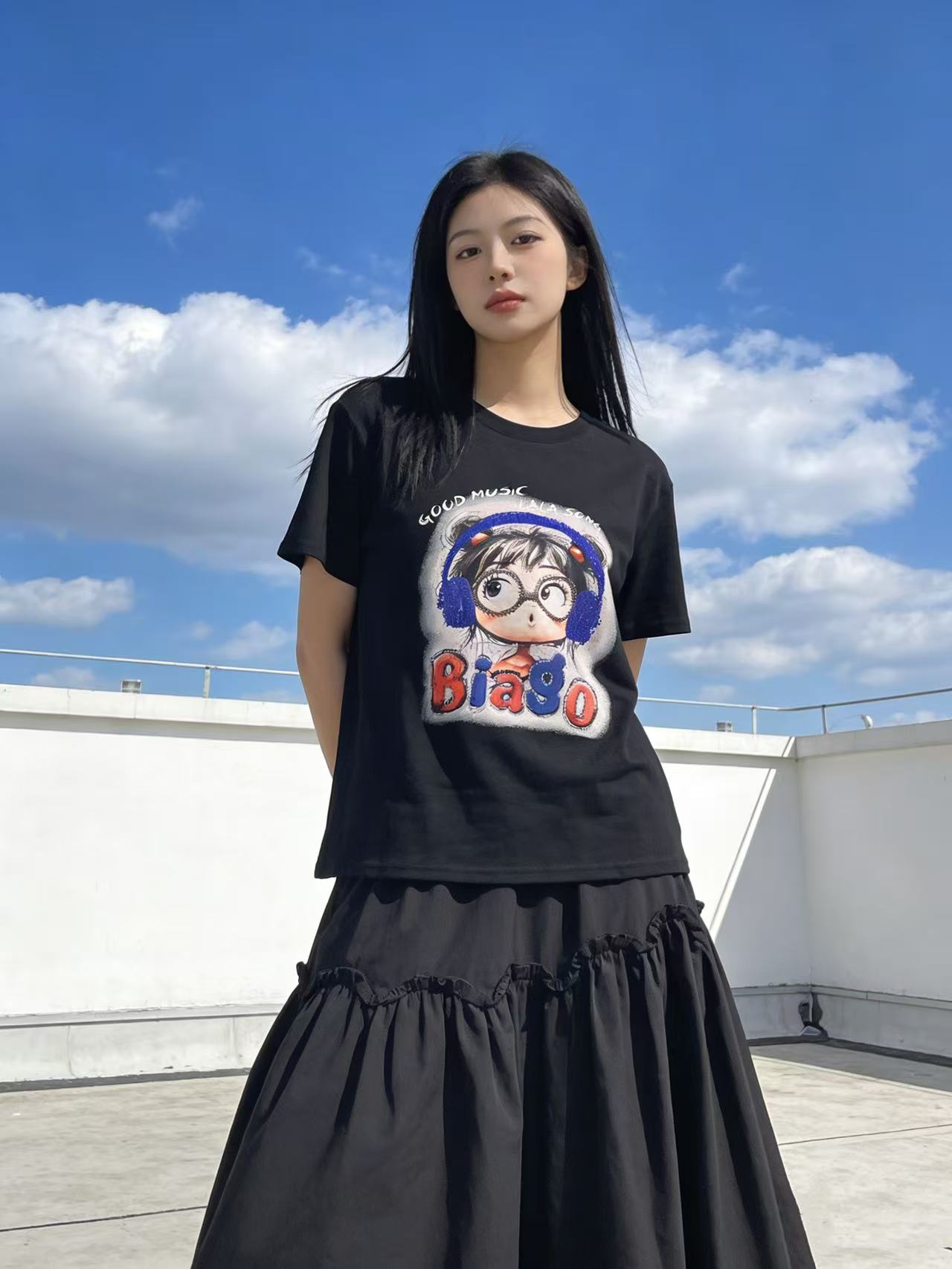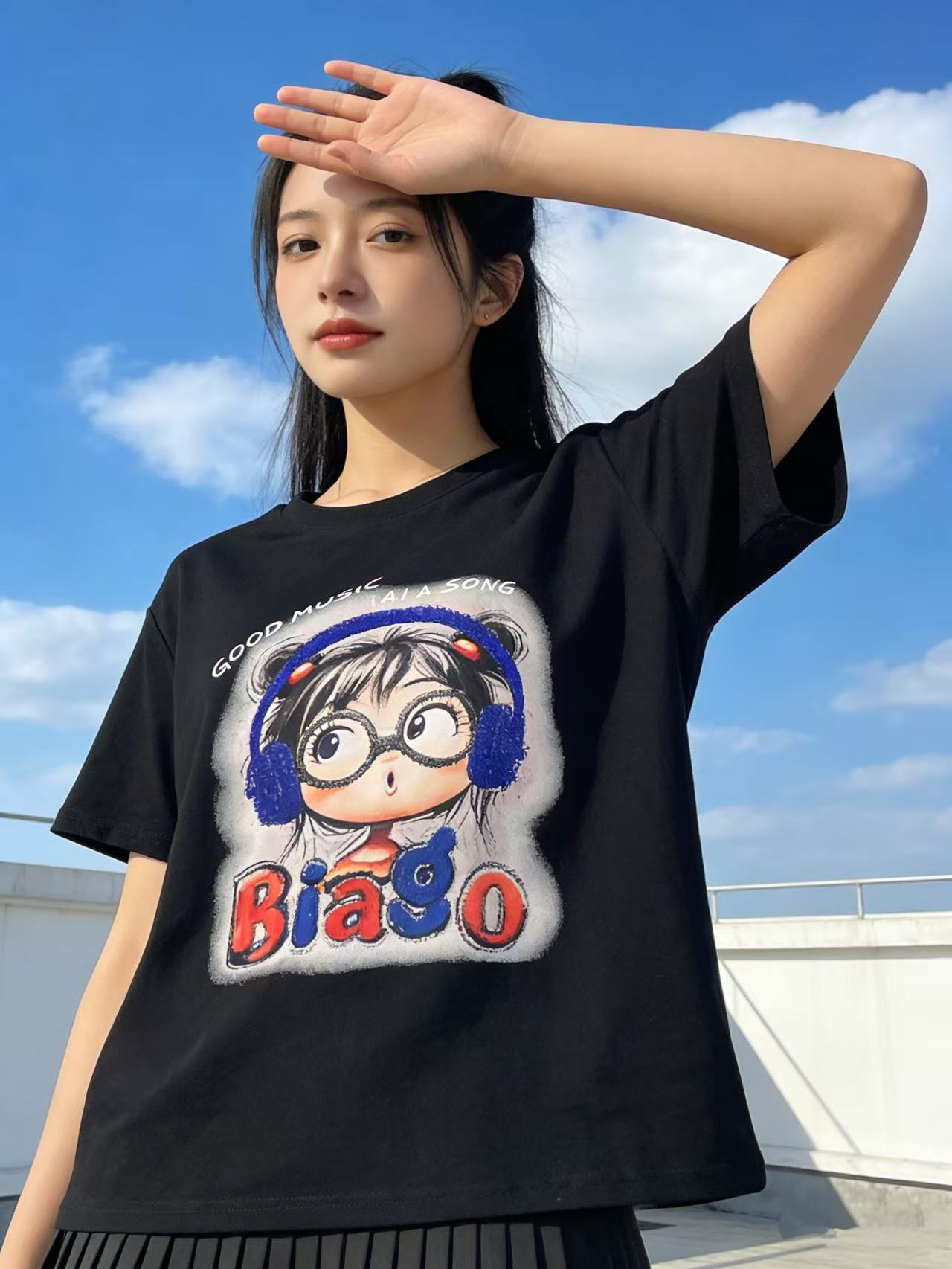 重工/工艺T【自营】卡通➕蓝色耳机烫钻!韩系设计感90棉T恤夏季-喜出