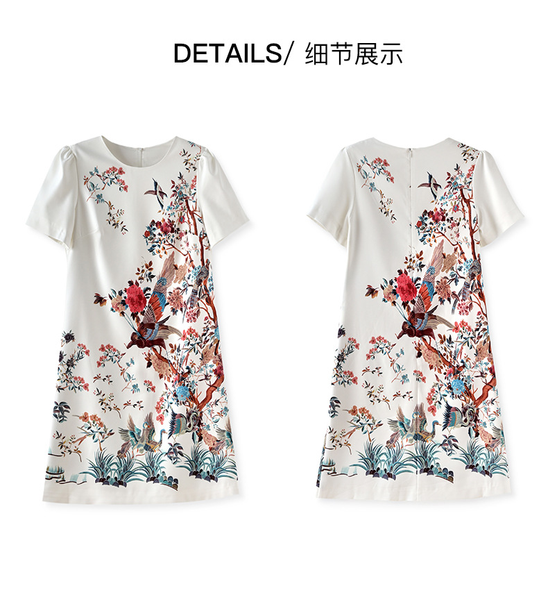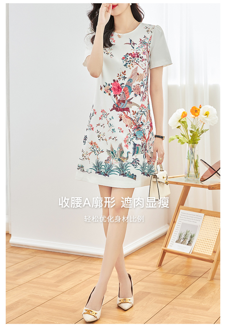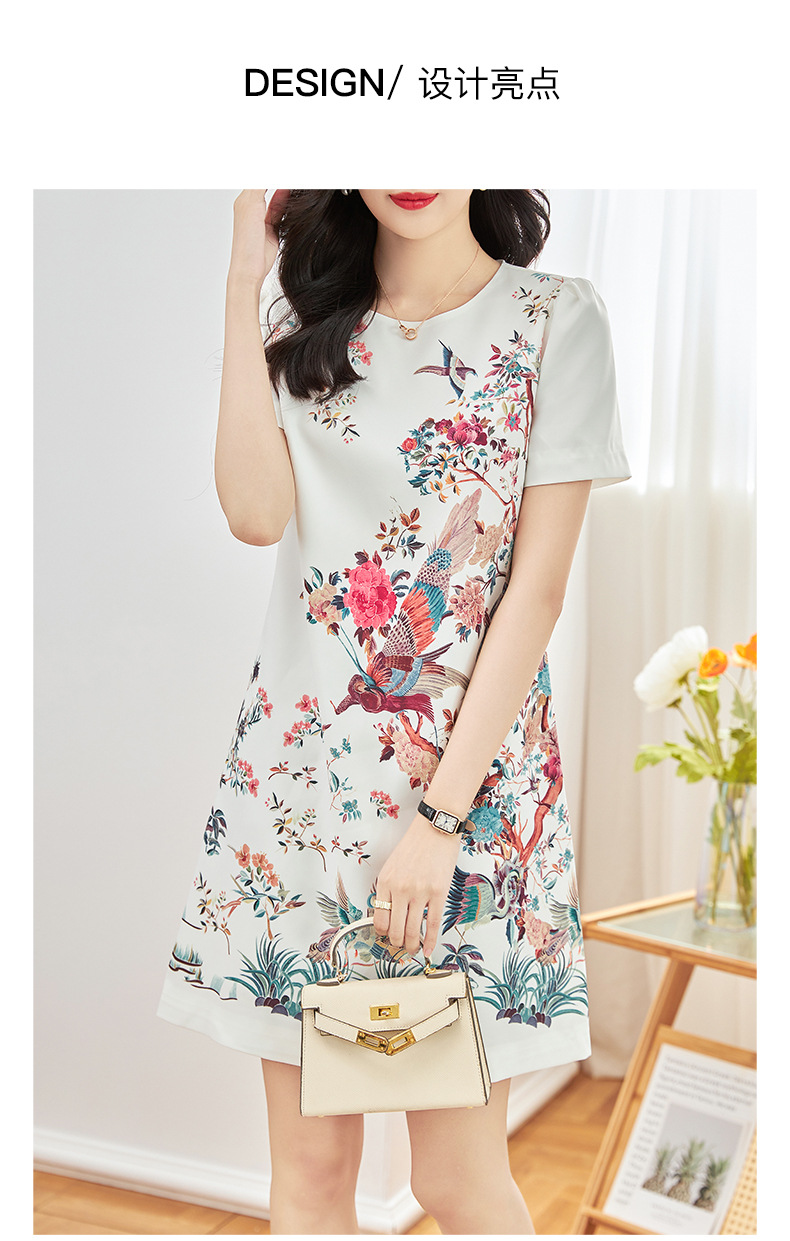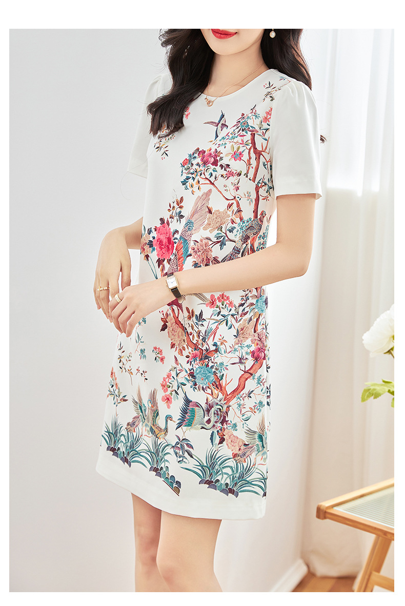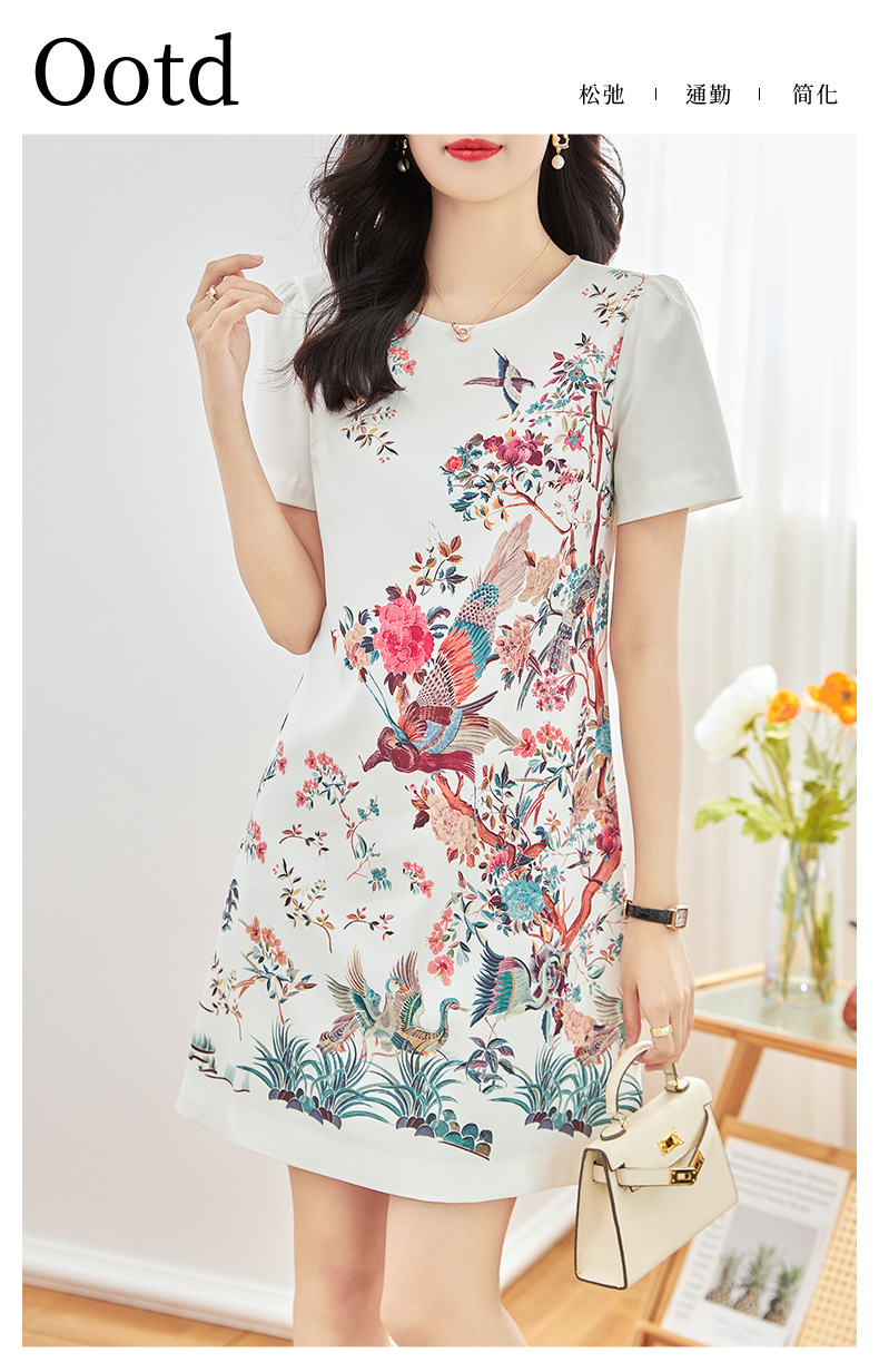宽松遮肉显瘦,定位花鸟印花斜纹雪纺连衣裙WLZD-2312106