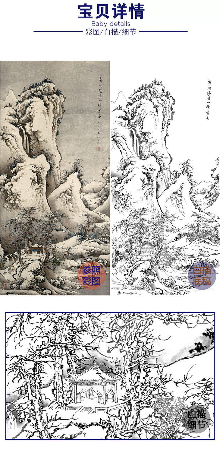 孙天牧竖幅工笔山水白描底稿-《溪山积雪图》-多种白描尺寸可选-ST36
