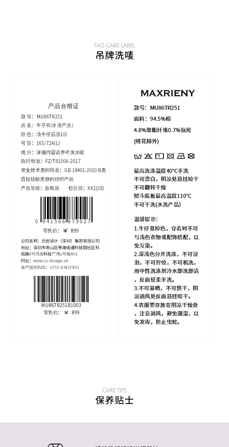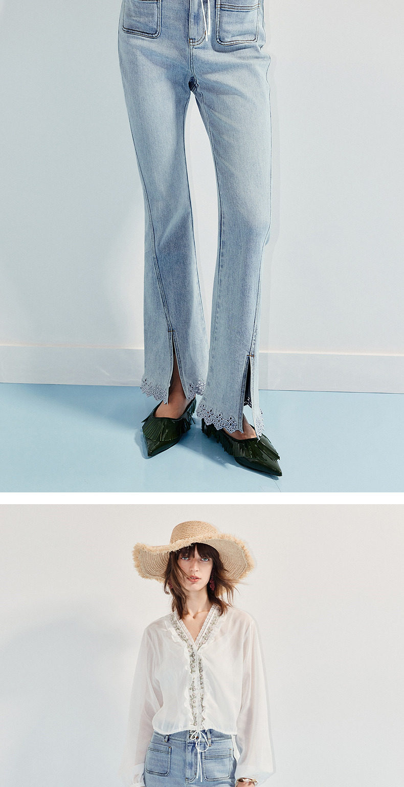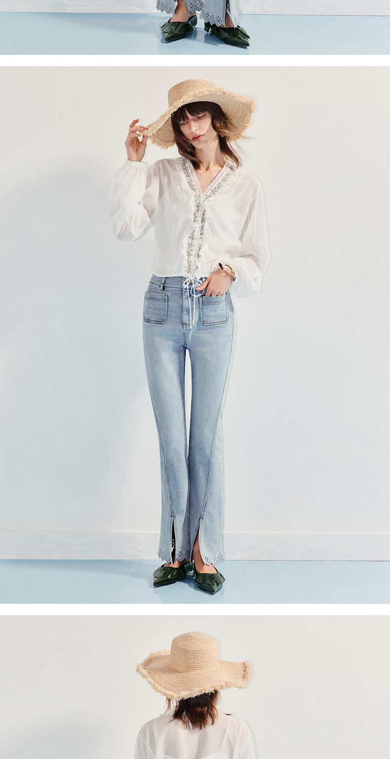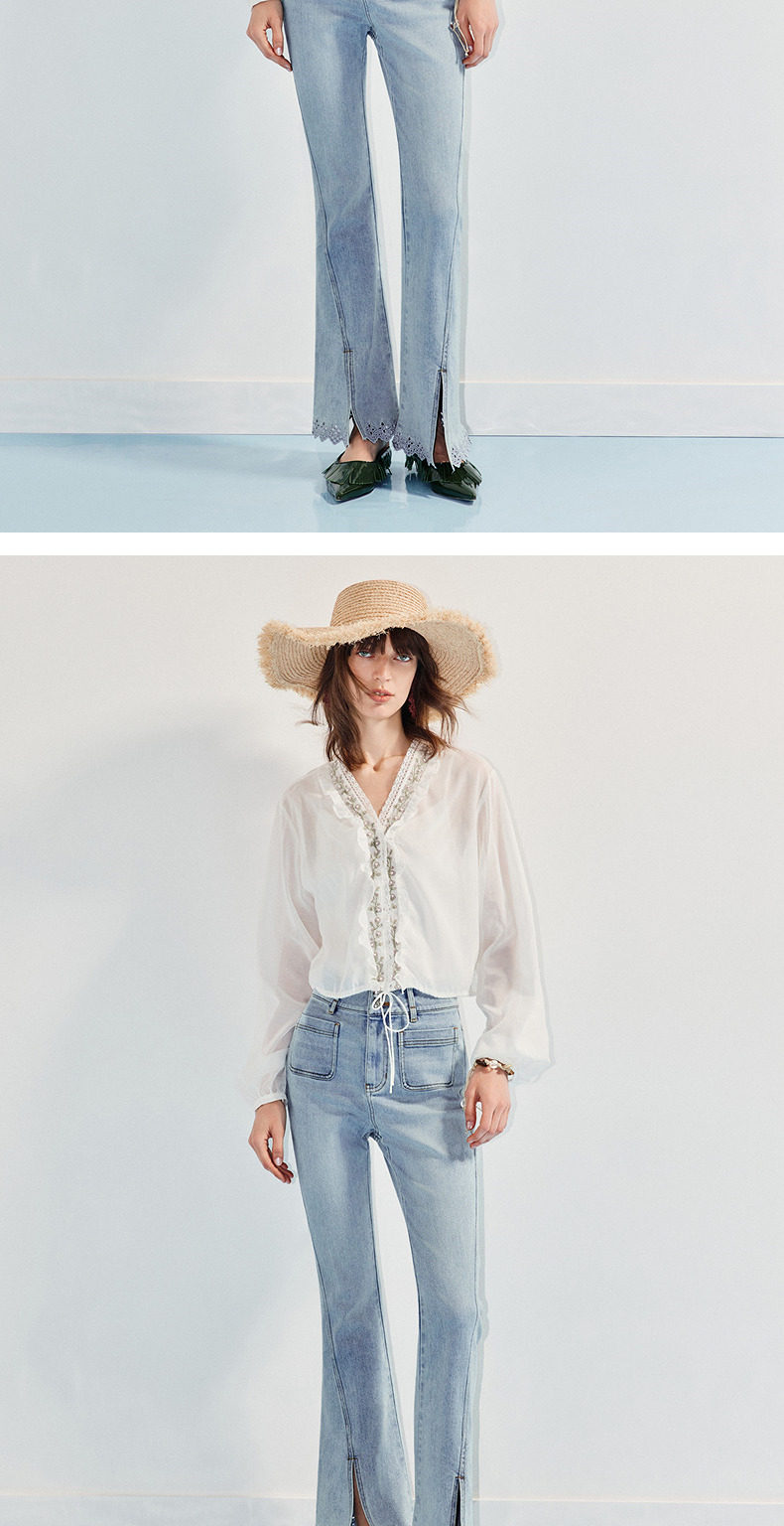 【SGPR】浅牛仔蓝长裤女25夏水洗收腰微喇镂空牛仔裤(货号:MU86TR251)