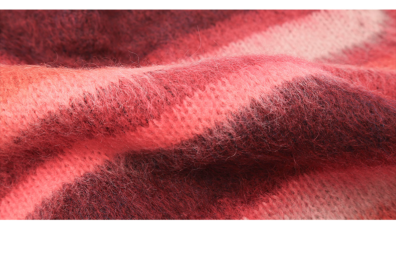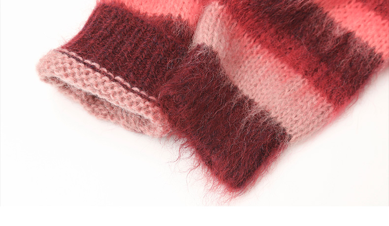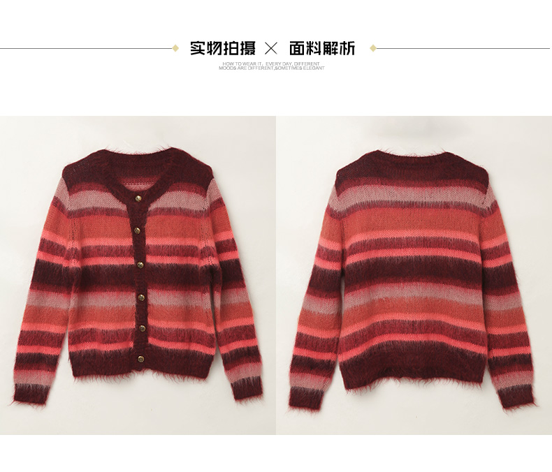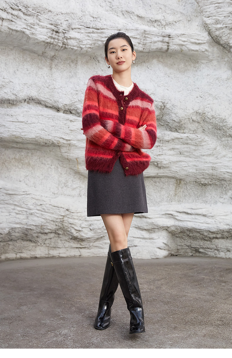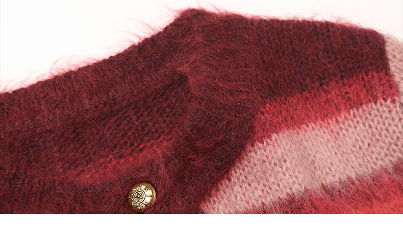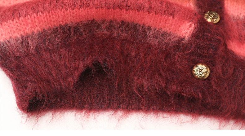 2025 秋冬酒红渐变条纹马海毛开衫女 V 领金属扣宽松毛绒感针织衫 复古氛围感休闲通勤短款毛衣外套