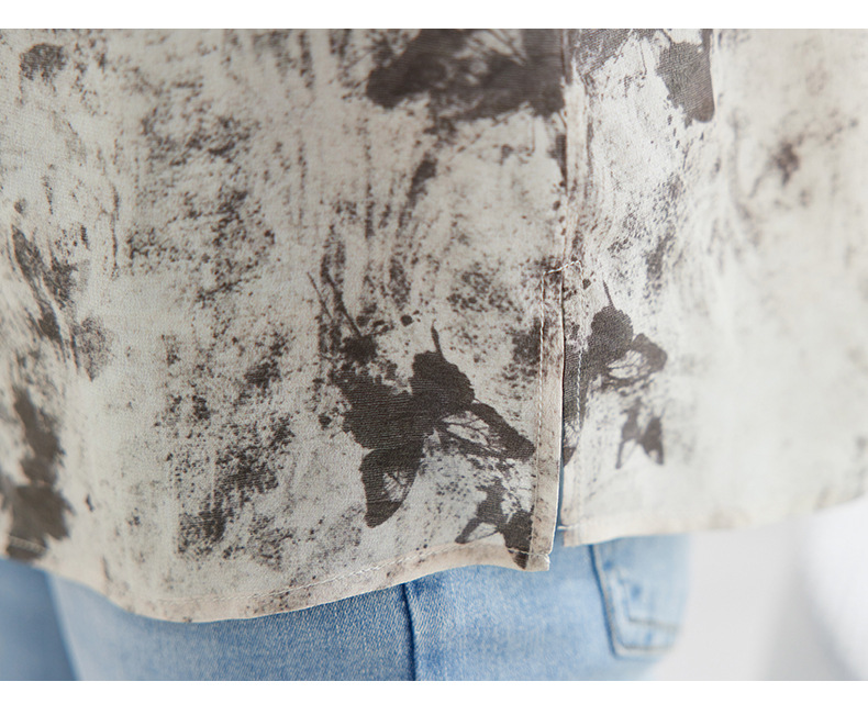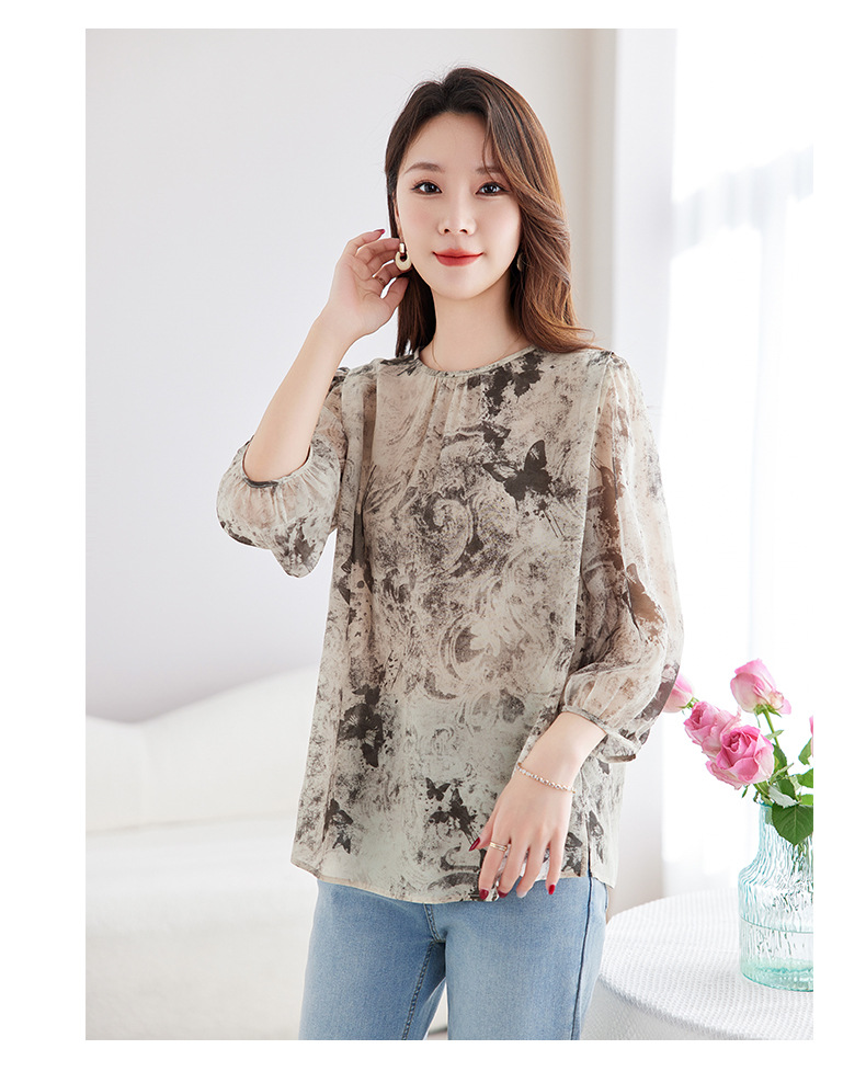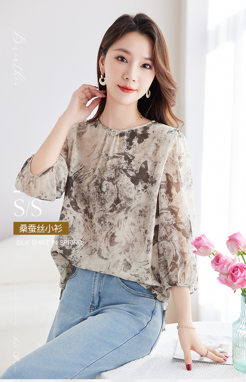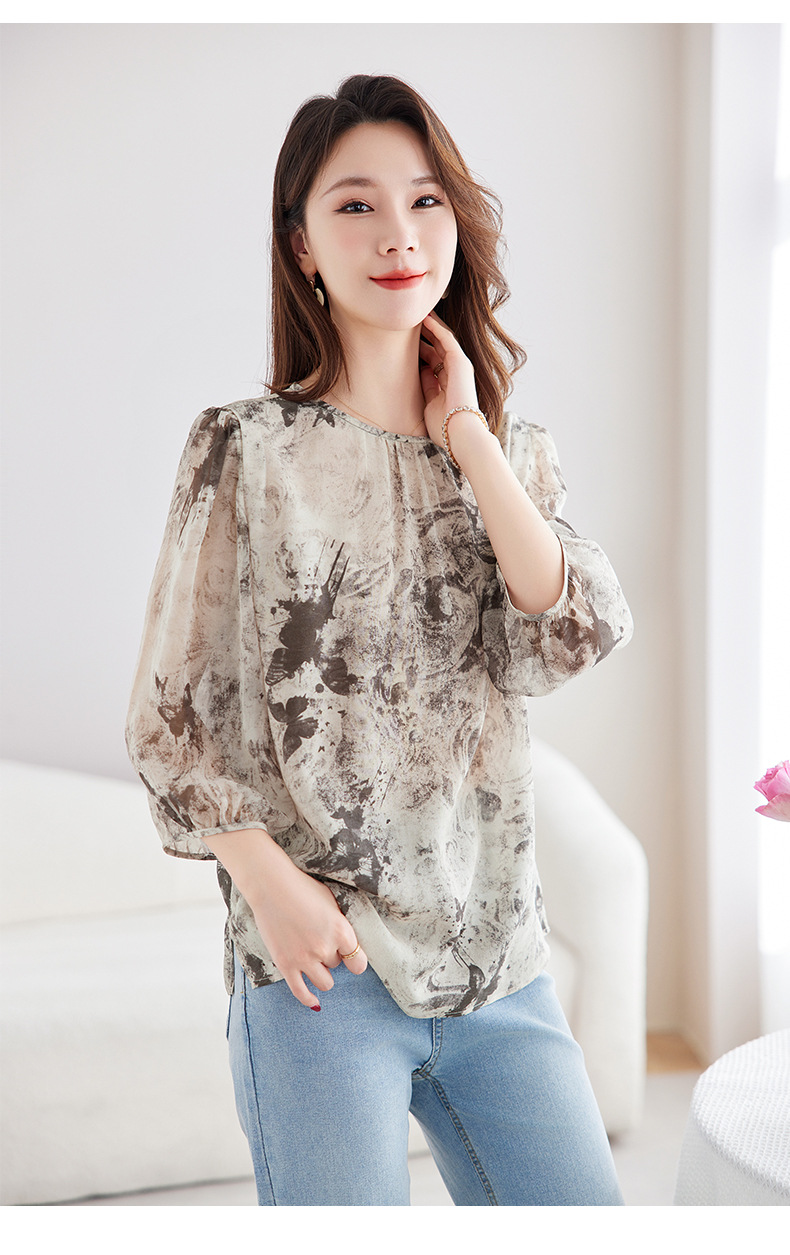 QS-12599728【100%桑蚕丝双绉印花】真丝衬衫女国风灯笼五分袖衬衣女12599728