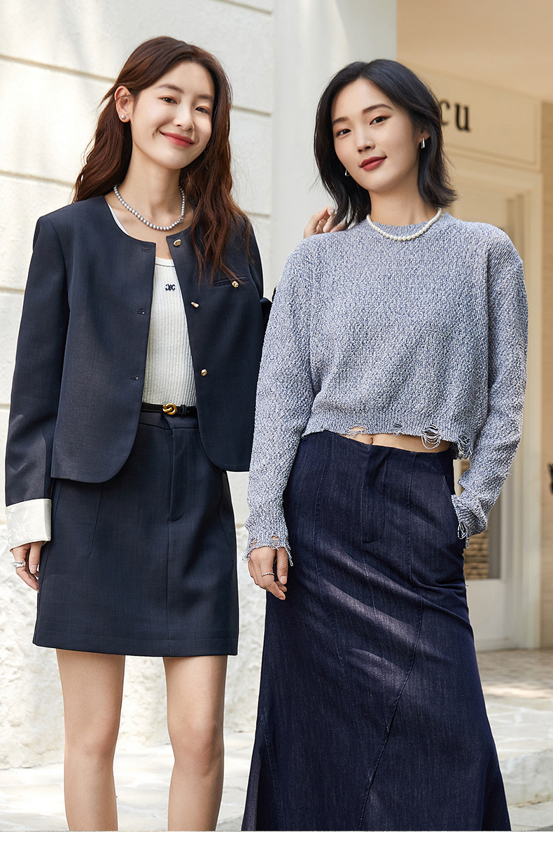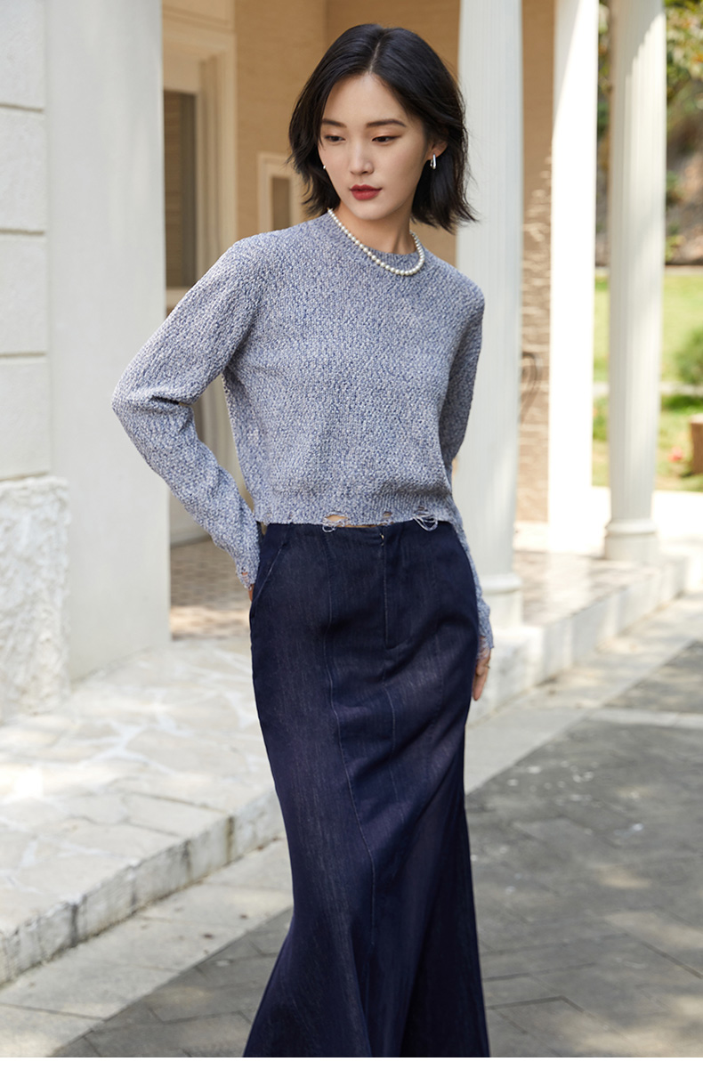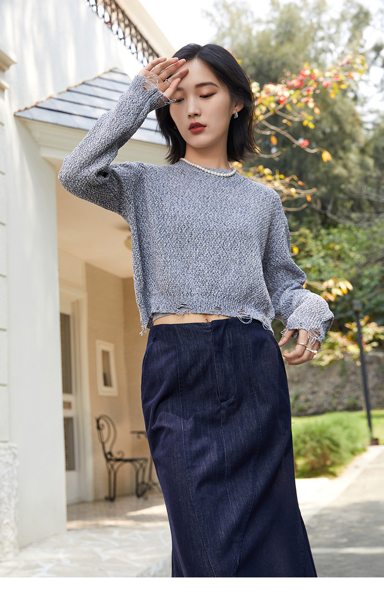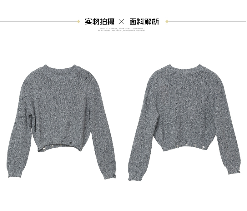 气质款灰色毛边针织衫女 宽松圆领长袖百搭上衣