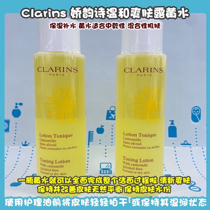 Clarins 娇韵诗温和爽肤露黄水👍🏻保湿补水,黃水適合中乾性、混合性肌膚😘。一瓶黃水就可以全面完成整个洁面过程啦,清新爽肤🍃,保持并改善皮肤天然平衡‼️保持皮肤水份💦,软化并舒缓皮肤。使面部轮廓更柔和。🌟使用方法:早晚使用洁面乳洁面后,使用两块化妆棉浸醮爽肤水,轻柔抚擦面部与颈部。[机智]使用护理油前将皮肤轻轻拍干,或保持其湿润状态。也可在使用去角质产品或进行面膜护理后使用本产品。