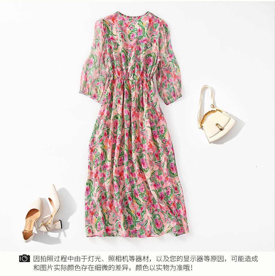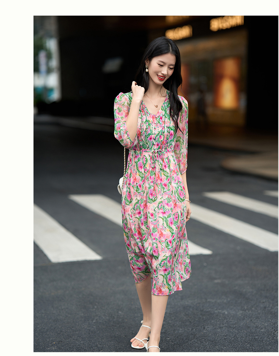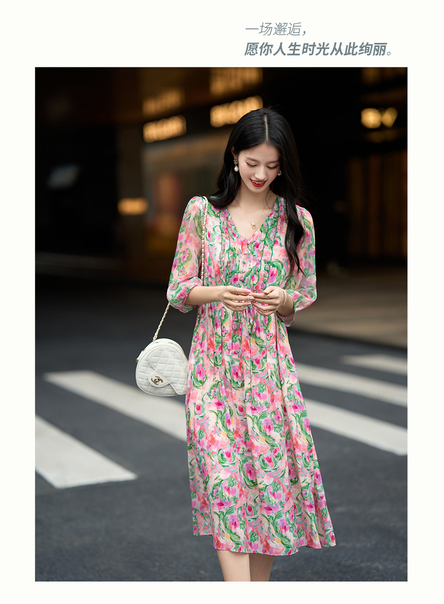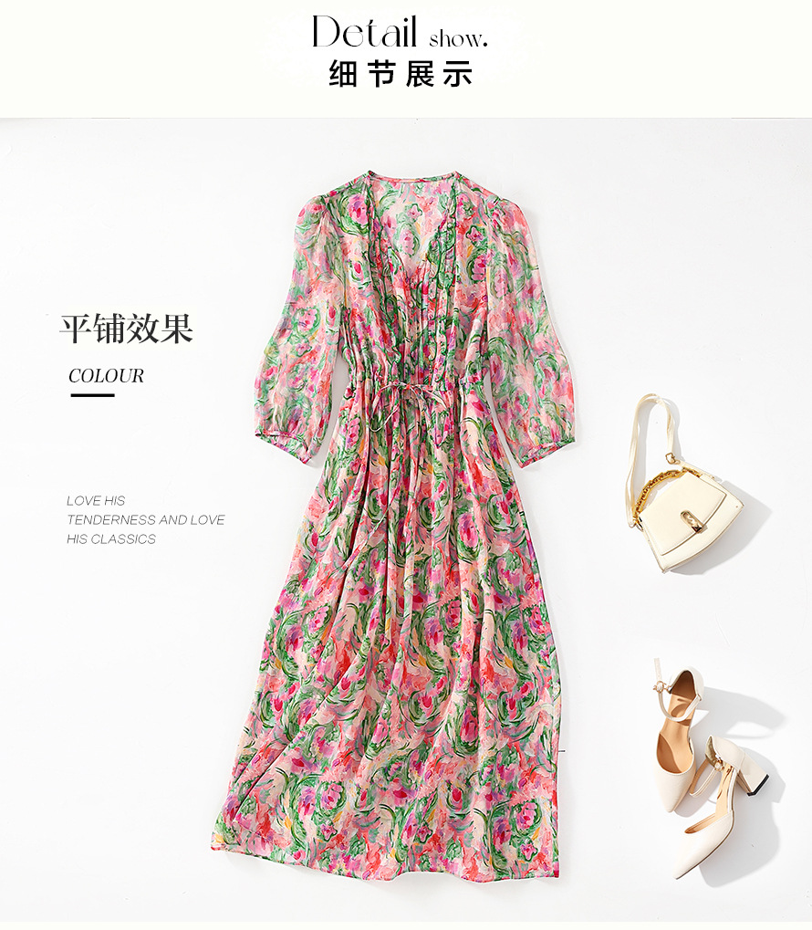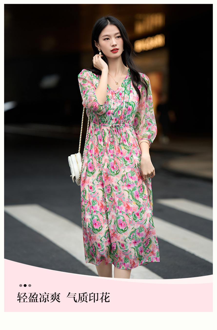 丁摩 法式V领收腰花边抽绳印花真丝连衣裙90476
