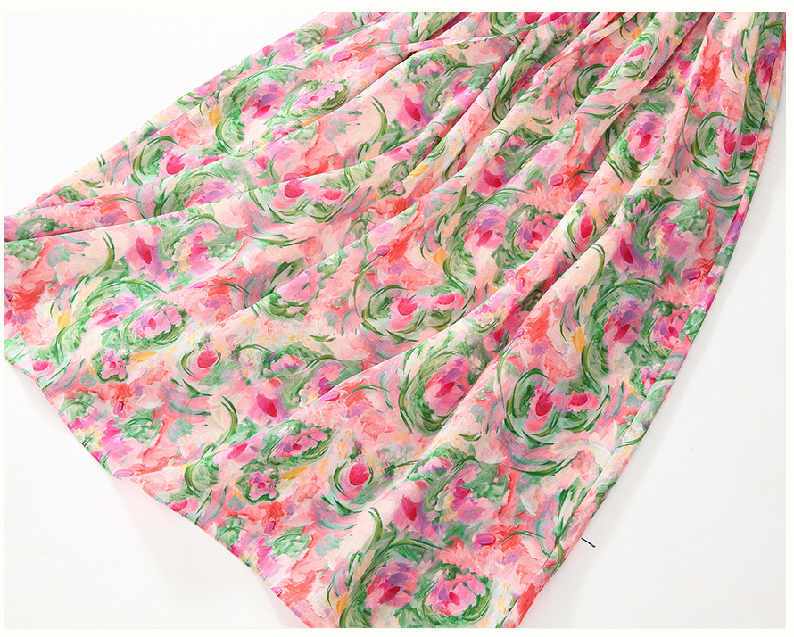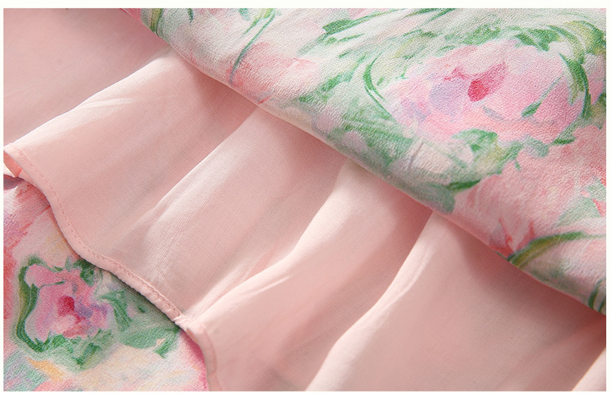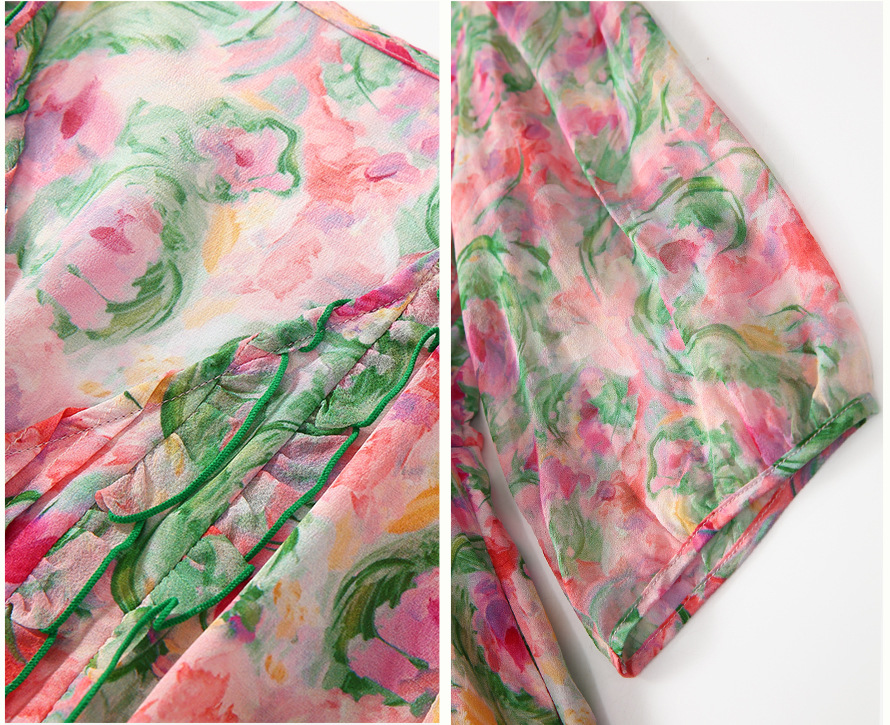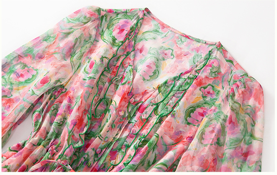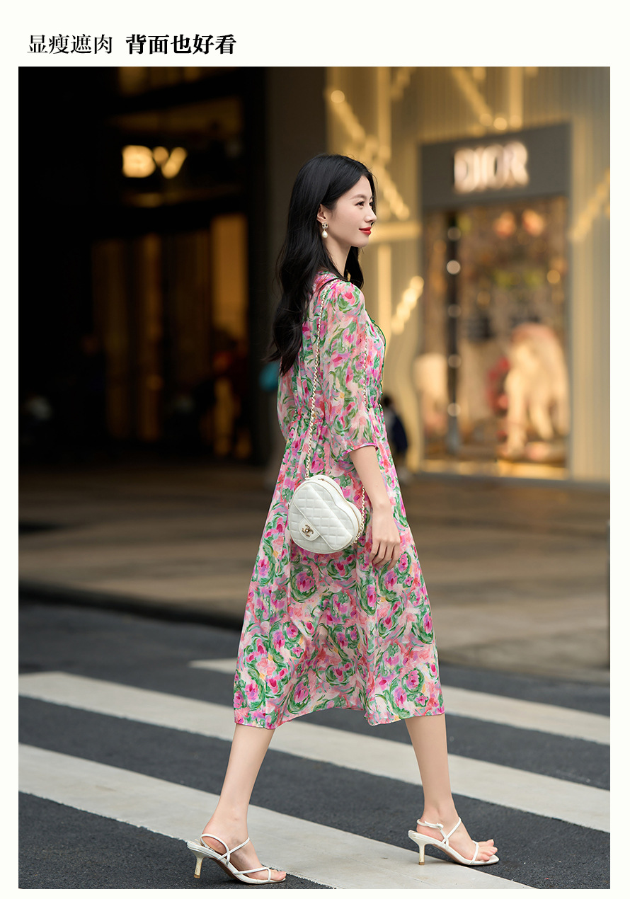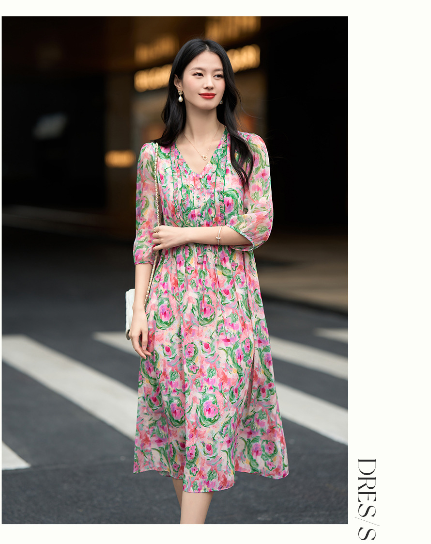 丁摩 法式V领收腰花边抽绳印花真丝连衣裙90476