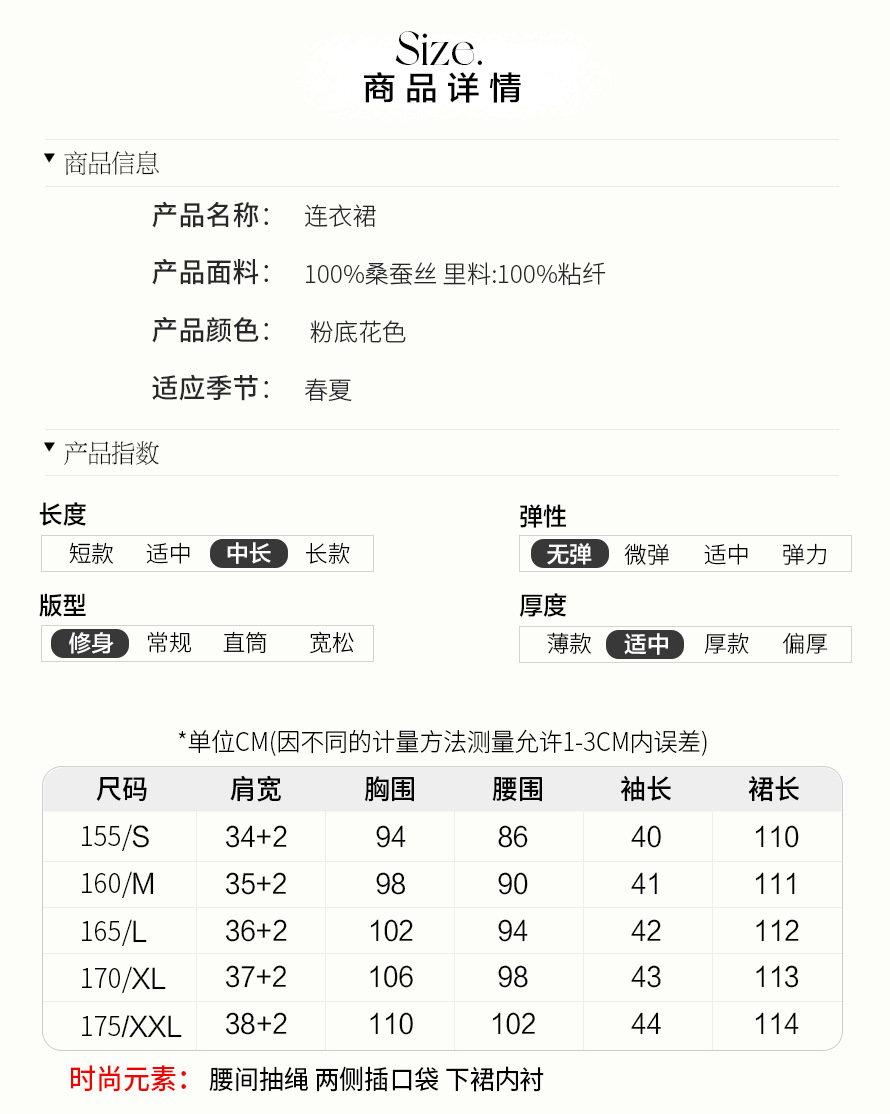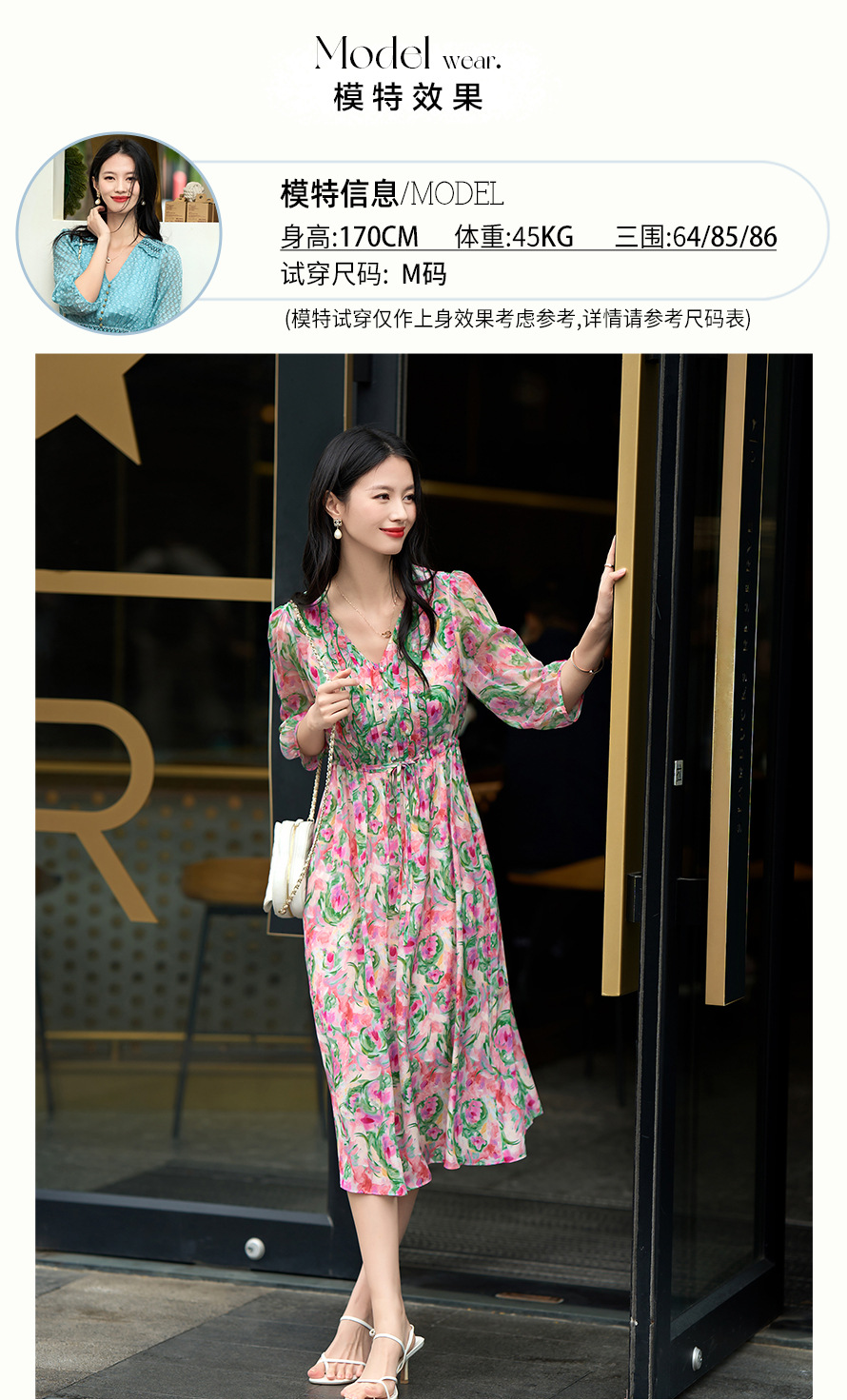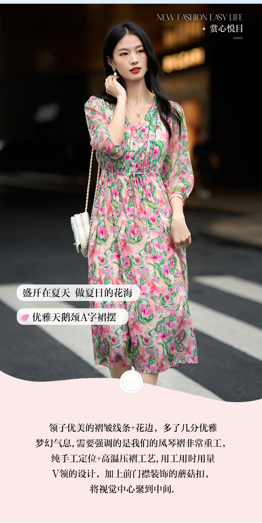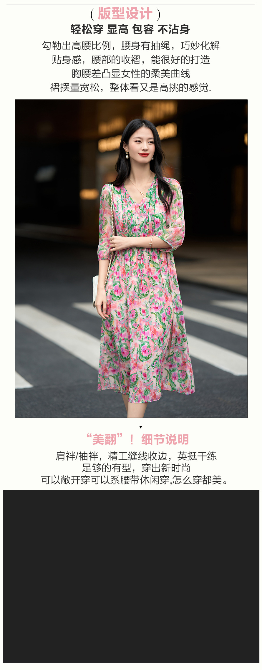 丁摩 法式V领收腰花边抽绳印花真丝连衣裙90476